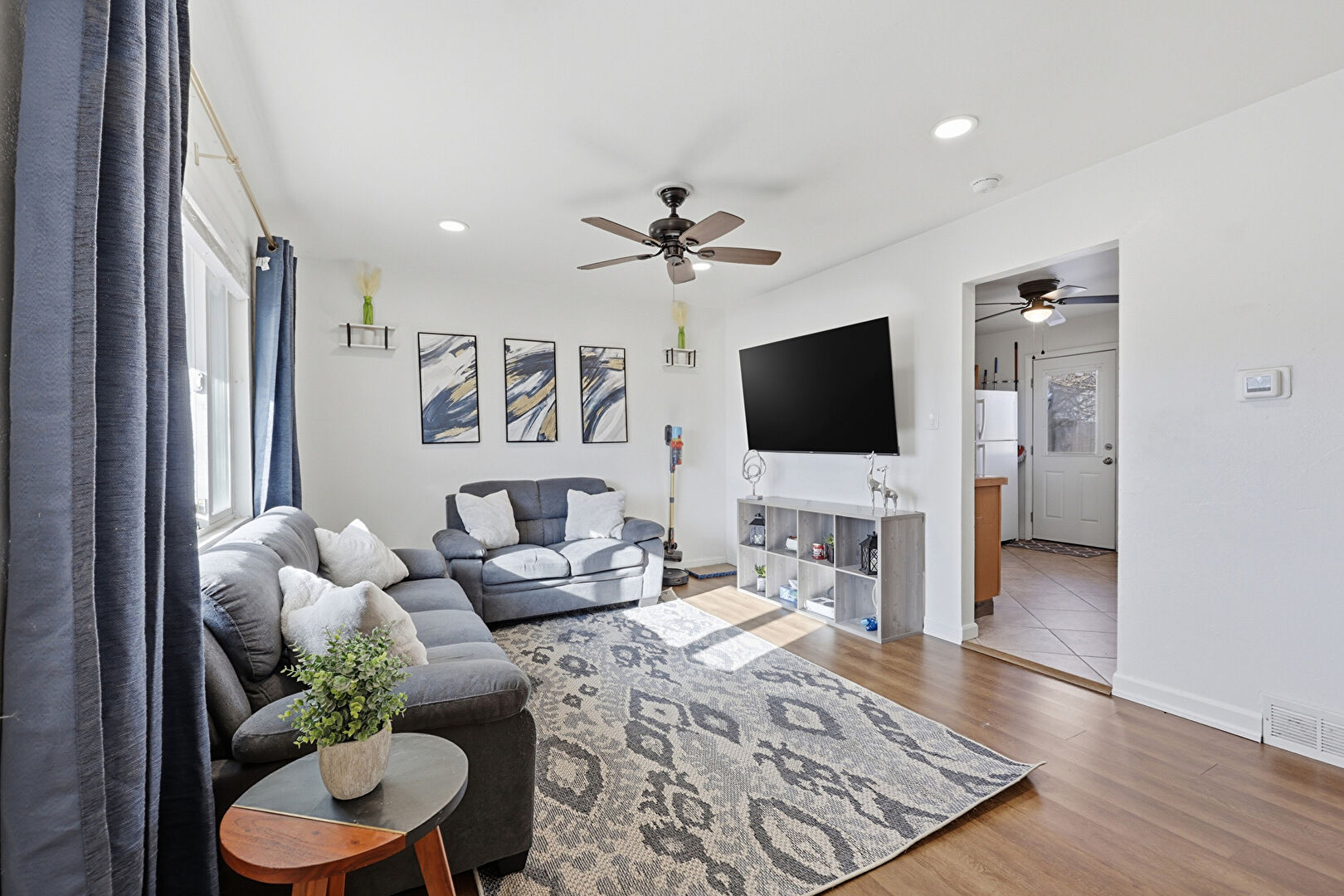 Baseboards Wall, Ceiling Fan, Drywall, Natural Light, Recessed Lighting, Wood Finish Floor, Ceiling Fan, Vent