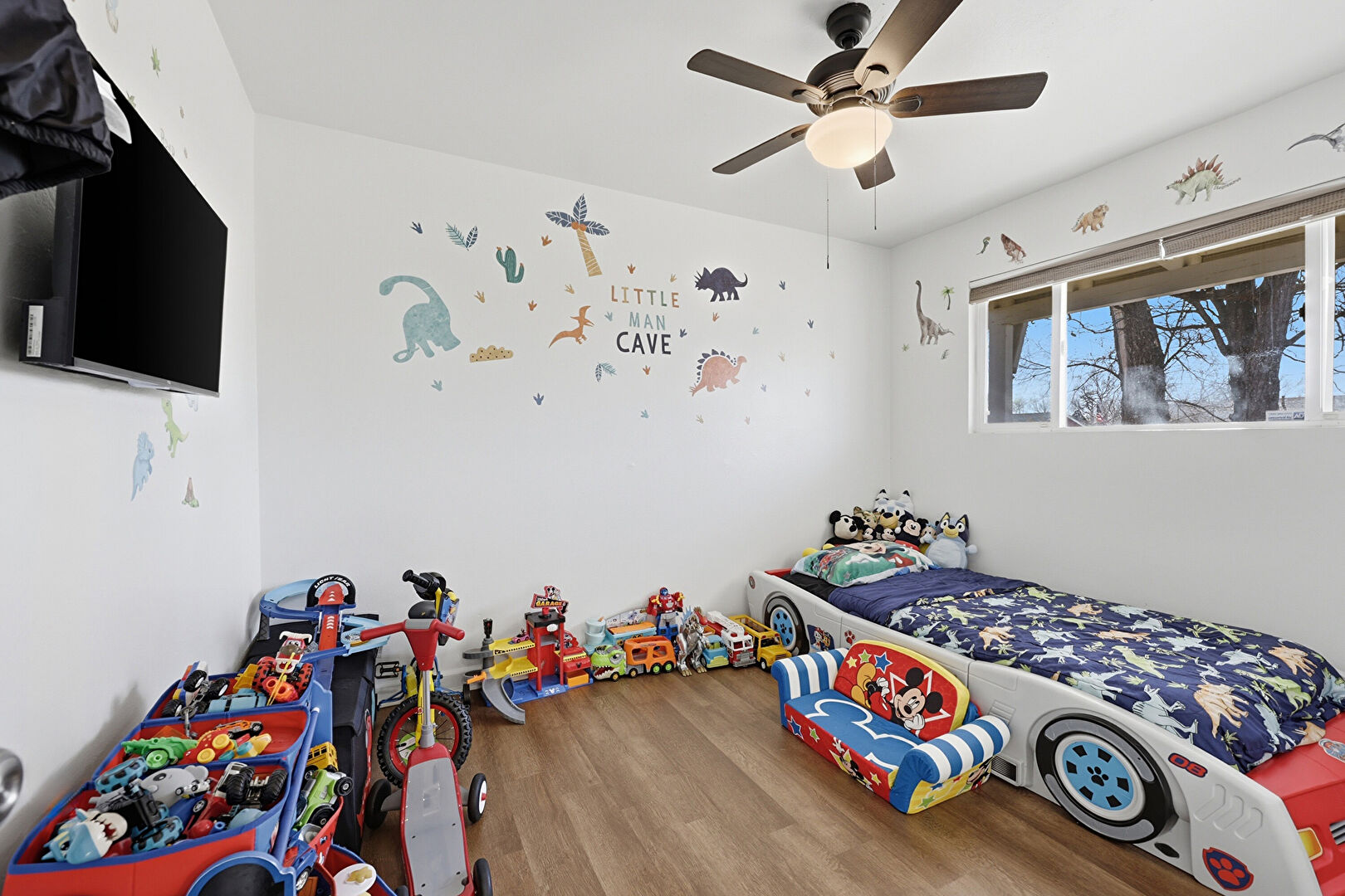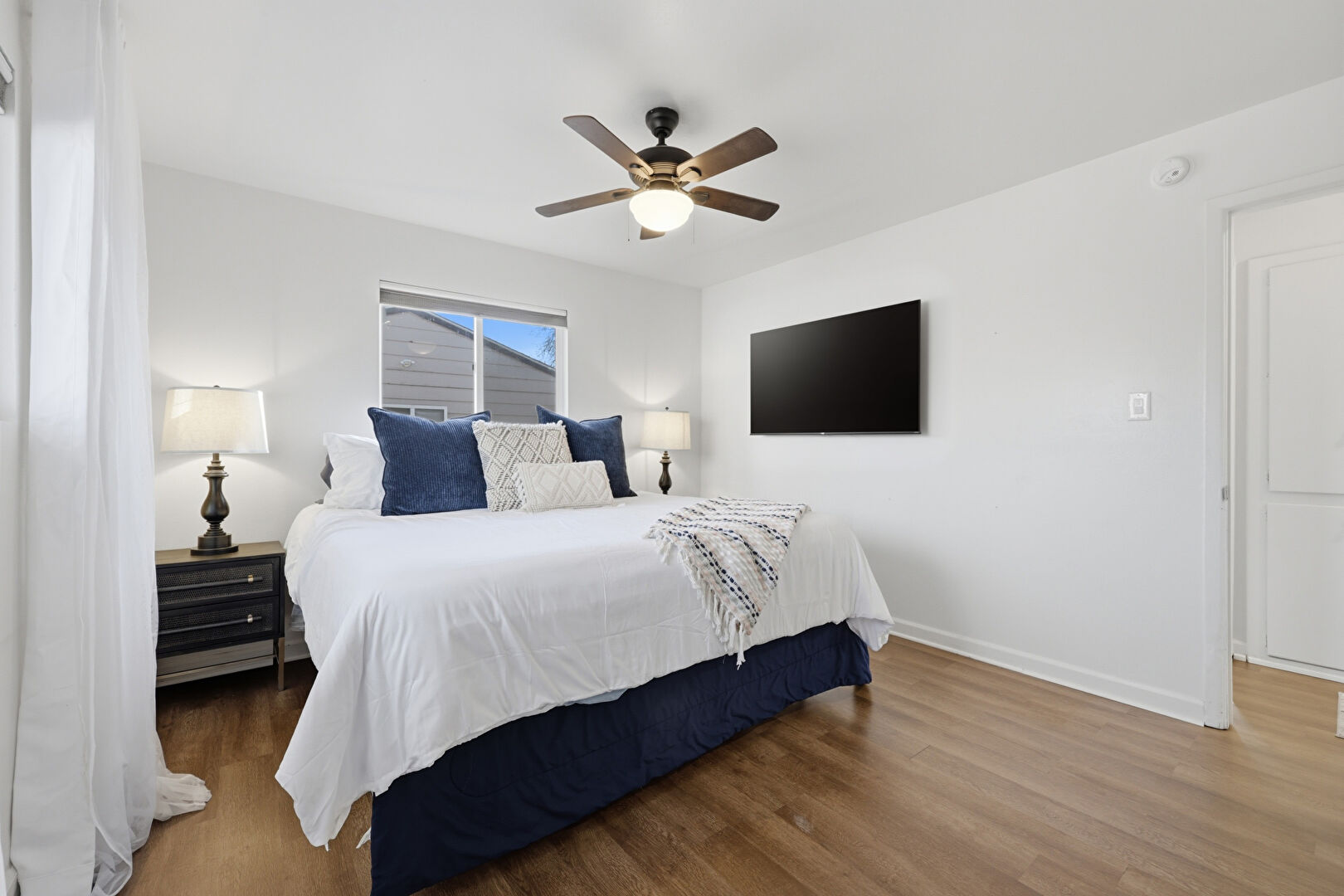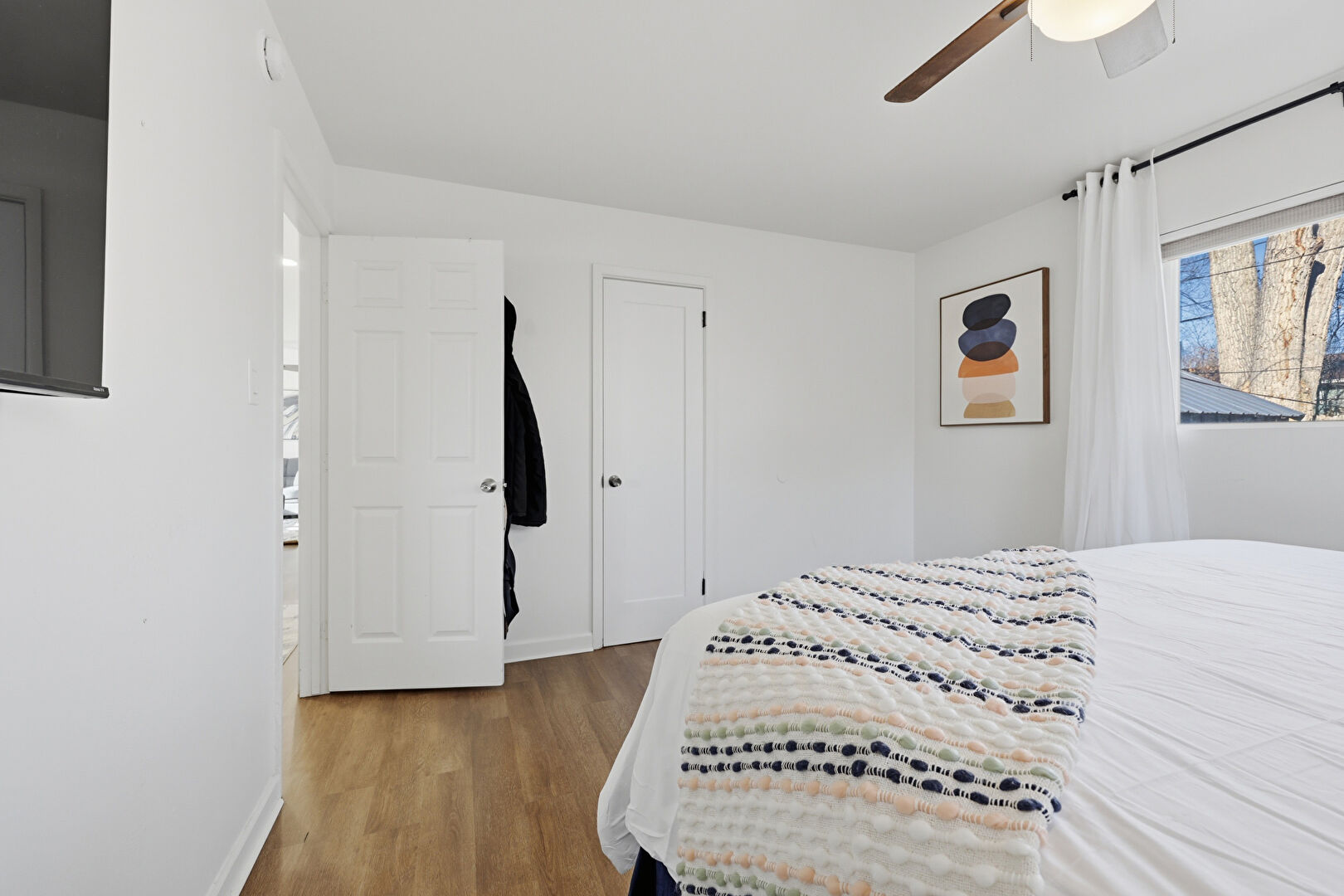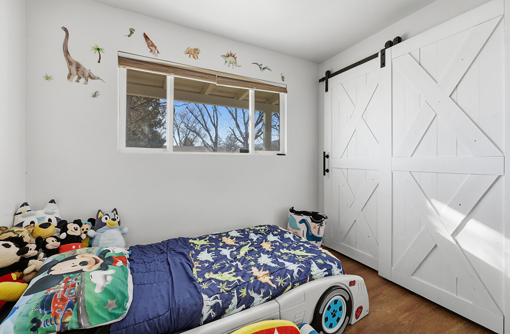 Barn Door, Baseboards Wall, Ceiling Fan, Drywall, Natural Light, Smoke Carbon Monoxide Detector, Wood Finish Floor, Ceiling Fan, Drywall, Wood Finish Floor
