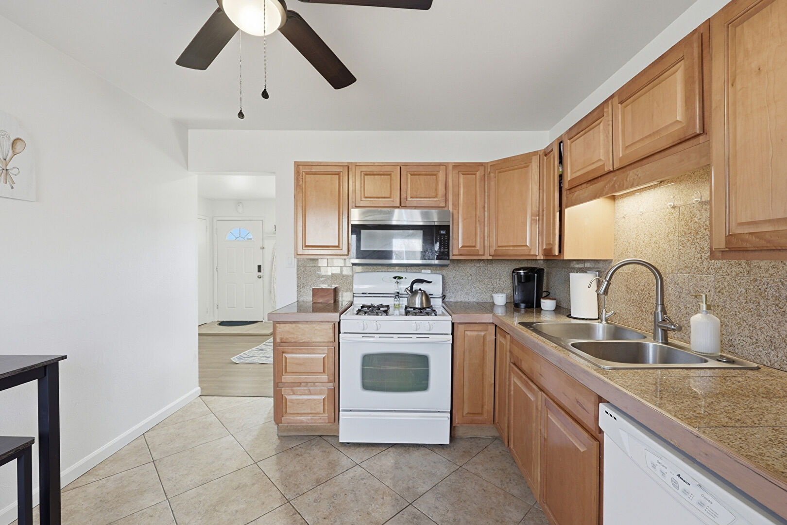 Baseboards Wall, Ceiling Fan, Drywall, Medium Brown Cabinets, Natural Light, Raised Cabinets, Stone Tile Countertops, Tile Floor, Vent, Baseboards Wall, Ceiling Fan