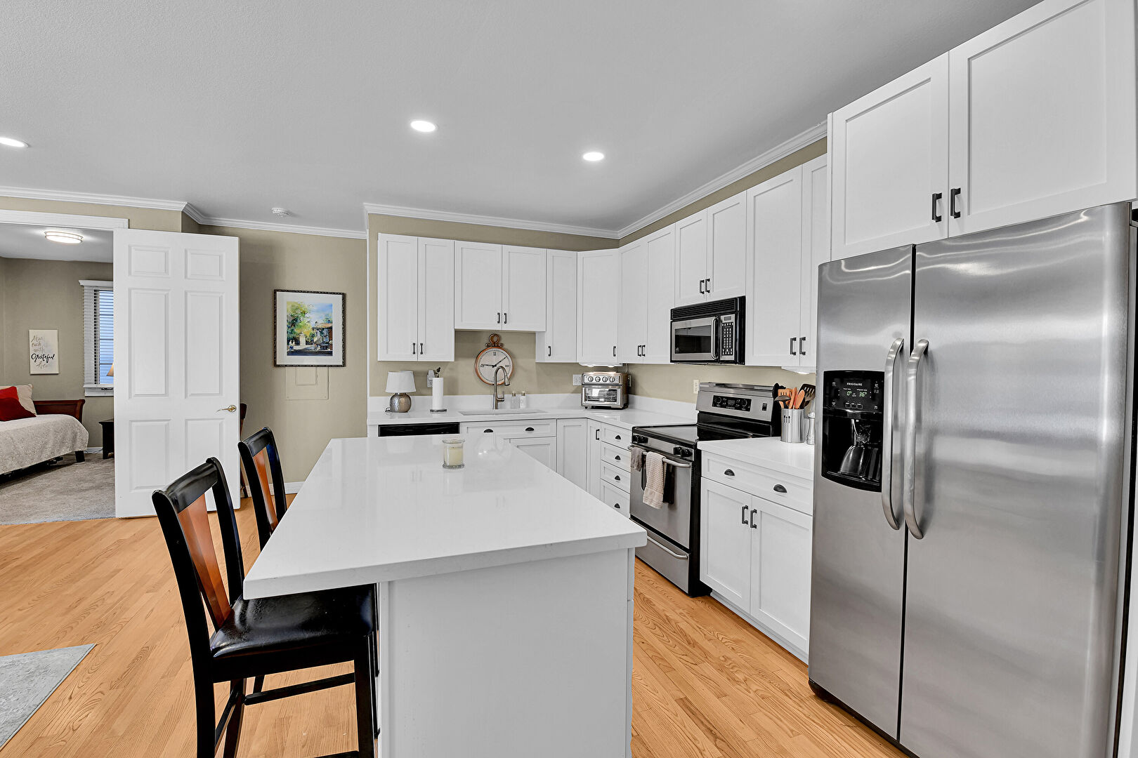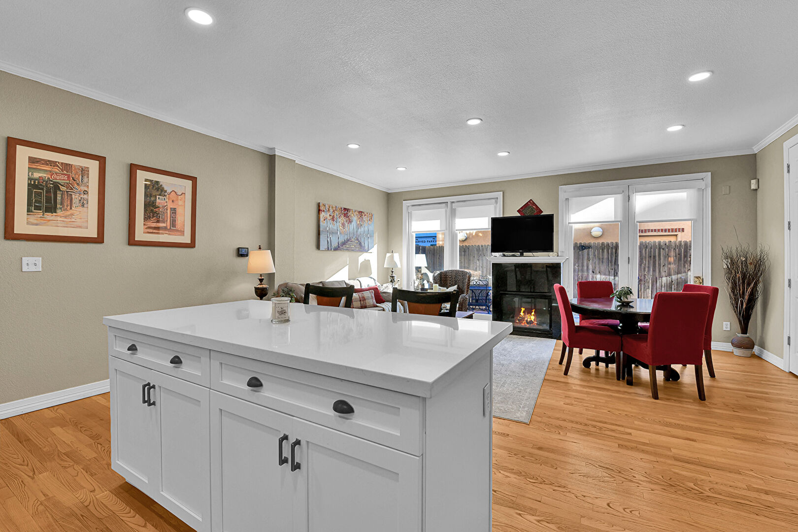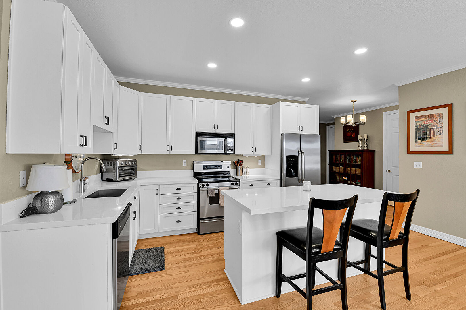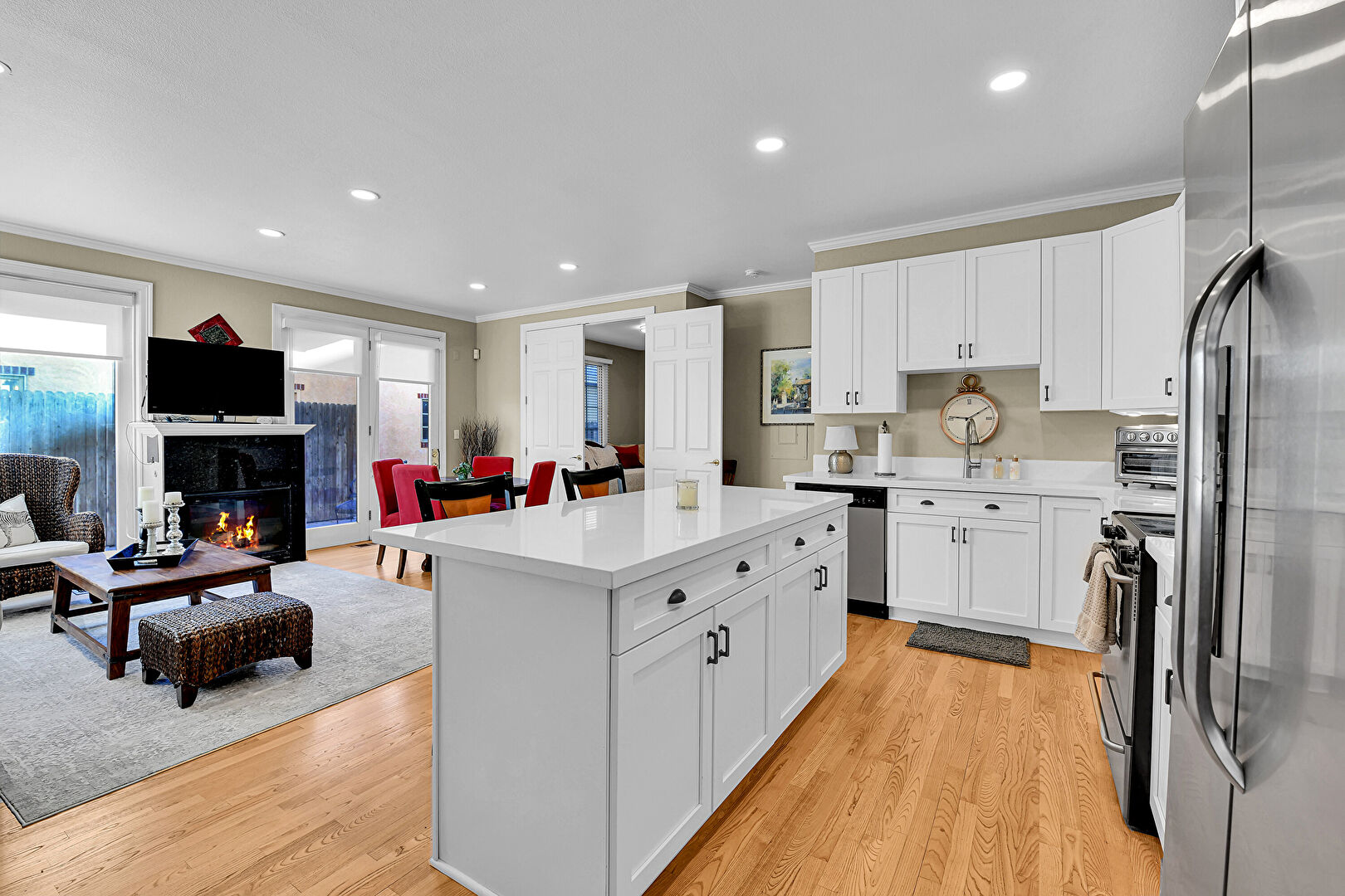 Baseboards Wall, Crown Molding, Drywall, Fireplace, Kitchen Bar, Kitchen Island, L Shaped Kitchen, Natural Light, Notable Chandelier, Opens To Living Area, Pendant Lighting, Recessed Lighting, Shaker Cabinets, Stone Countertops, Toaster, Wood Finish Floor, Crown Molding, Kitchen Island, Recessed Lighting, Shaker Cabinets, Toaster