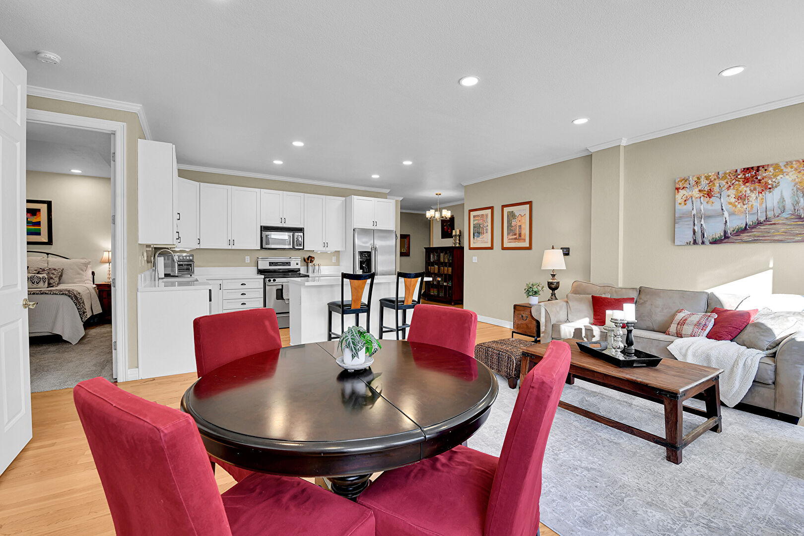 Baseboards Wall, Crown Molding, Drywall, L Shaped Kitchen, Notable Chandelier, Smoke Carbon Monoxide Detector, Wood Finish Floor, Recessed Lighting