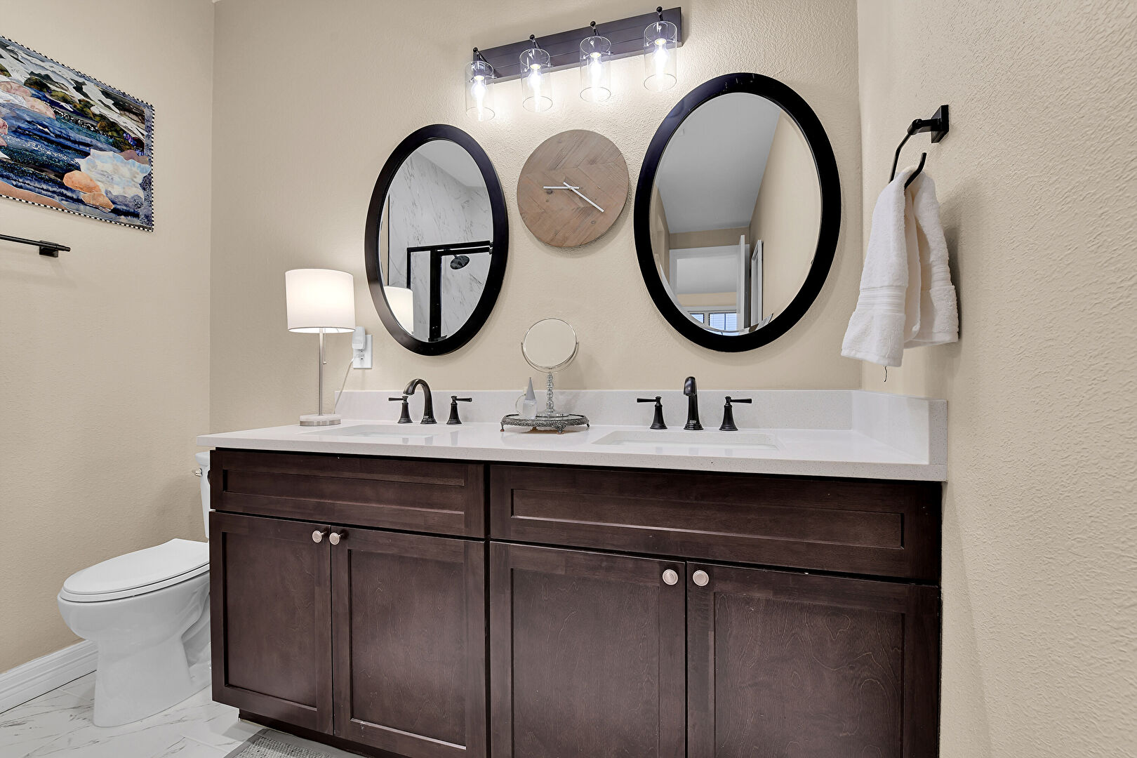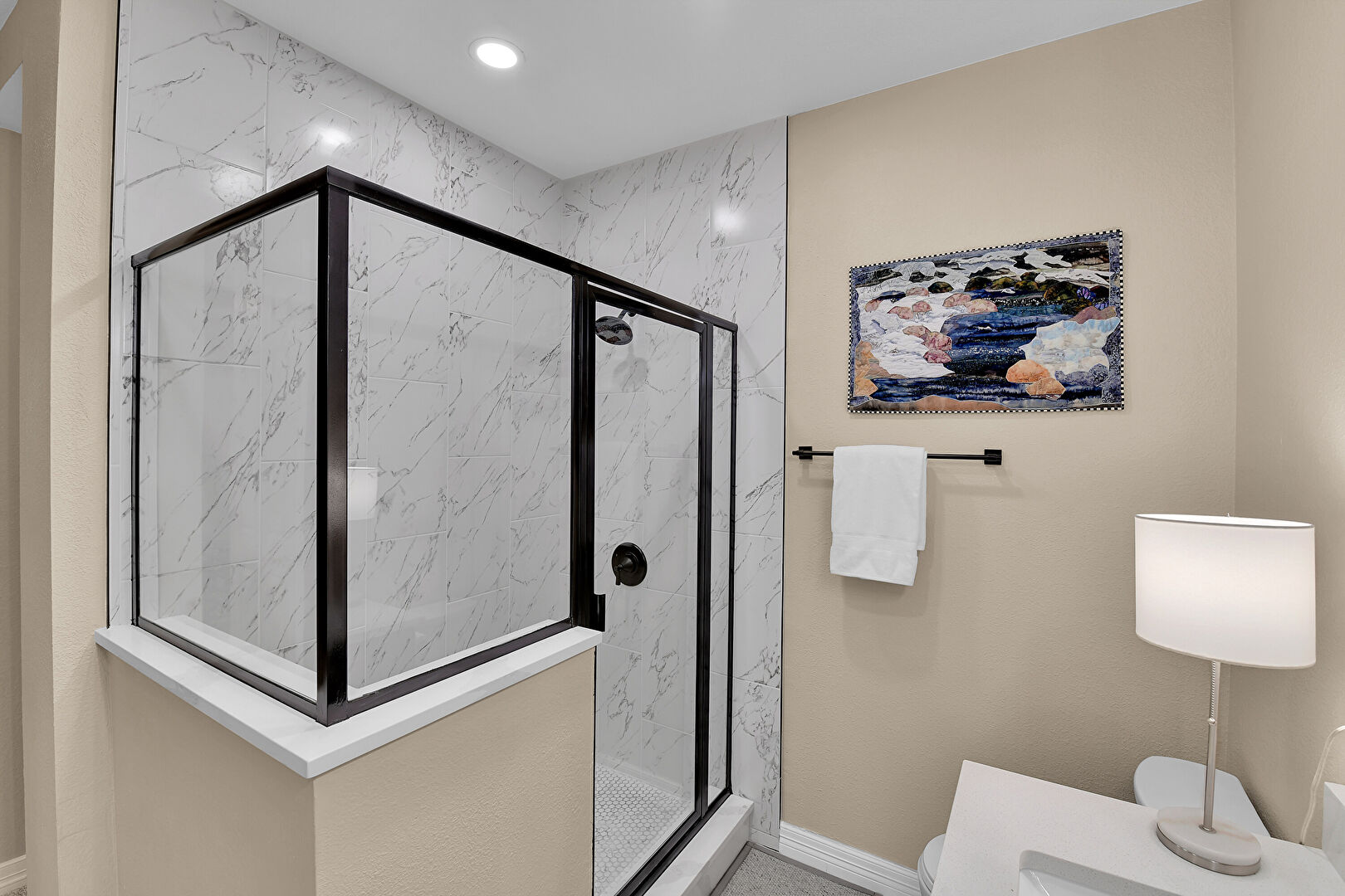 Double Vanity, Drywall, Full Bathroom, Marble Finish Floor, Recessed Lighting, Textured Wall, Baseboards Wall