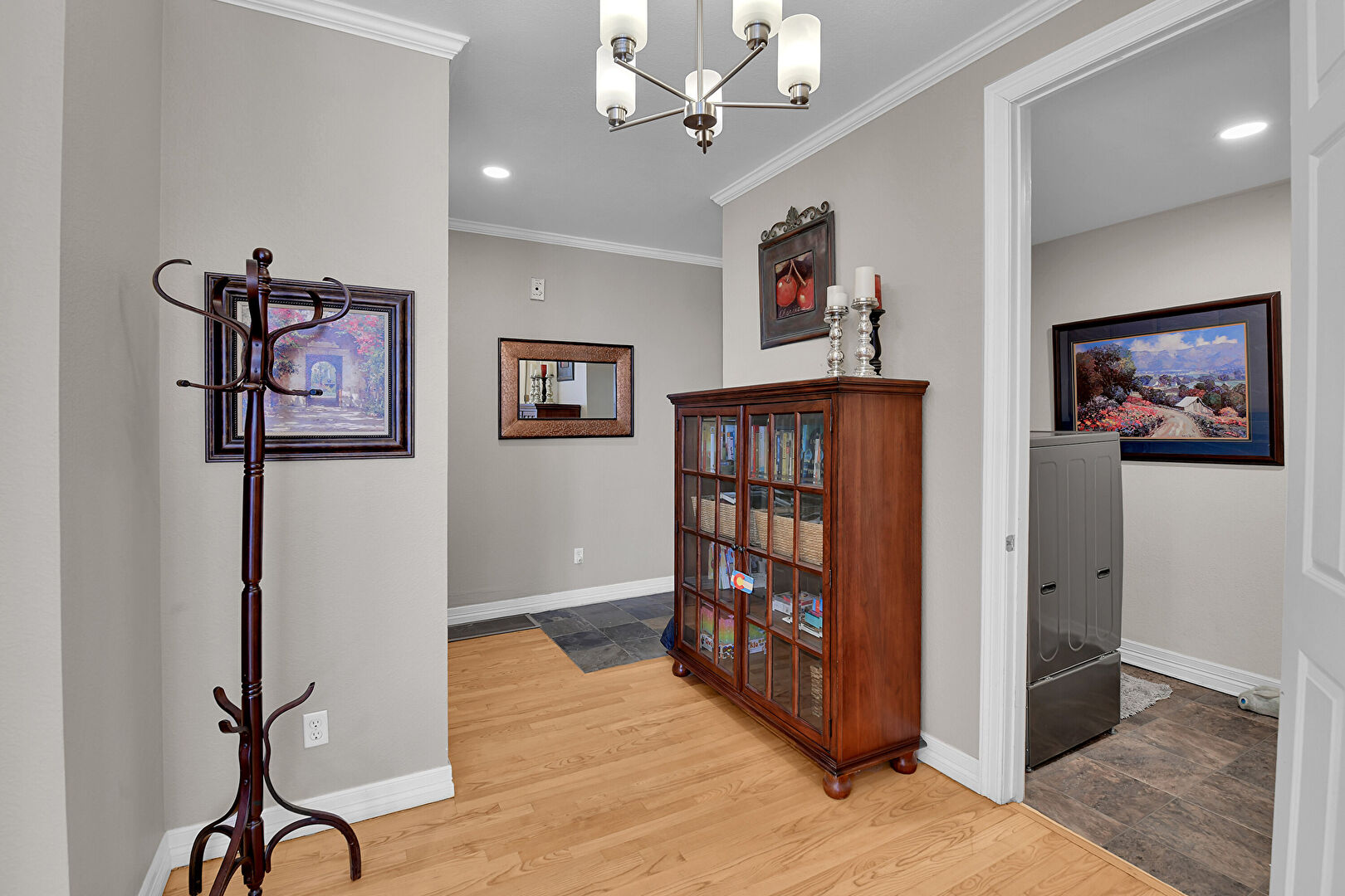 Baseboards Wall, Crown Molding, Drywall, Notable Chandelier, Recessed Lighting, Wood Finish Floor