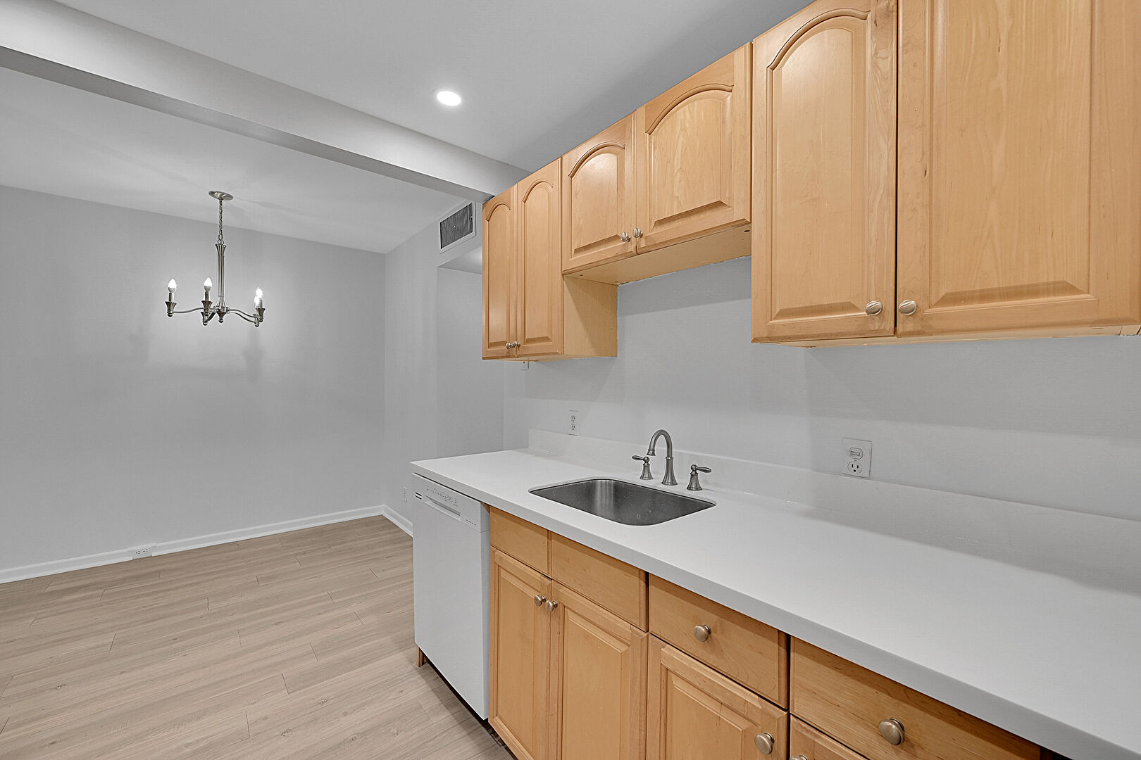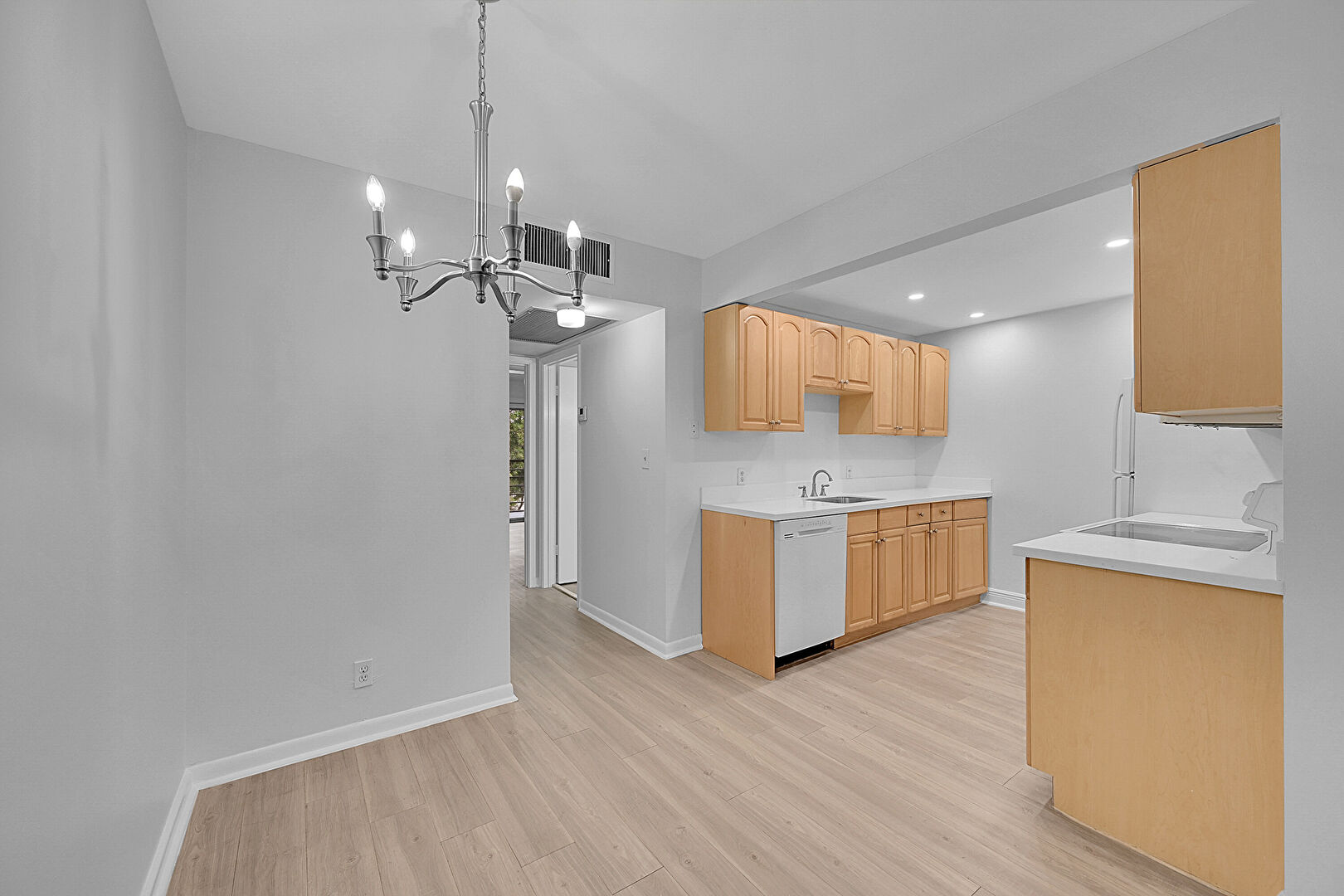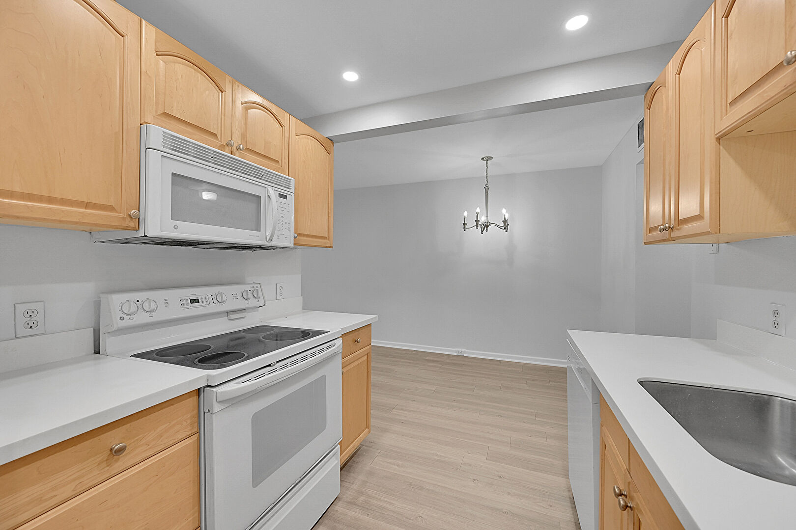 Arched Cabinets, Baseboards Wall, Ceiling Fan, Drywall, Galley Kitchen, Natural Light, Notable Chandelier, Opens To Living Area, Pendant Lighting, Raised Cabinets, Recessed Lighting, Stone Countertops, Vent, Wood Finish Floor, Drywall, Notable Chandelier, Recessed Lighting, Stone Countertops, Wood Finish Floor