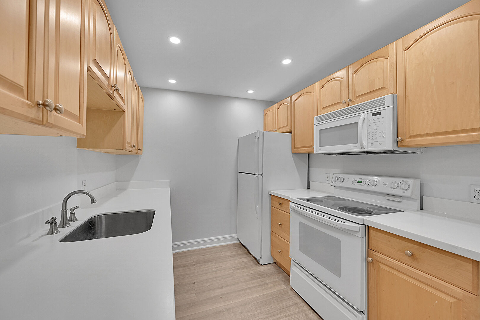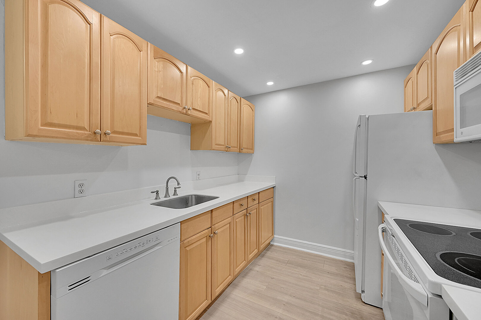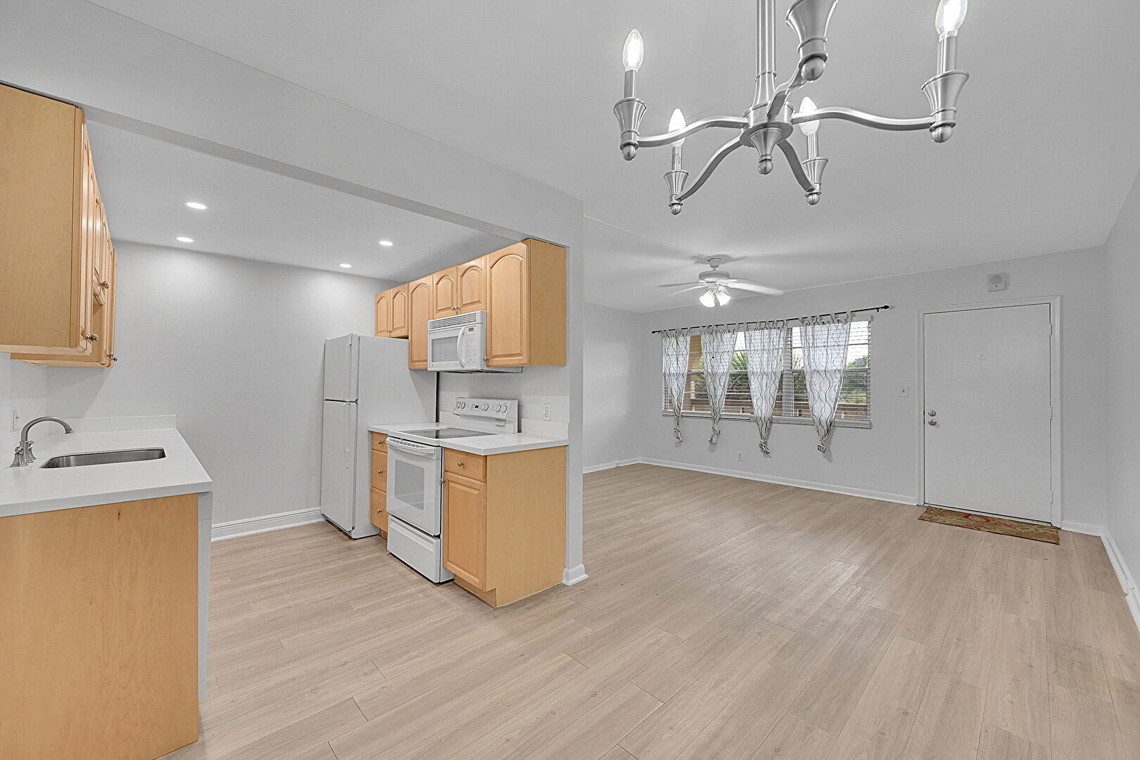 Arched Cabinets, Baseboards Wall, Ceiling Fan, Drywall, Galley Kitchen, Natural Light, Notable Chandelier, Opens To Living Area, Pendant Lighting, Raised Cabinets, Recessed Lighting, Stone Countertops, Vent, Wood Finish Floor, Drywall, Notable Chandelier, Recessed Lighting, Stone Countertops, Wood Finish Floor