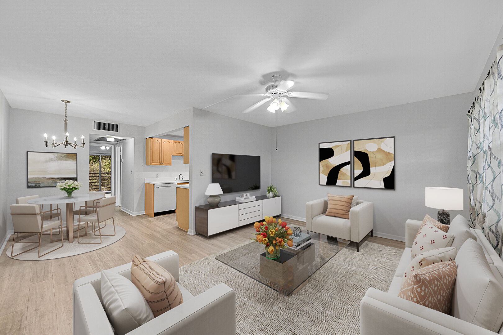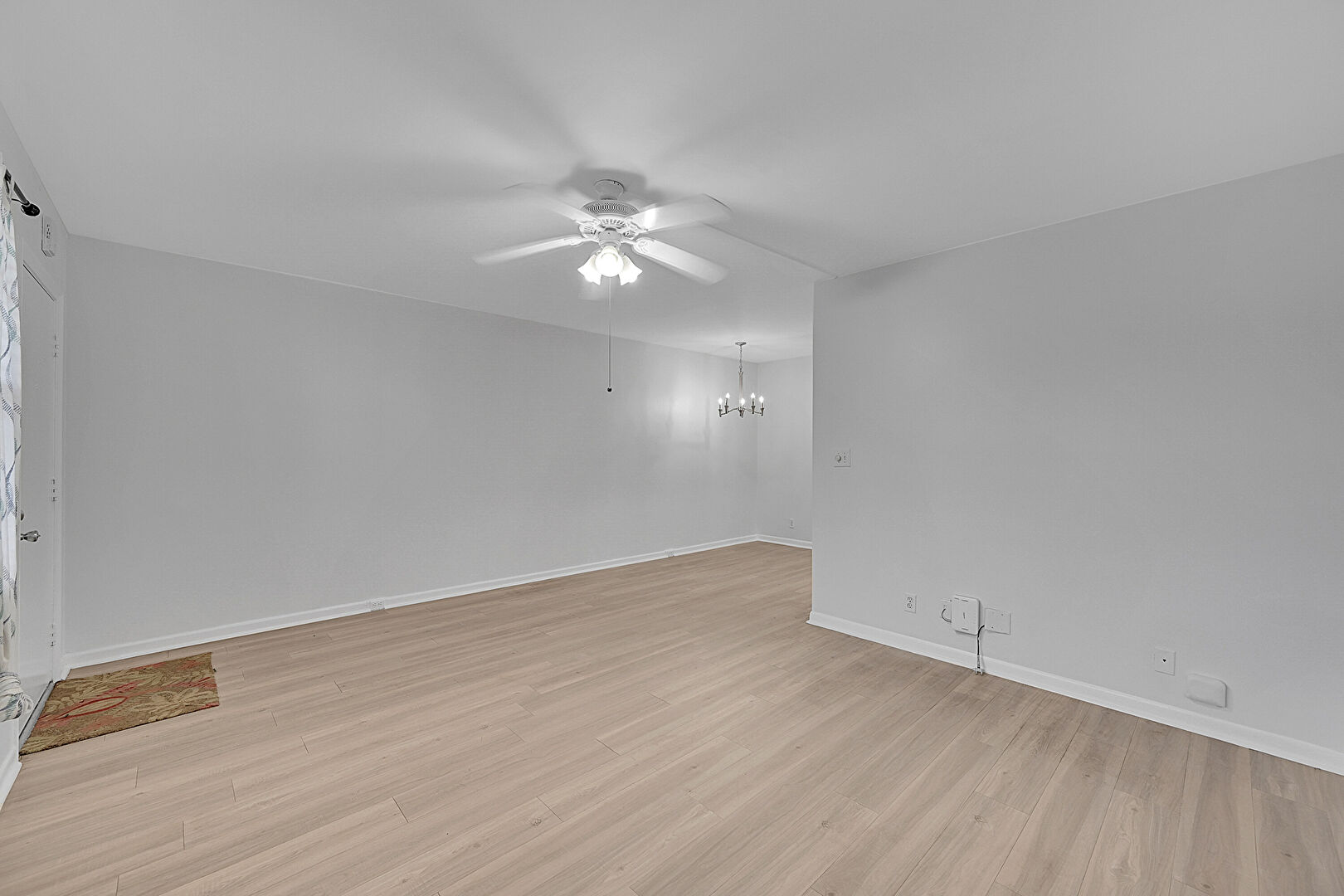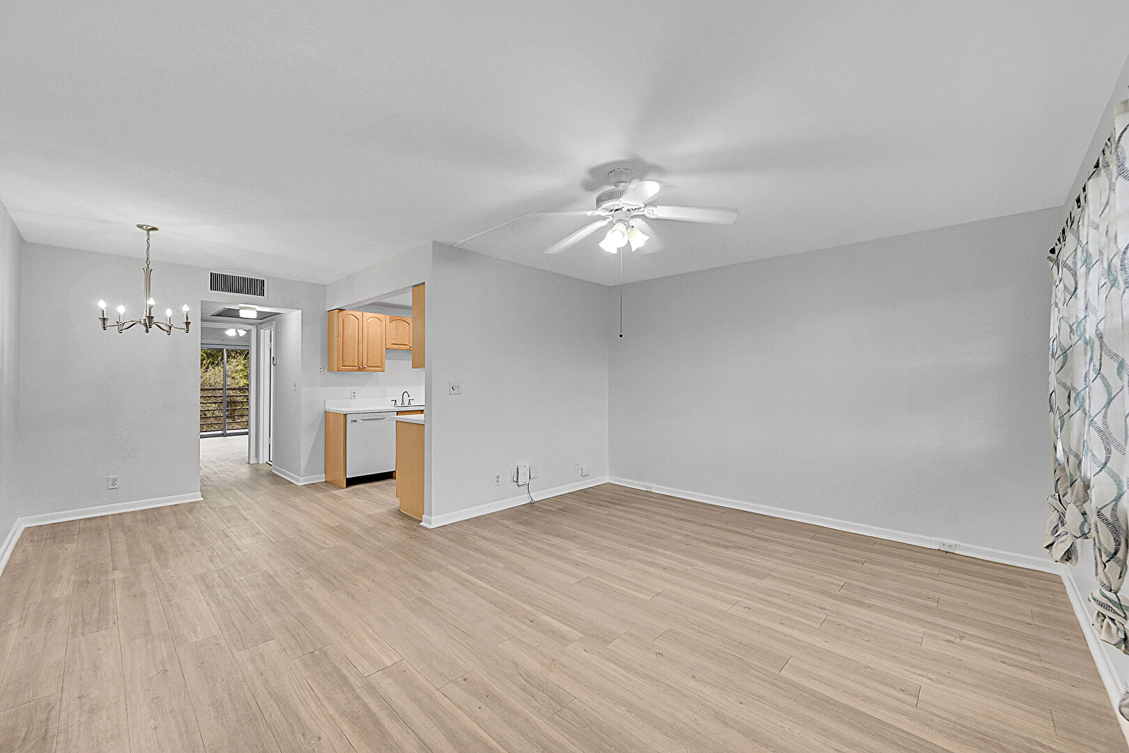 Baseboards Wall, Ceiling Fan, Drywall, Natural Light, Notable Chandelier, Vent, Wood Finish Floor, Drywall, Notable Chandelier, Vent, Wood Finish Floor