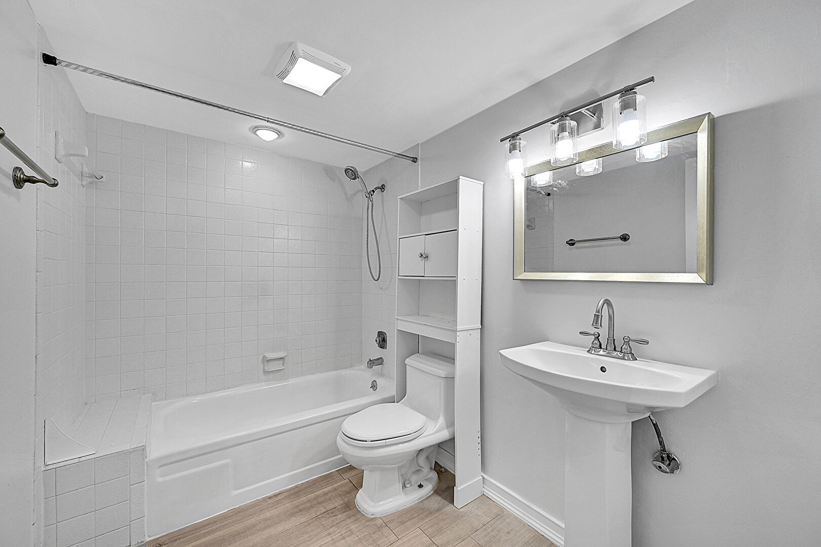 Baseboards Wall, Combined Bath Shower, Drywall, Vent, Wood Finish Floor, Full Bathroom