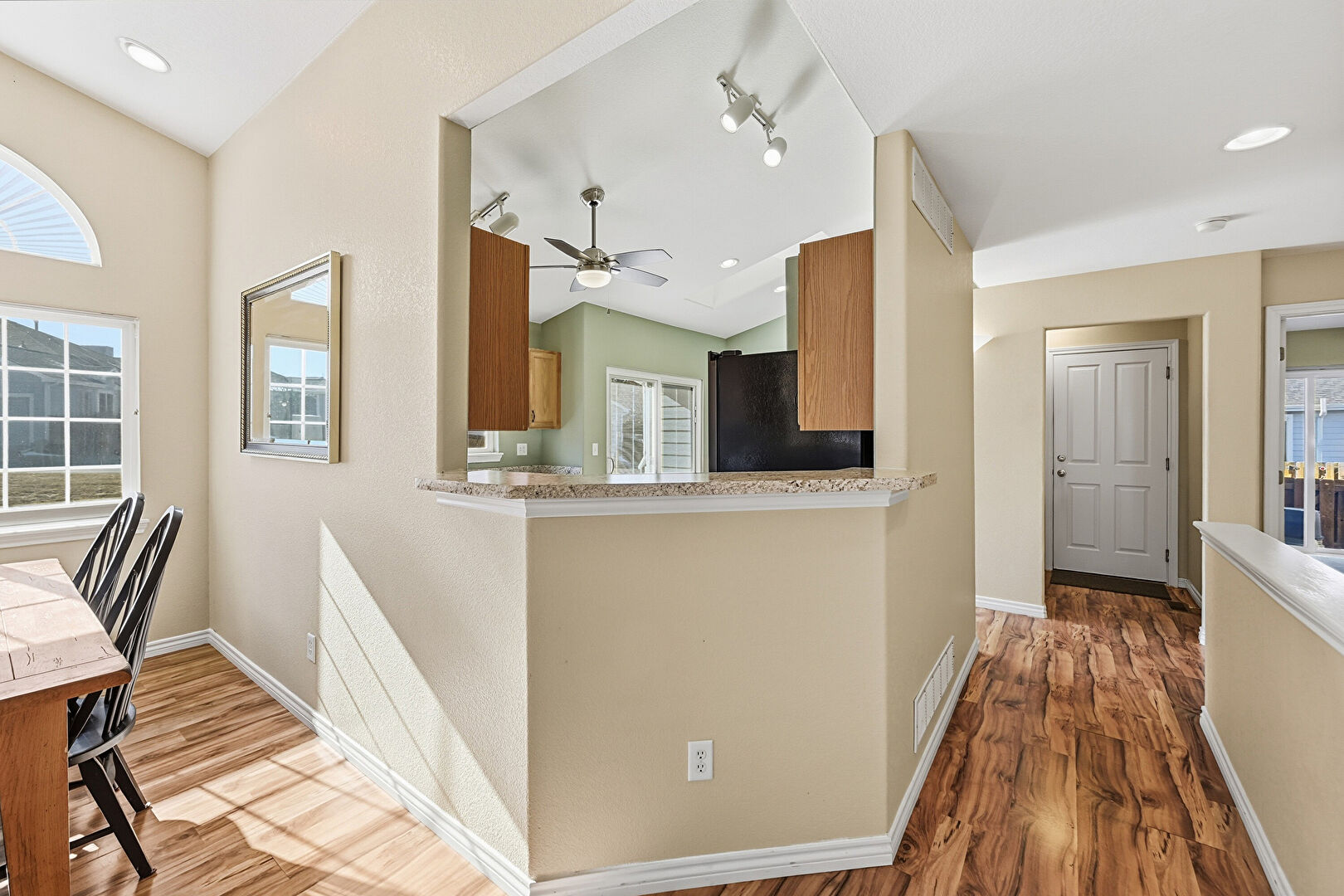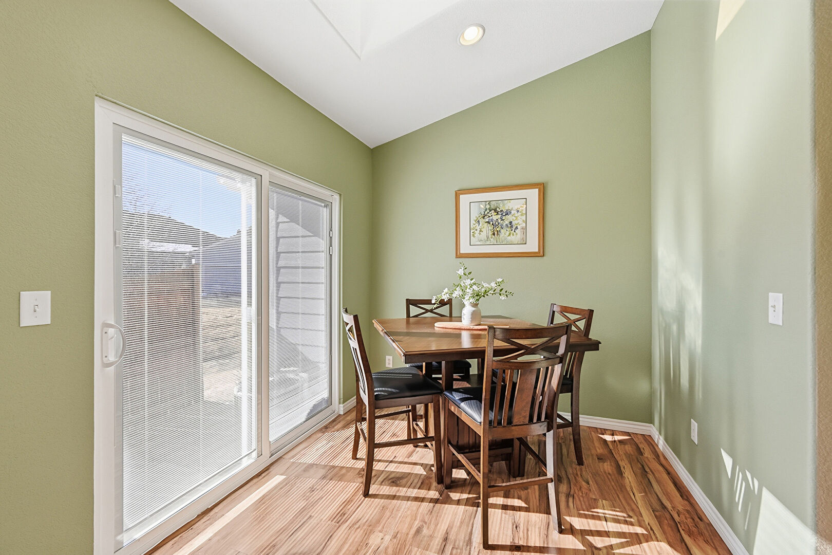Baseboards Wall, Drywall, Recessed Lighting, Vaulted Ceiling, Wood Finish Floor, Natural Light