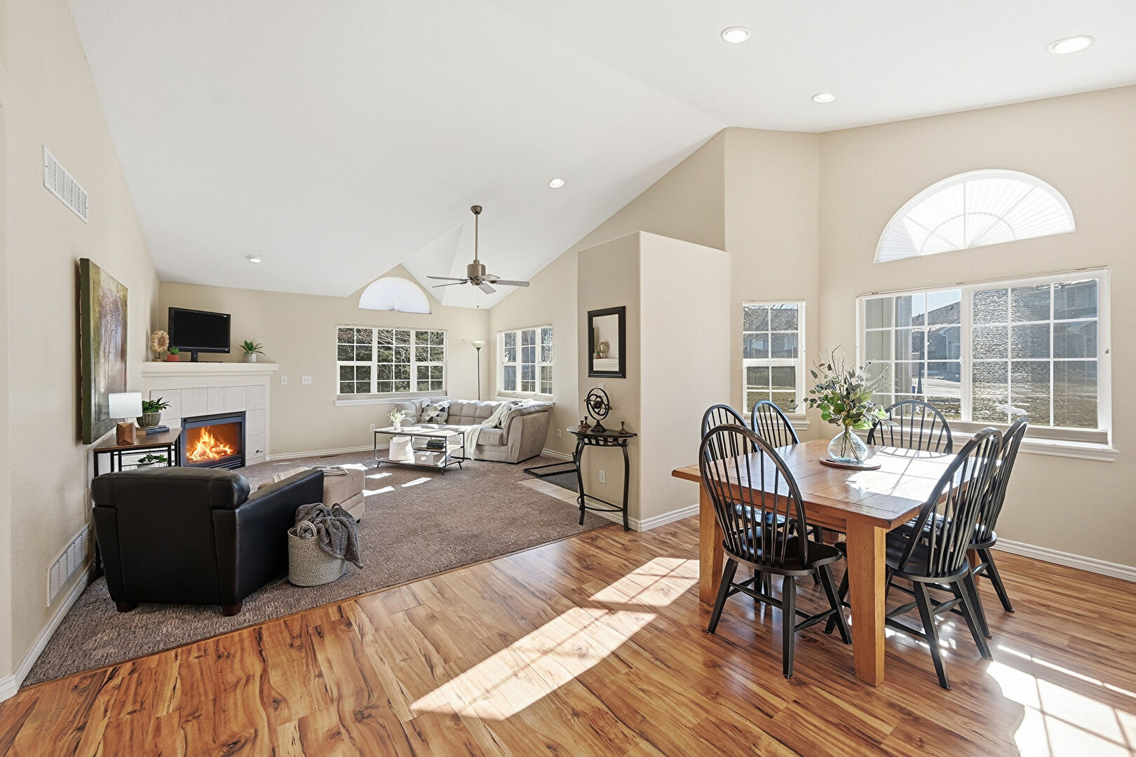 Baseboards Wall, Drywall, Fireplace, High Ceiling, Natural Light, Recessed Lighting, Vaulted Ceiling, Vent, Wood Finish Floor, Baseboards Wall, Ceiling Fan, Natural Light