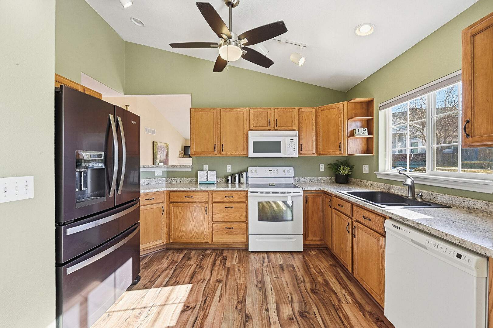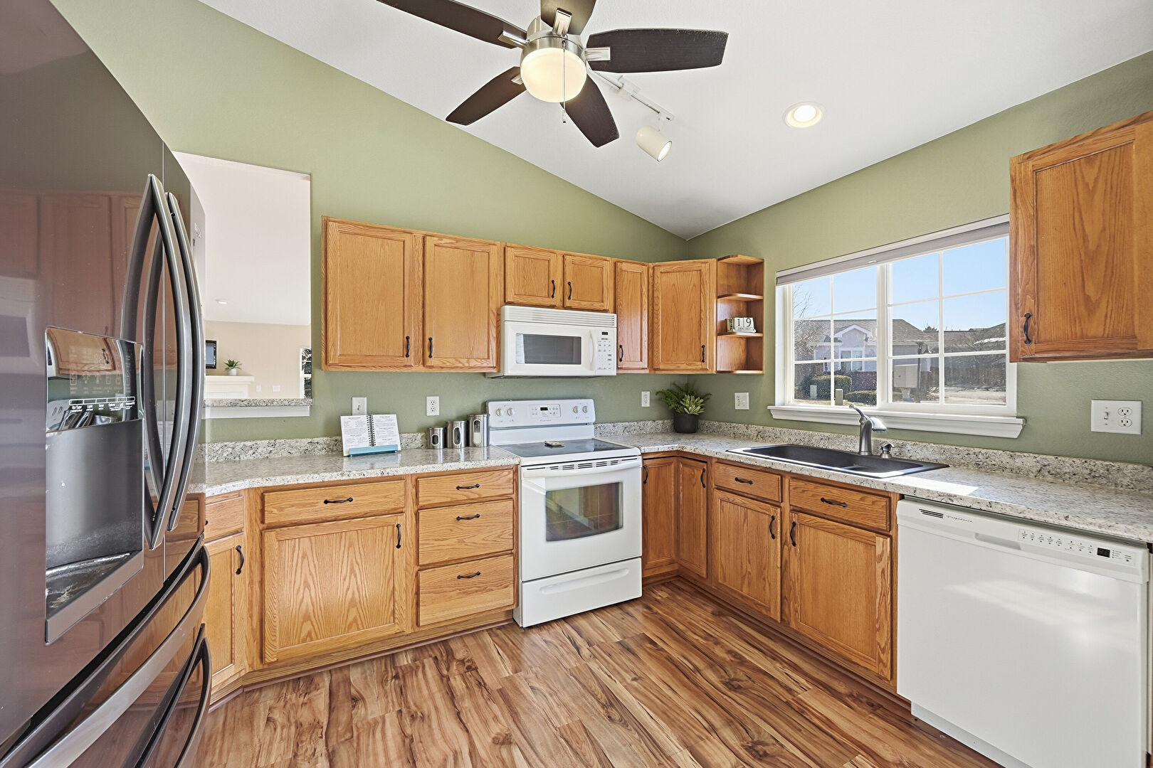 Baseboards Wall, Ceiling Fan, Drywall, High Ceiling, Kitchen Bar, Medium Brown Cabinets, Natural Light, Open Shelves, Pass Through Window, Recessed Lighting, Shaker Cabinets, Skylight, Stone Countertops, Track Lighting, U Shaped Kitchen, Vaulted Ceiling, Vent, Wood Finish Floor, Baseboards Wall, Drywall, Natural Light, Open Shelves, Shaker Cabinets, Track Lighting