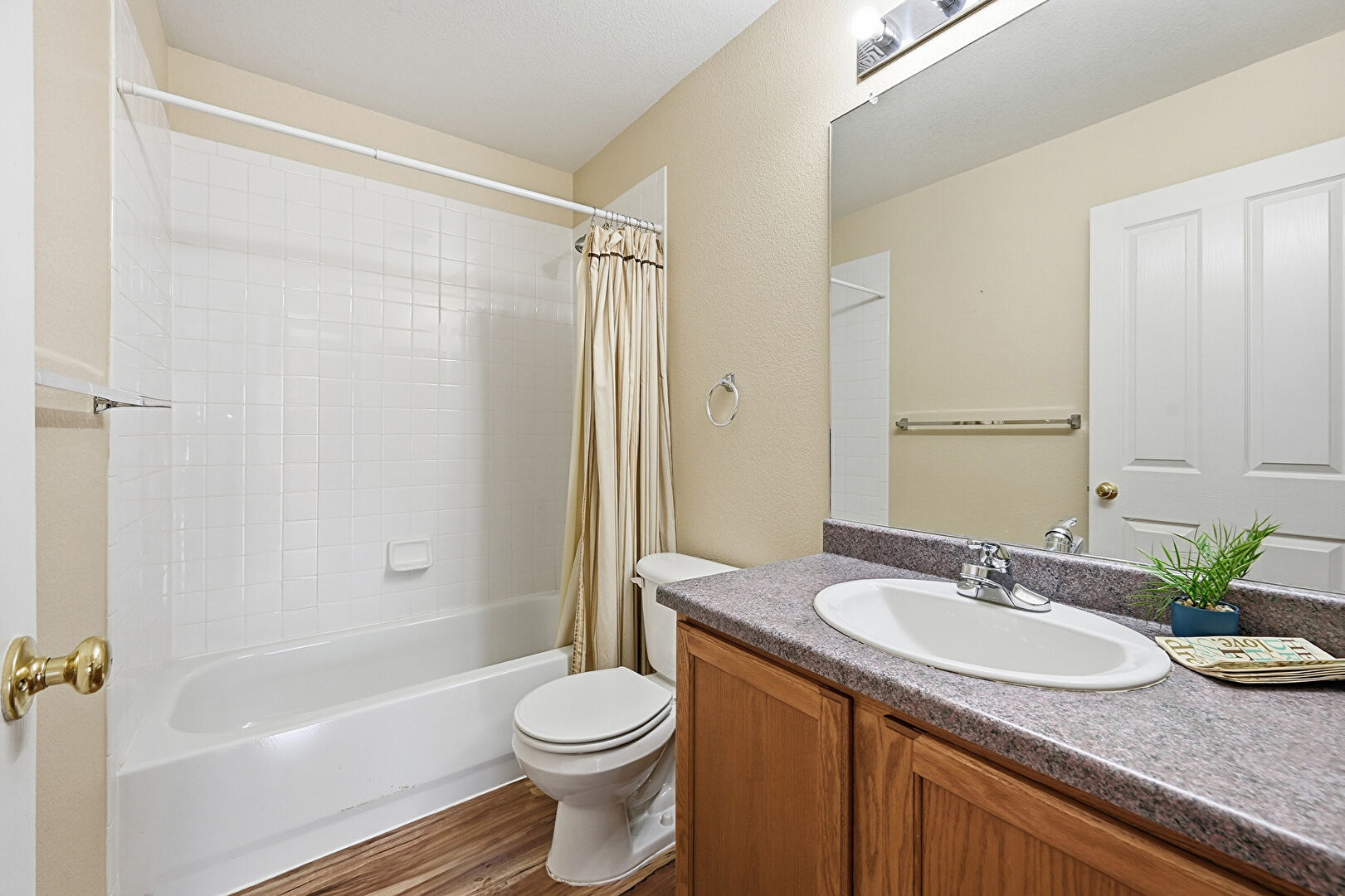 Combined Bath Shower, Drywall, Full Bathroom, Wood Finish Floor, Vanity