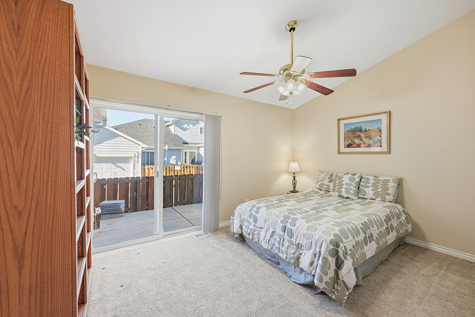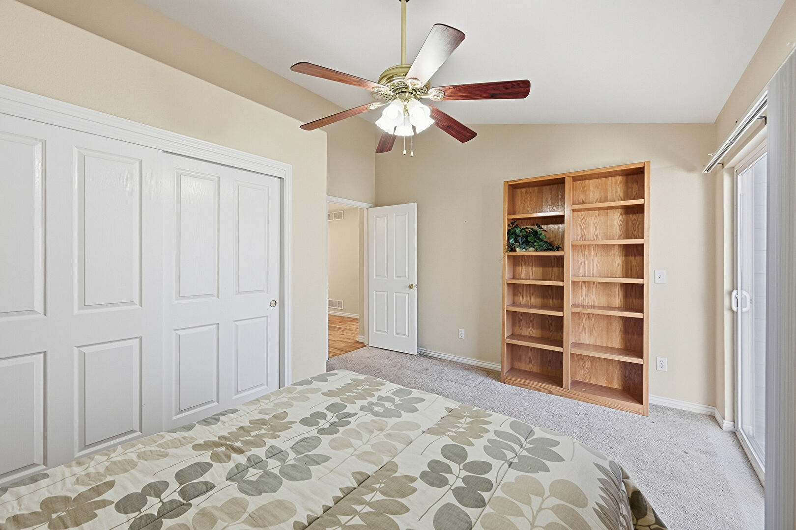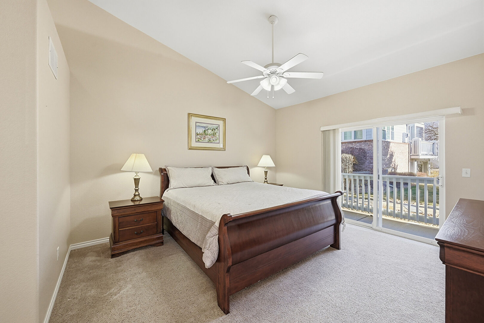 Access To Exterior, Baseboards Wall, Carpet, Ceiling Fan, Drywall, Natural Light, Vaulted Ceiling, Closet, Vaulted Ceiling