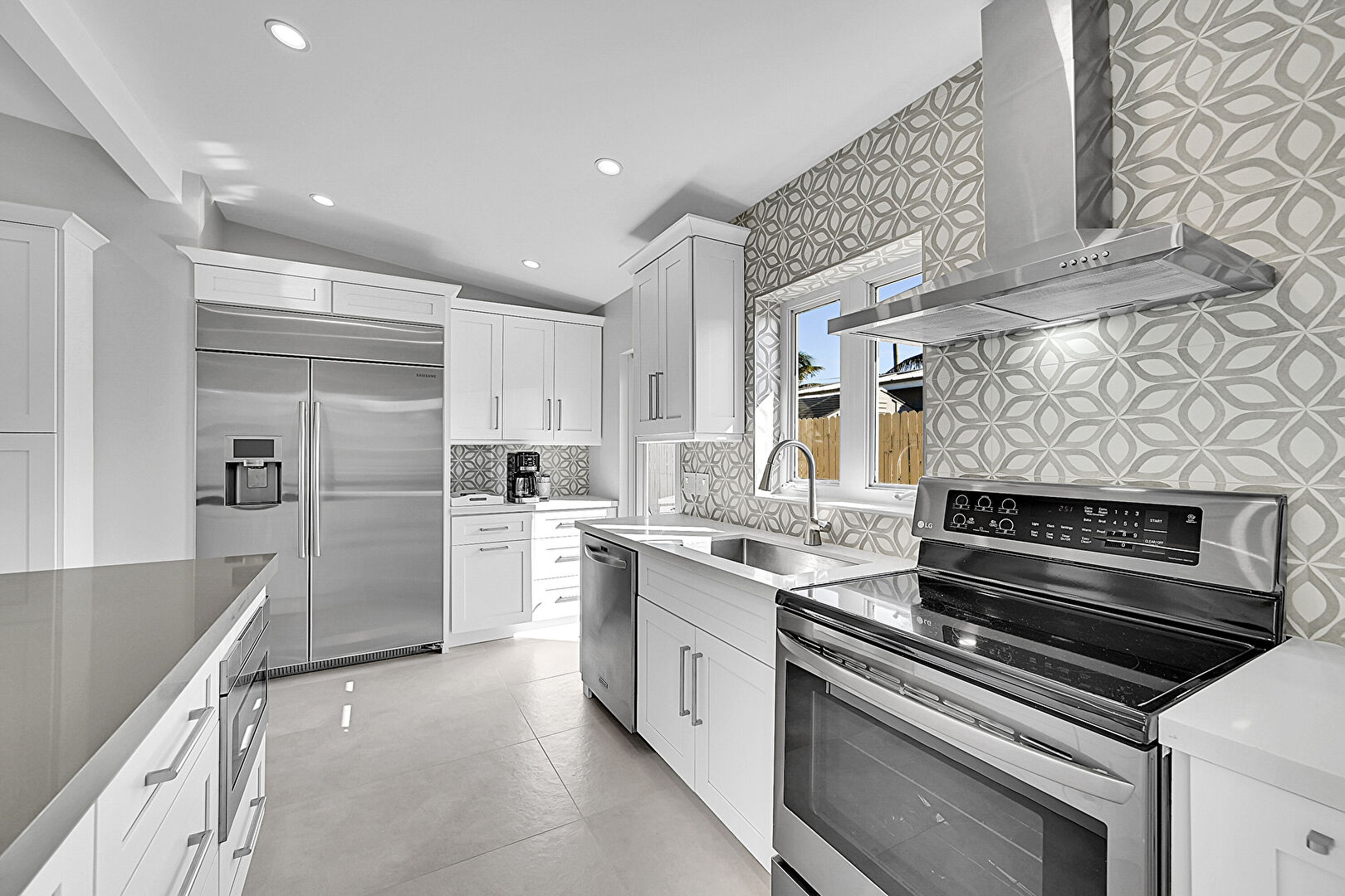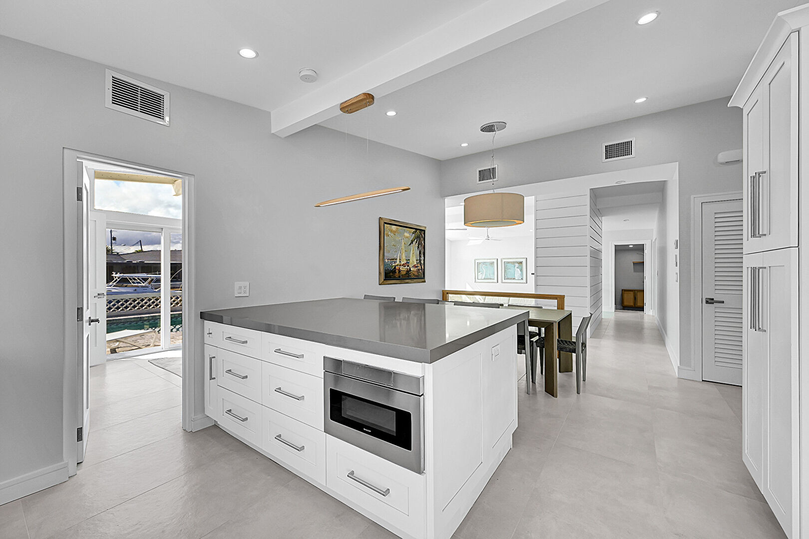 Baseboards Wall, Beamed Ceiling, Concrete Floor, Crown Molding Cabinets, Drywall, Kitchen Bar, Kitchen Peninsula, Natural Light, Pendant Lighting, Recessed Lighting, Shaker Cabinets, Stone Countertops, Tile Floor, Vaulted Ceiling, Vent, Natural Light, Pendant Lighting, Recessed Lighting, Tile Floor