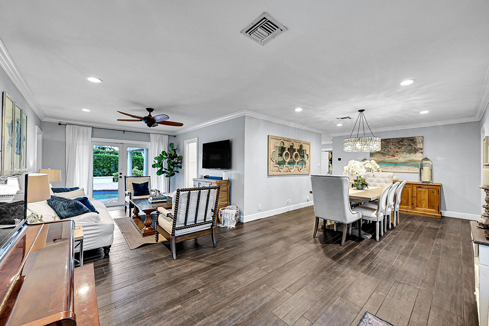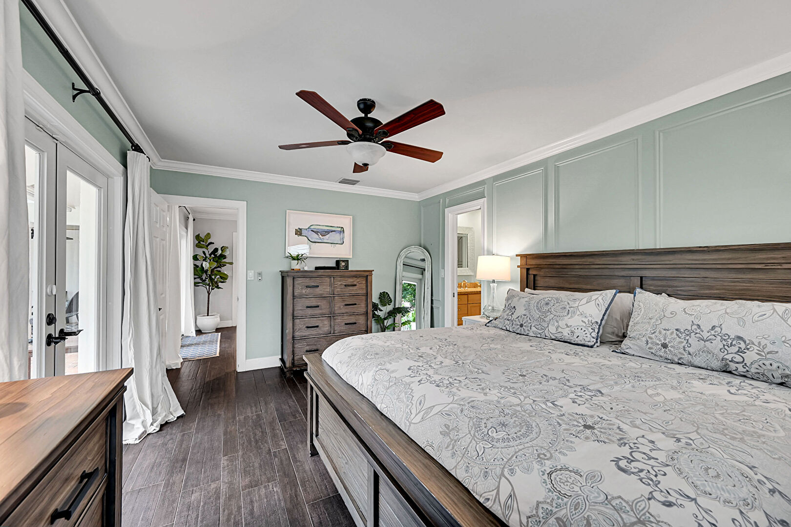 Access To Exterior, Baseboards Wall, Ceiling Fan, Crown Molding, Drywall, French Doors, Natural Light, Paneling Wall, Pool View, Vent, Wood Finish Floor, Ceiling Fan, Ensuite Bathroom, Pool View, Wood Finish Floor