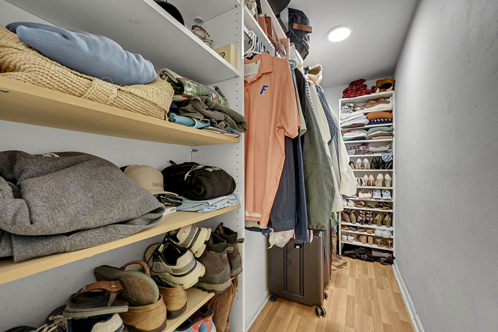 Closet, Combined Bath Shower, Drywall, Ensuite Bathroom, Full Bathroom, Natural Light, Recessed Lighting, Tile Floor, Vanity, Vent, Wood Finish Floor, Ceiling Fan, Closet, Vent