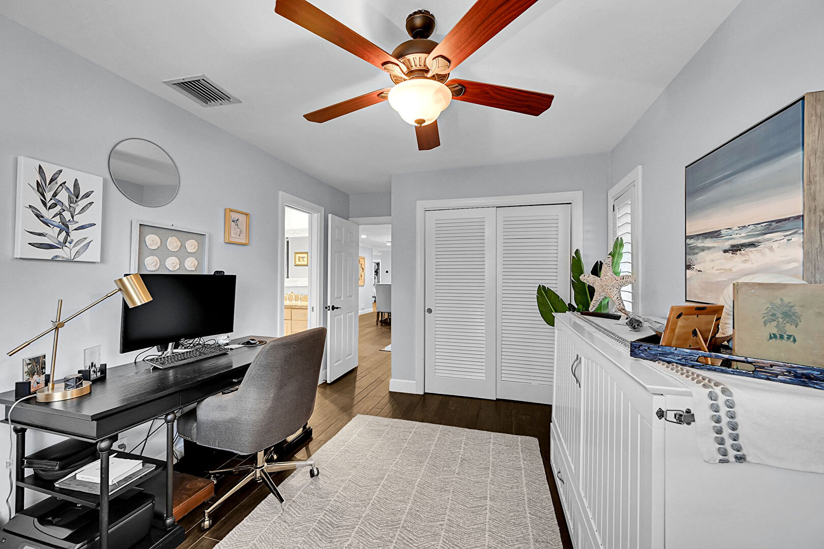 Baseboards Wall, Ceiling Fan, Drywall, Natural Light, Vent, Wood Finish Floor, Office Area