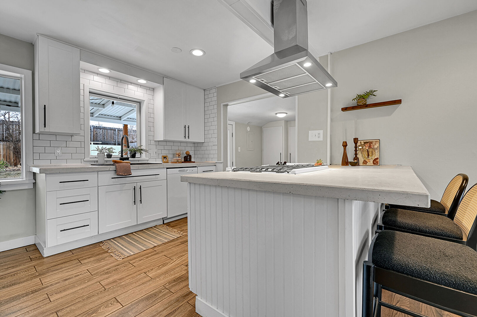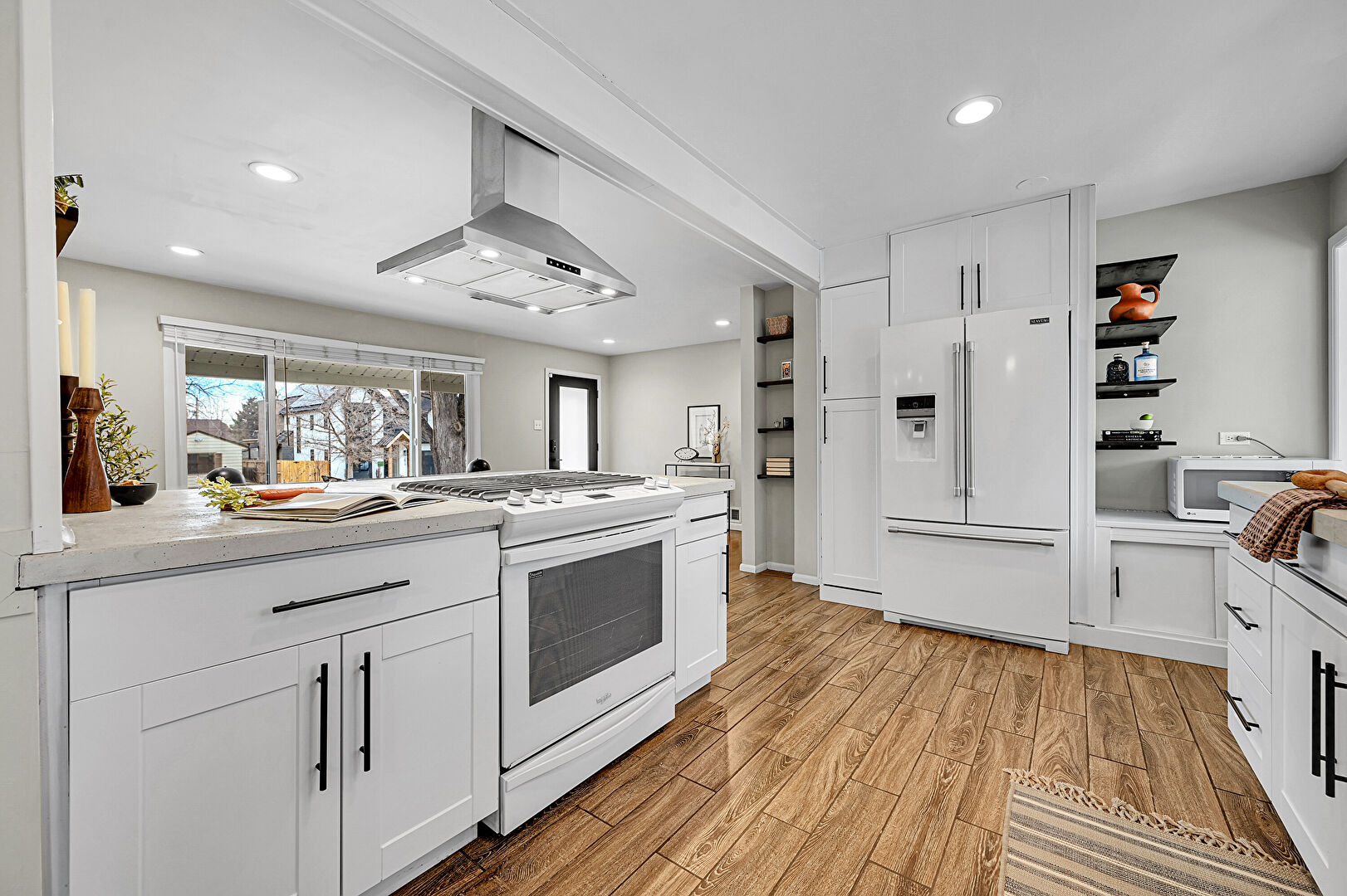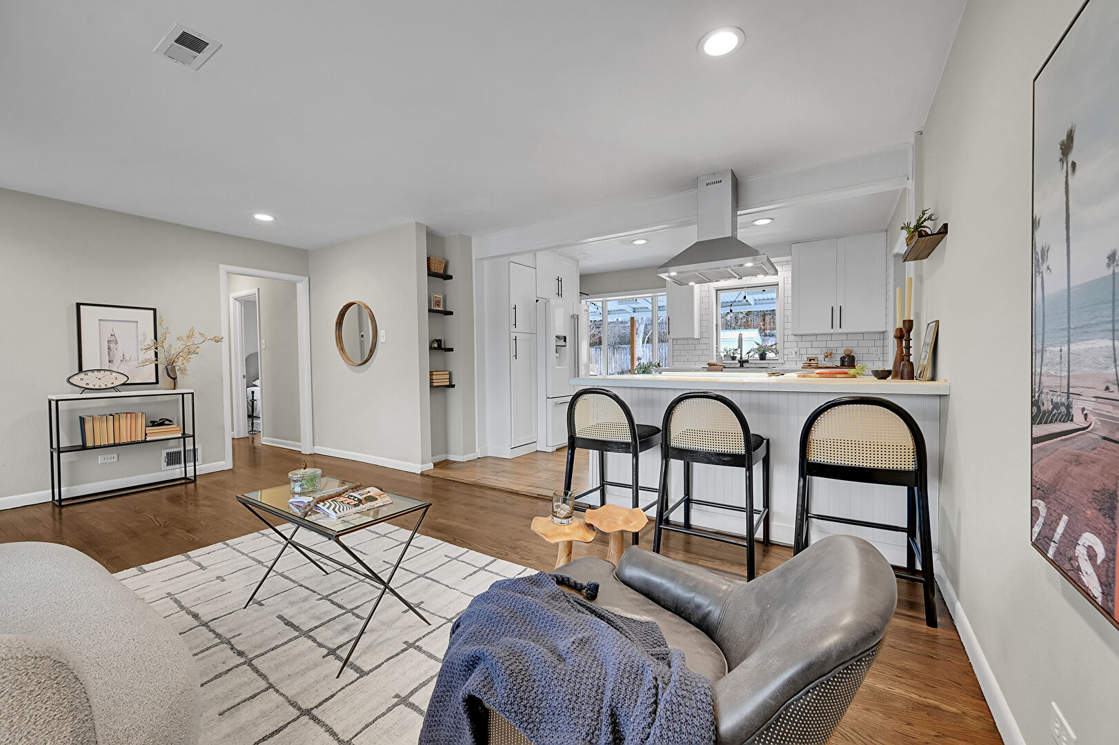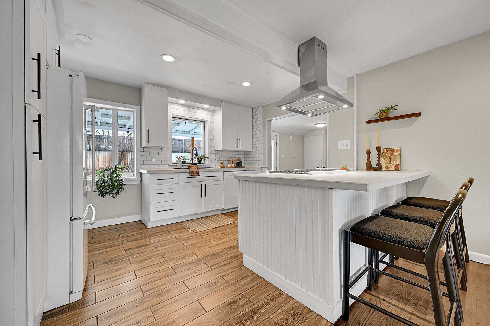 Baseboards Wall, Beamed Ceiling, Drywall, Kitchen Bar, Kitchen Peninsula, Natural Light, Open Shelves, Opens To Living Area, Recessed Lighting, Shaker Cabinets, Stone Countertops, Vent, Wood Finish Floor, Kitchen Peninsula, Natural Light, Recessed Lighting, Shaker Cabinets, Stone Countertops