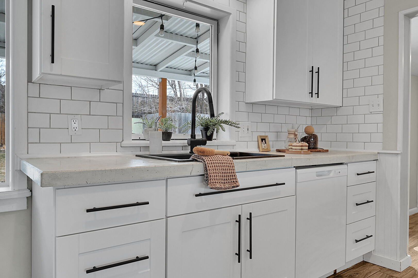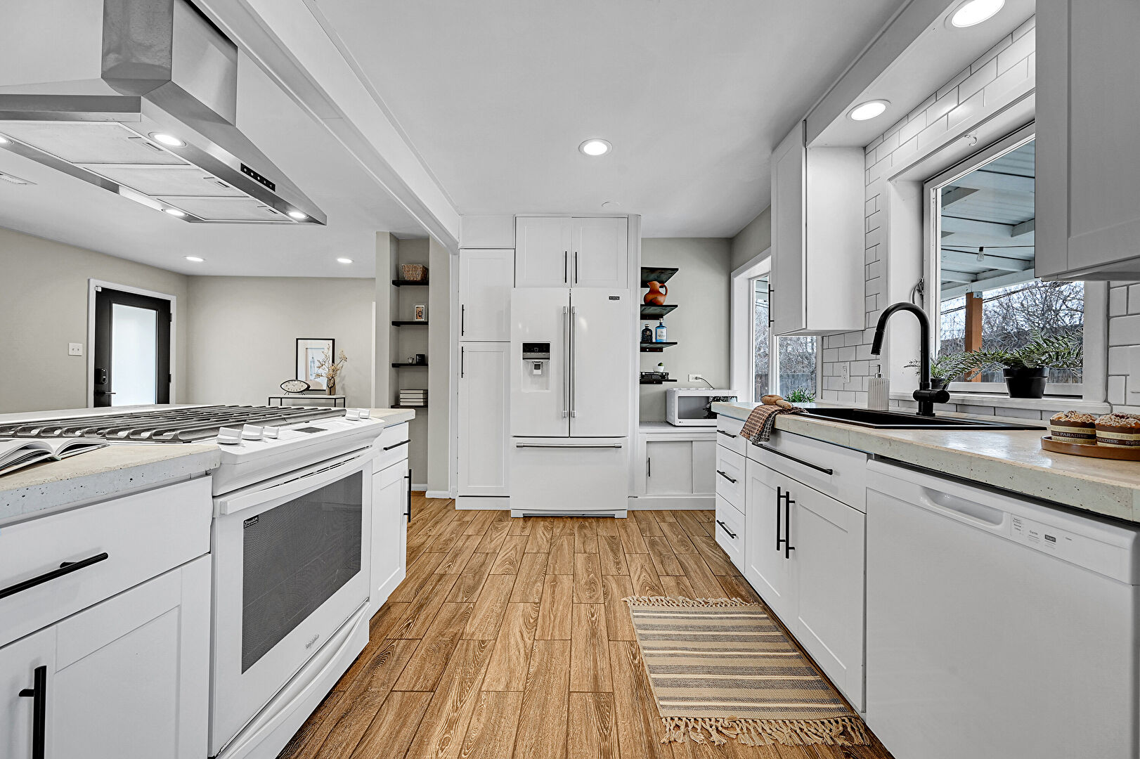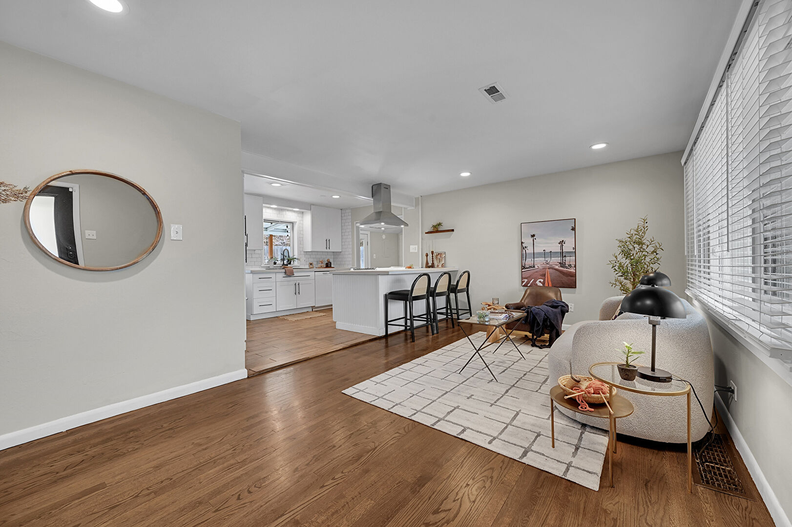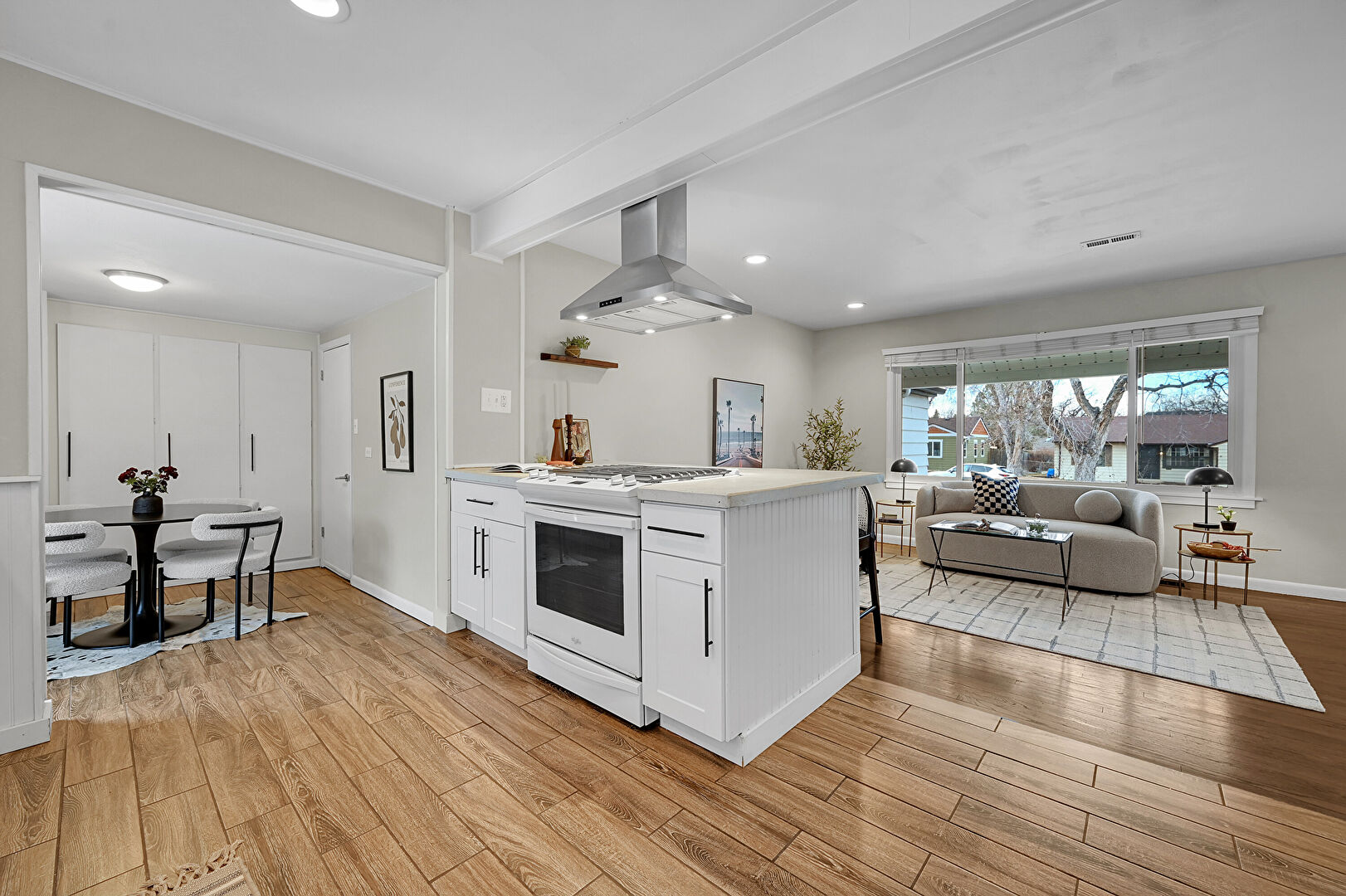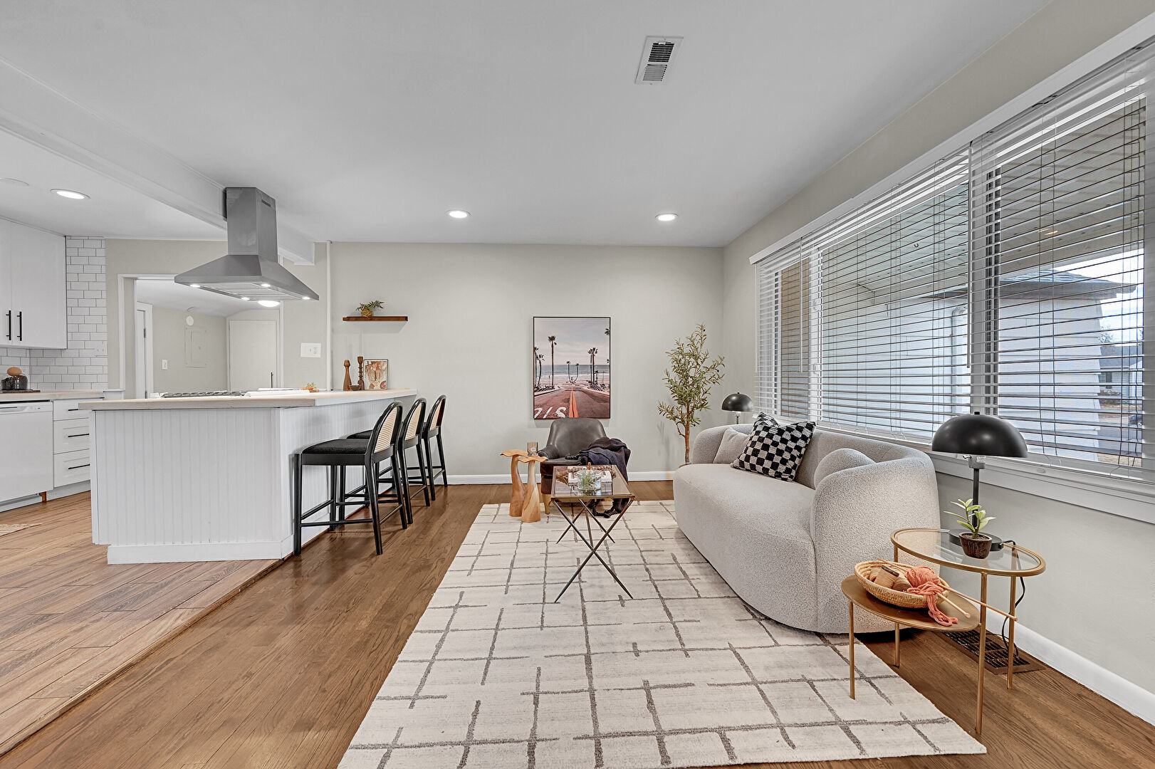 Baseboards Wall, Beamed Ceiling, Drywall, Kitchen Bar, Kitchen Peninsula, Natural Light, Open Shelves, Opens To Living Area, Recessed Lighting, Shaker Cabinets, Stone Countertops, Vent, Wood Finish Floor, Kitchen Peninsula, Natural Light, Recessed Lighting, Shaker Cabinets, Stone Countertops
