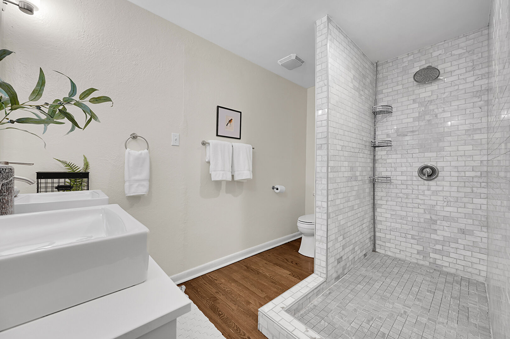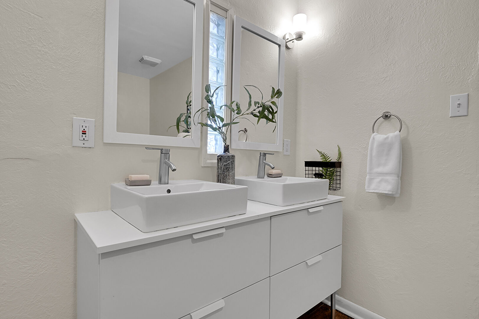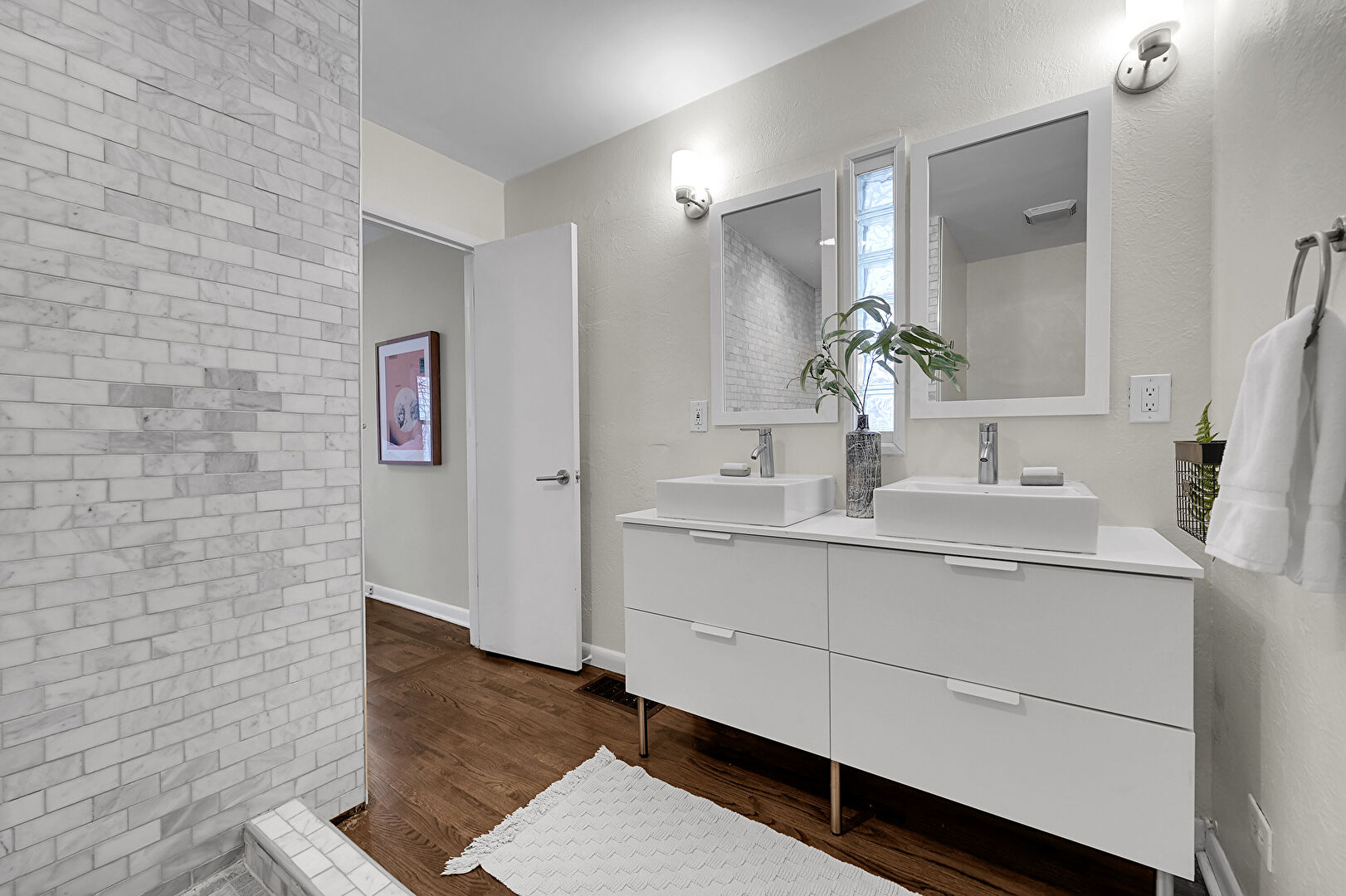Baseboards Wall, Brick Wall, Double Vanity, Drywall, Full Bathroom, Textured Wall, Vanity, Vent, Wood Finish Floor, Baseboards Wall, Natural Light