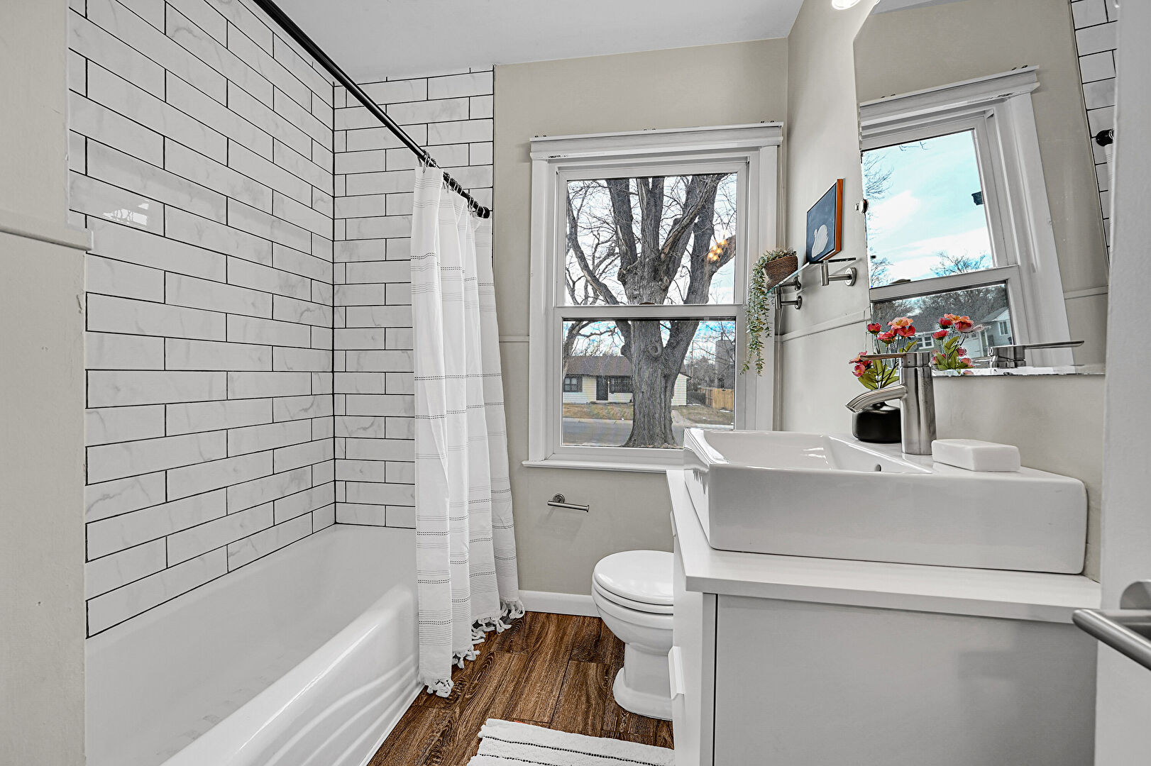 Baseboards Wall, Combined Bath Shower, Full Bathroom, Natural Light, Vanity, Wood Finish Floor, Drywall
