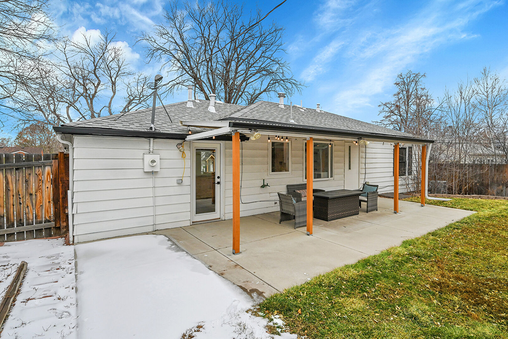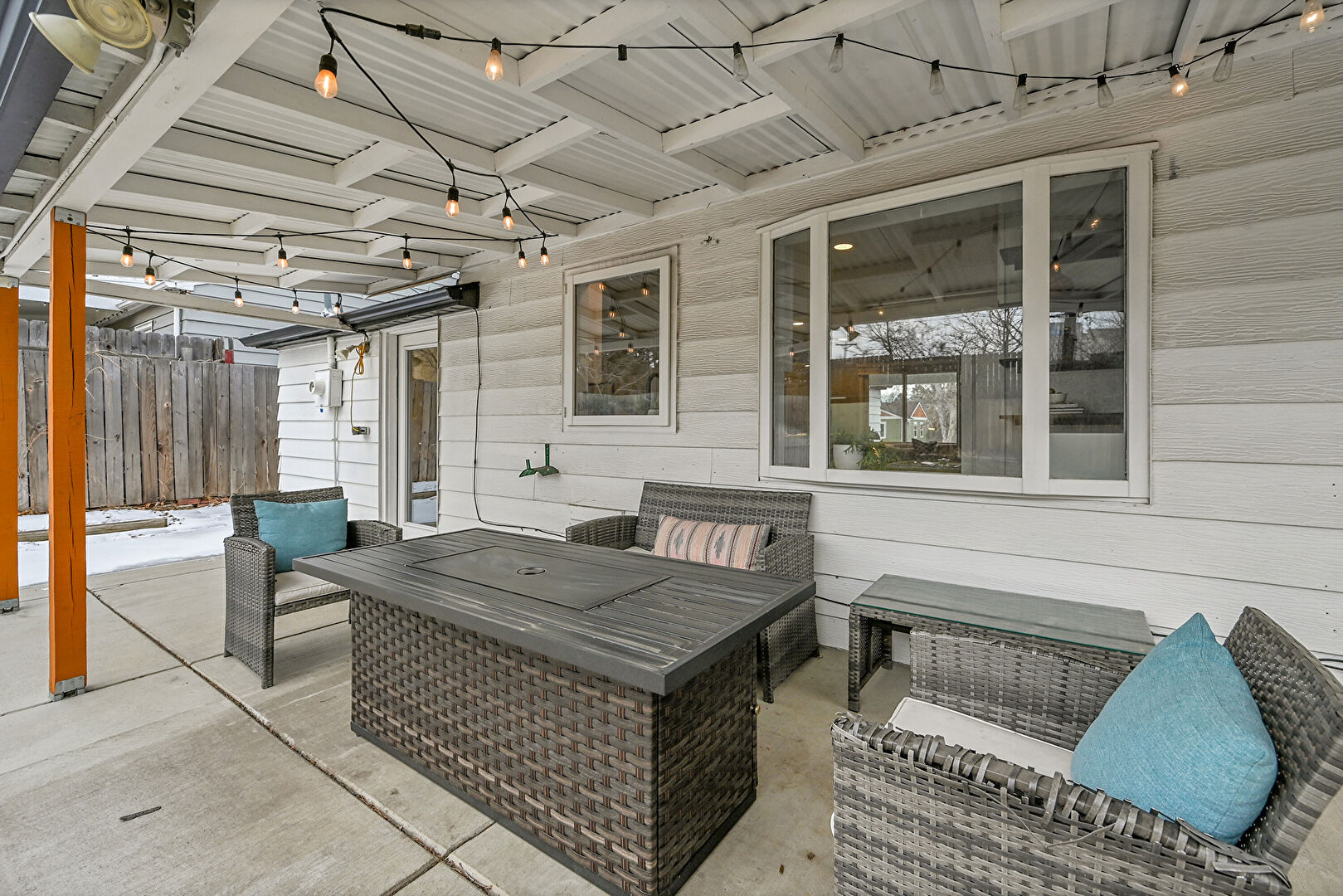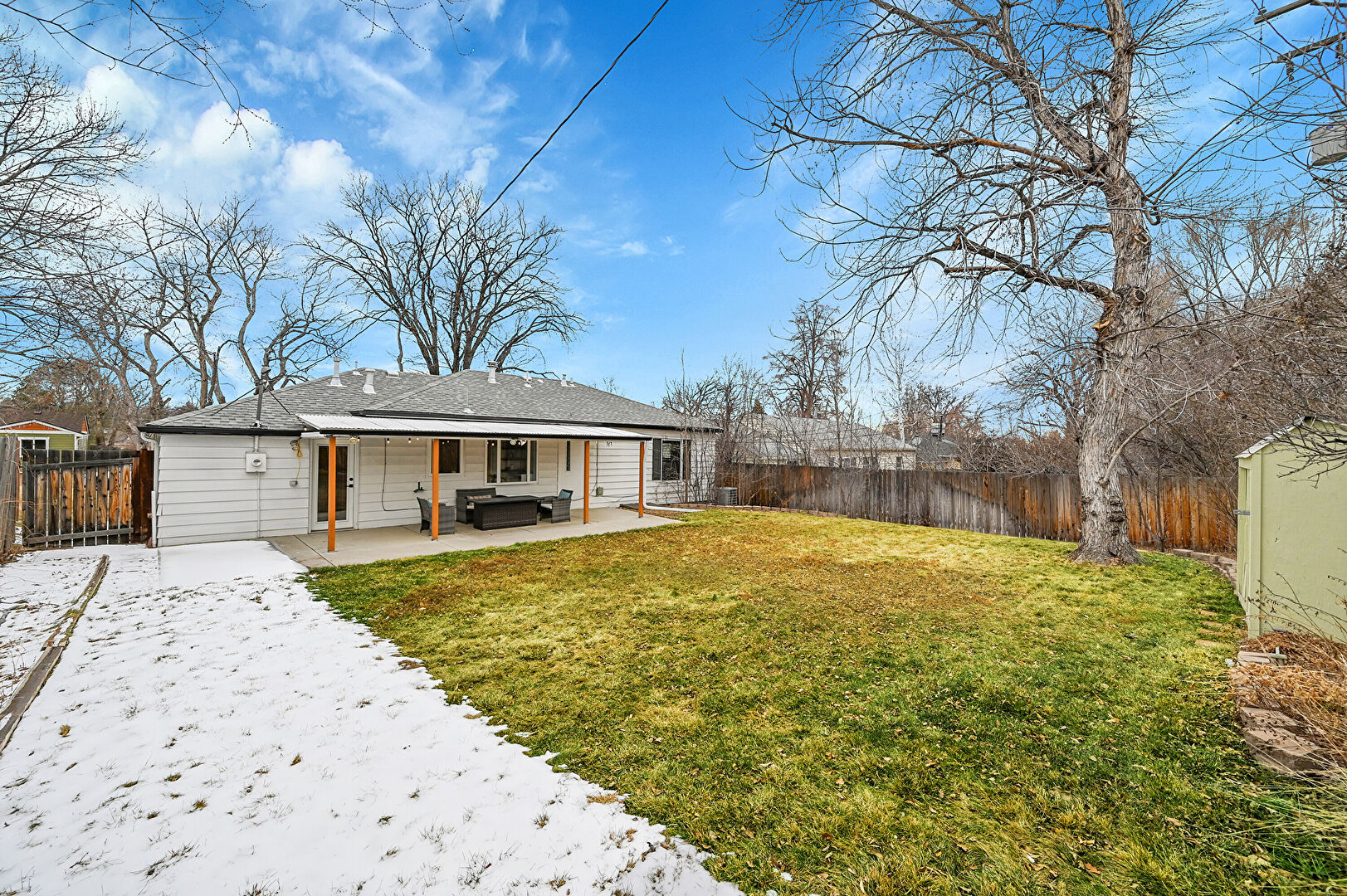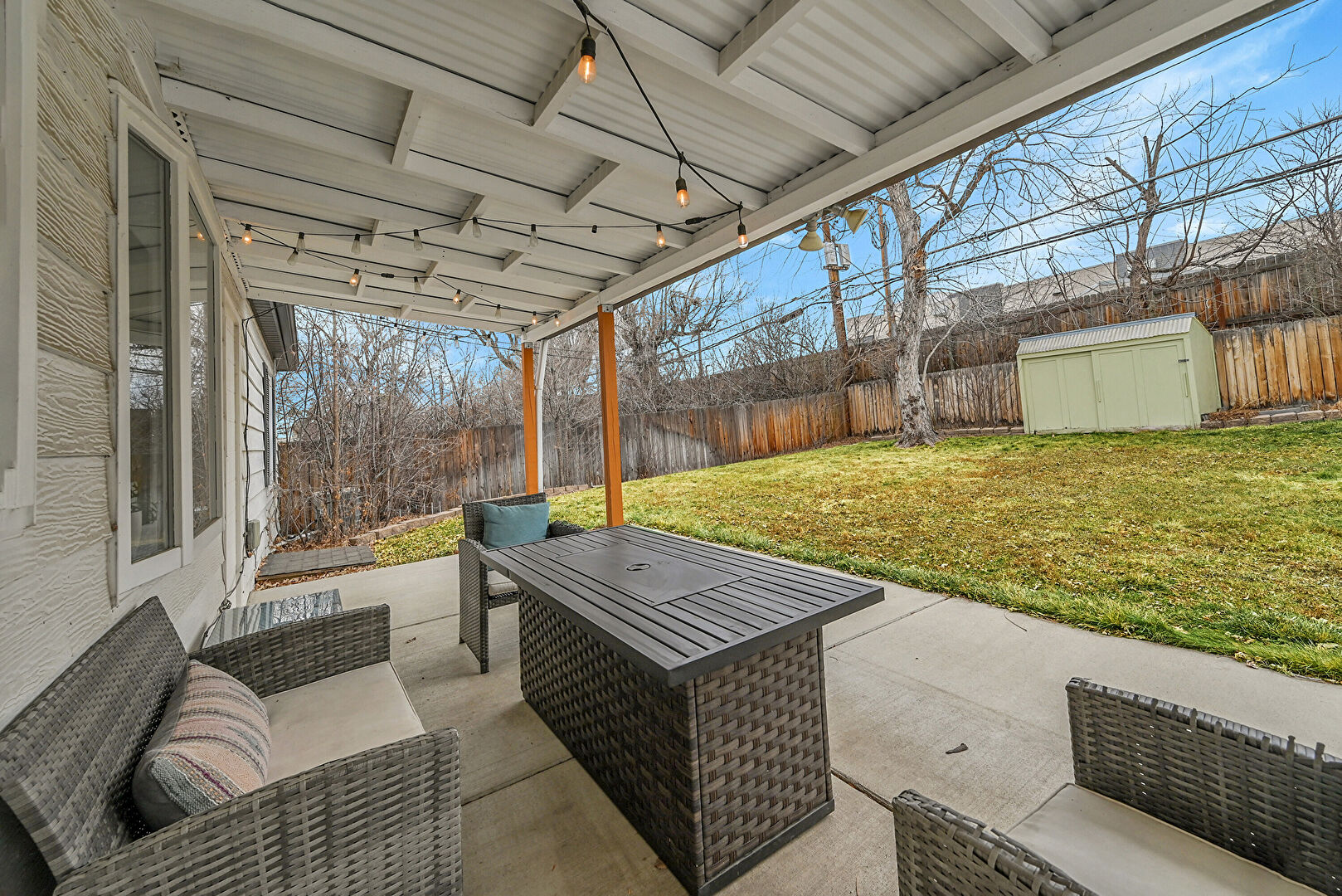 Fence, Lawn, Outdoor Living Space, Patio, Residential View, Shed, Outdoor Dining Area, Outdoor Structure, Porch