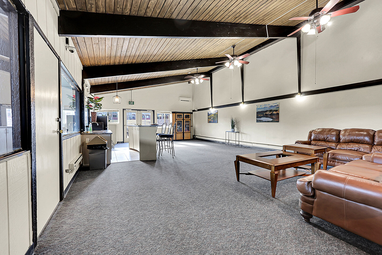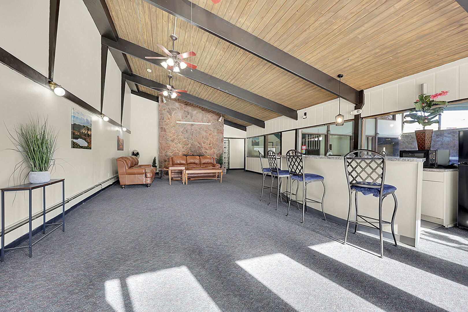 Baseboard Radiator, Baseboards Wall, Beamed Ceiling, Carpet, Ceiling Fan, Drywall, High Ceiling, Kitchen Bar, Natural Light, Pendant Lighting, Stone Countertops, Vaulted Ceiling, Wall Mounted Ac, Wood Ceiling, Carpet, Ceiling Fan, Natural Light