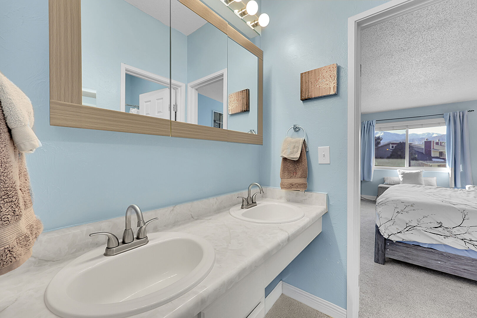 Baseboards Wall, Carpet, Double Vanity, Drywall, Ensuite Bathroom, Full Bathroom, Half Bathroom, Natural Light, Textured Ceiling, Textured Wall, Vanity, Carpet, Drywall, Natural Light, Vanity