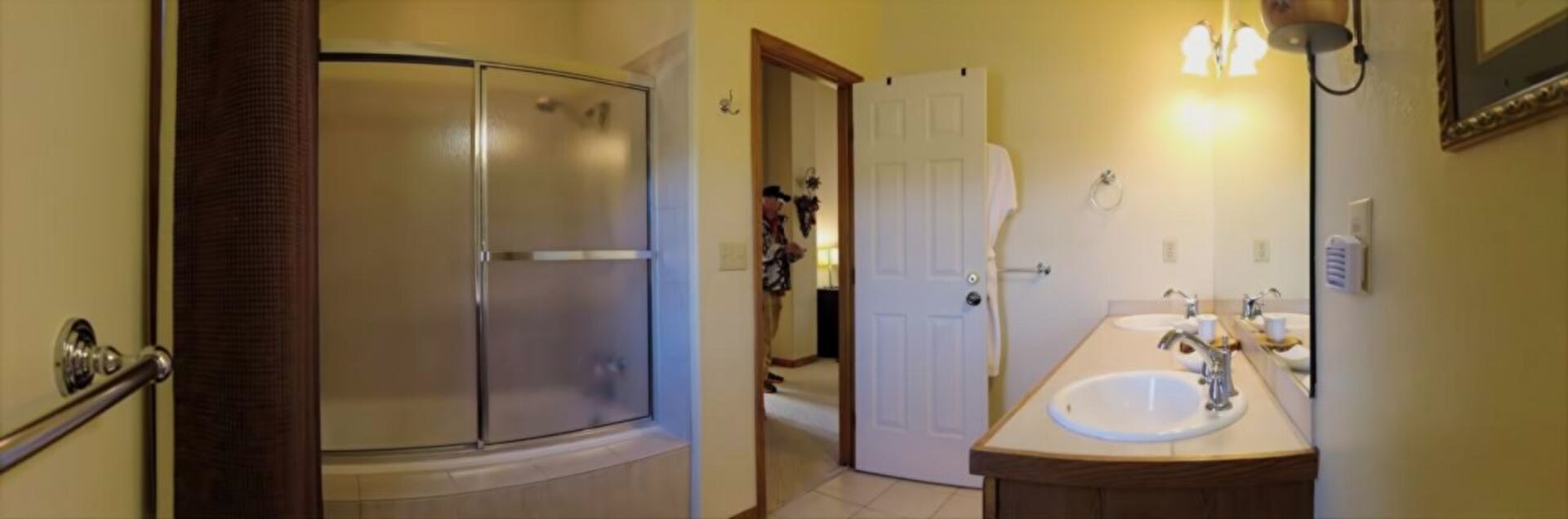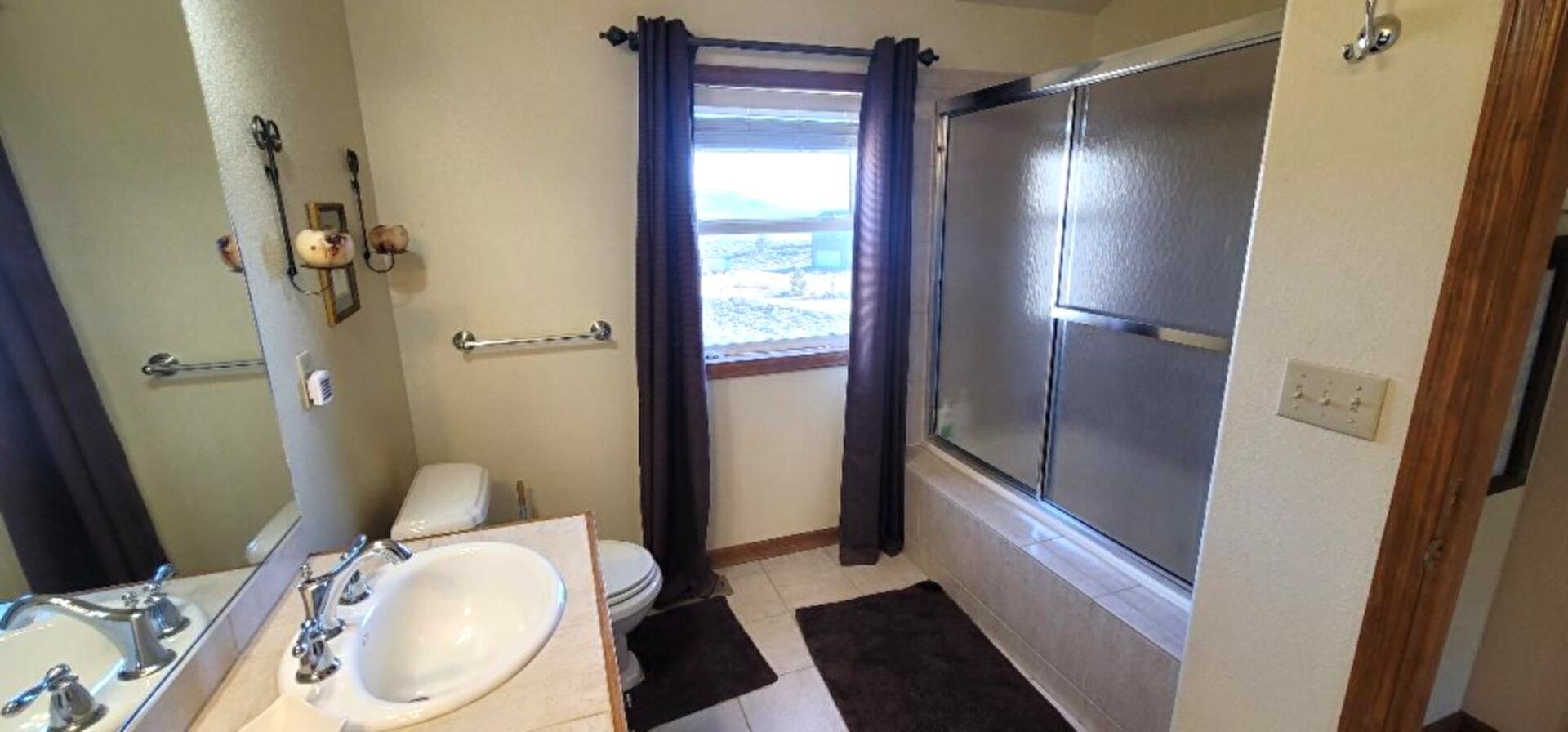 Baseboards Wall, Combined Bath Shower, Double Vanity, Drywall, Full Bathroom, Natural Light, Tile Floor, Vanity, Drywall, Full Bathroom, Tile Floor