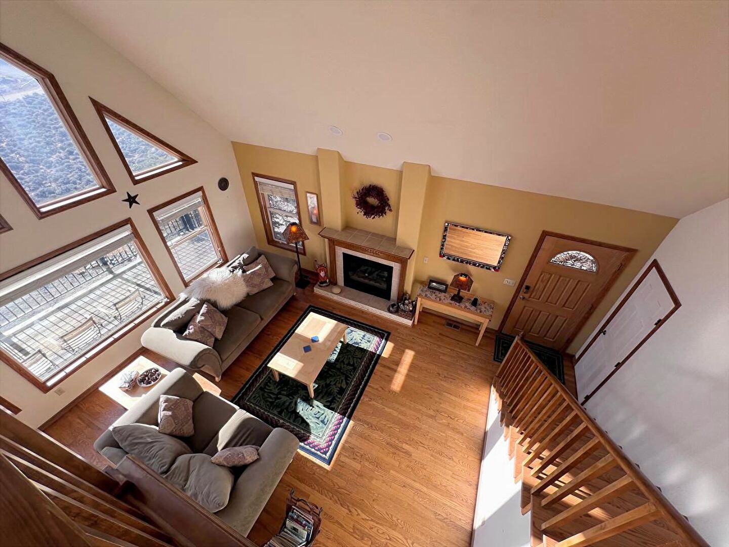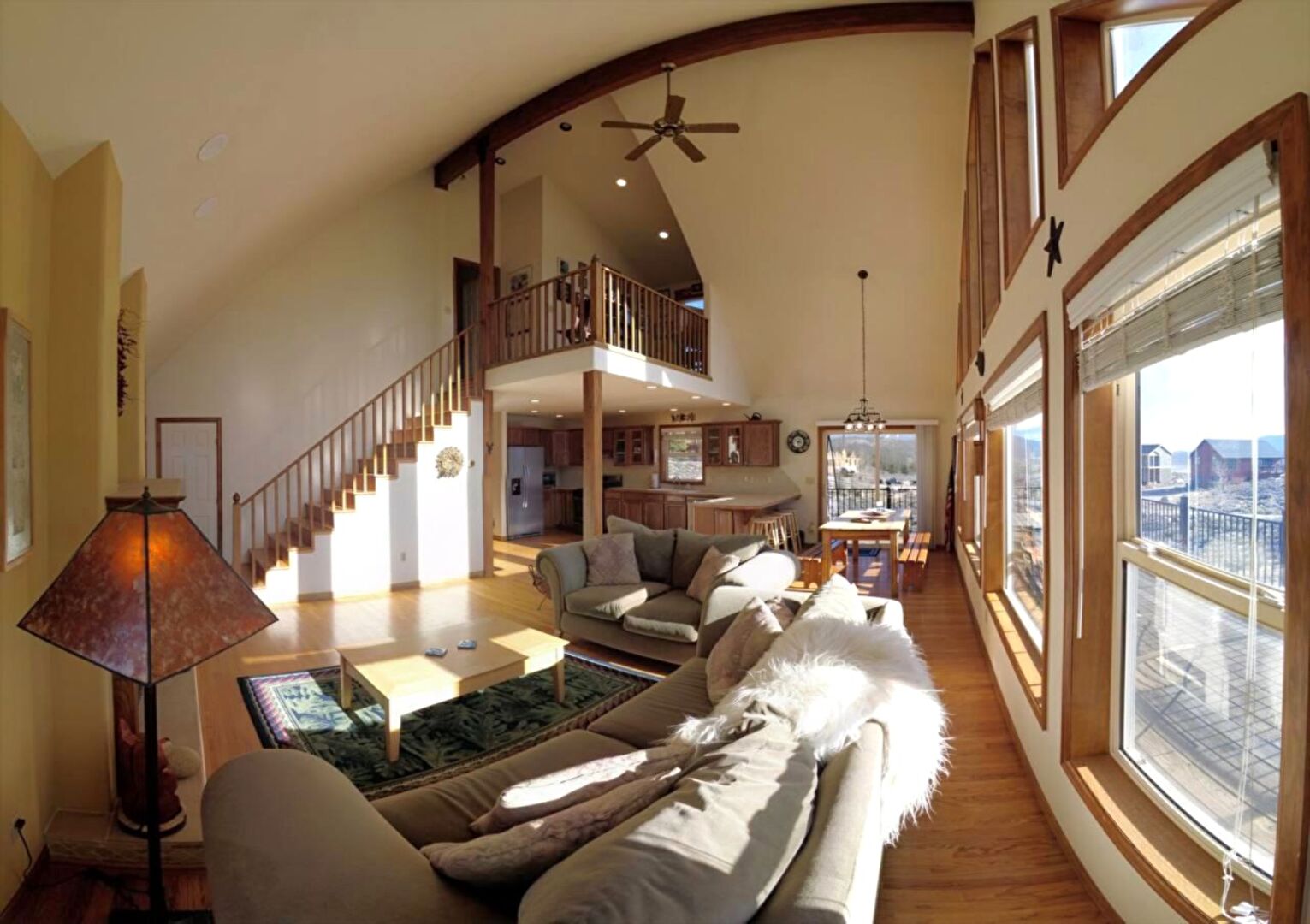 Baseboards Wall, Beamed Ceiling, Carpet, Ceiling Fan, Drywall, Fireplace, High Ceiling, Natural Light, Recessed Lighting, Stairs, Vaulted Ceiling, Vent, Wood Finish Floor, Baseboards Wall, Drywall, Recessed Lighting