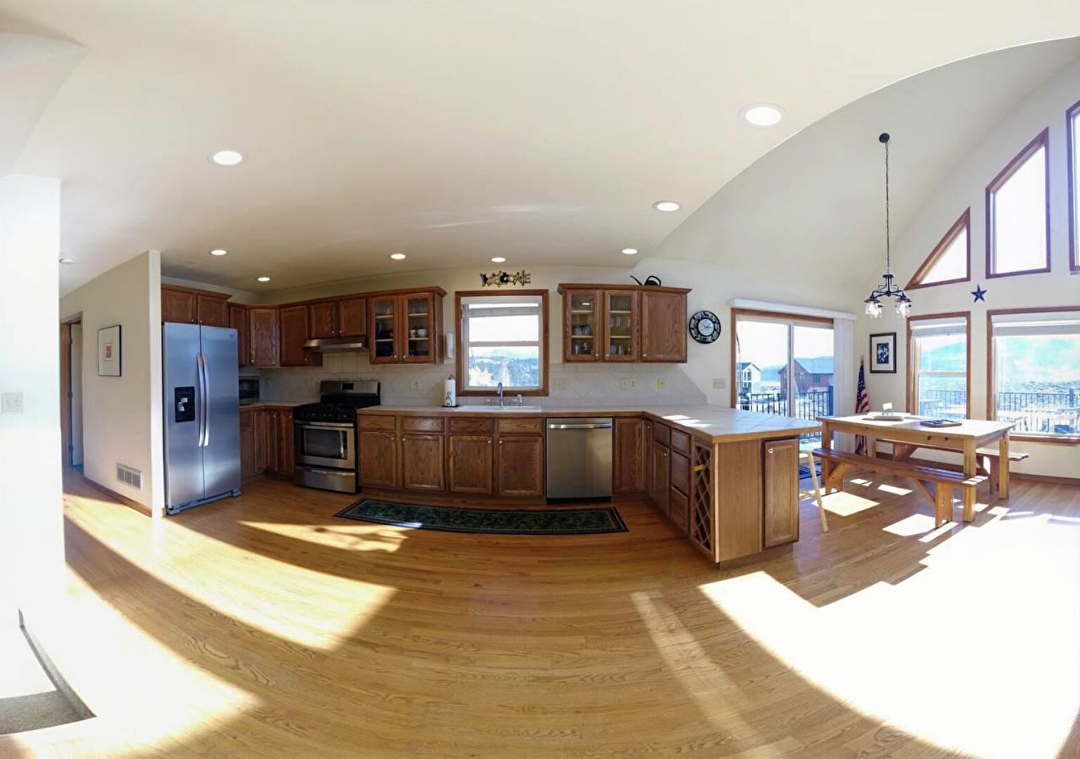Baseboards Wall, Crown Molding Cabinets, Drywall, Glass Insert Cabinets, High Ceiling, Kitchen Bar, Kitchen Peninsula, Medium Brown Cabinets, Natural Light, Notable Chandelier, Opens To Living Area, Pendant Lighting, Recessed Lighting, Shaker Cabinets, Tile Countertops, U Shaped Kitchen, Vaulted Ceiling, Vent, Wood Finish Floor, Medium Brown Cabinets, Recessed Lighting