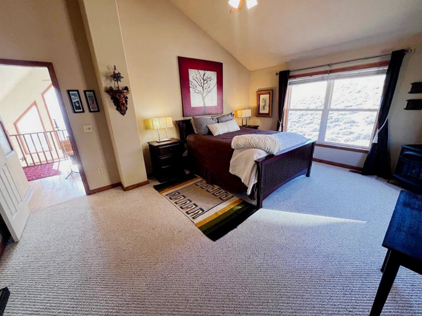 Baseboards Wall, Carpet, Ceiling Fan, Closet, Drywall, High Ceiling, Natural Light, Vaulted Ceiling, Wood Stove, Carpet, Closet, Vaulted Ceiling