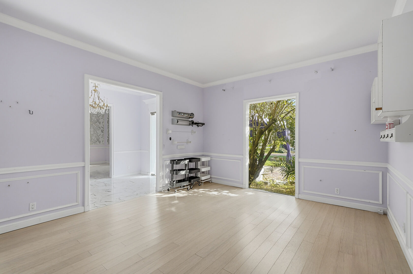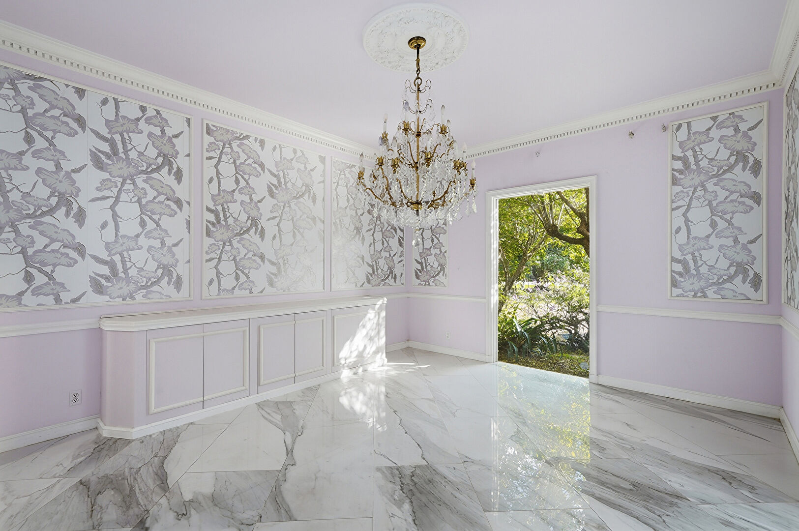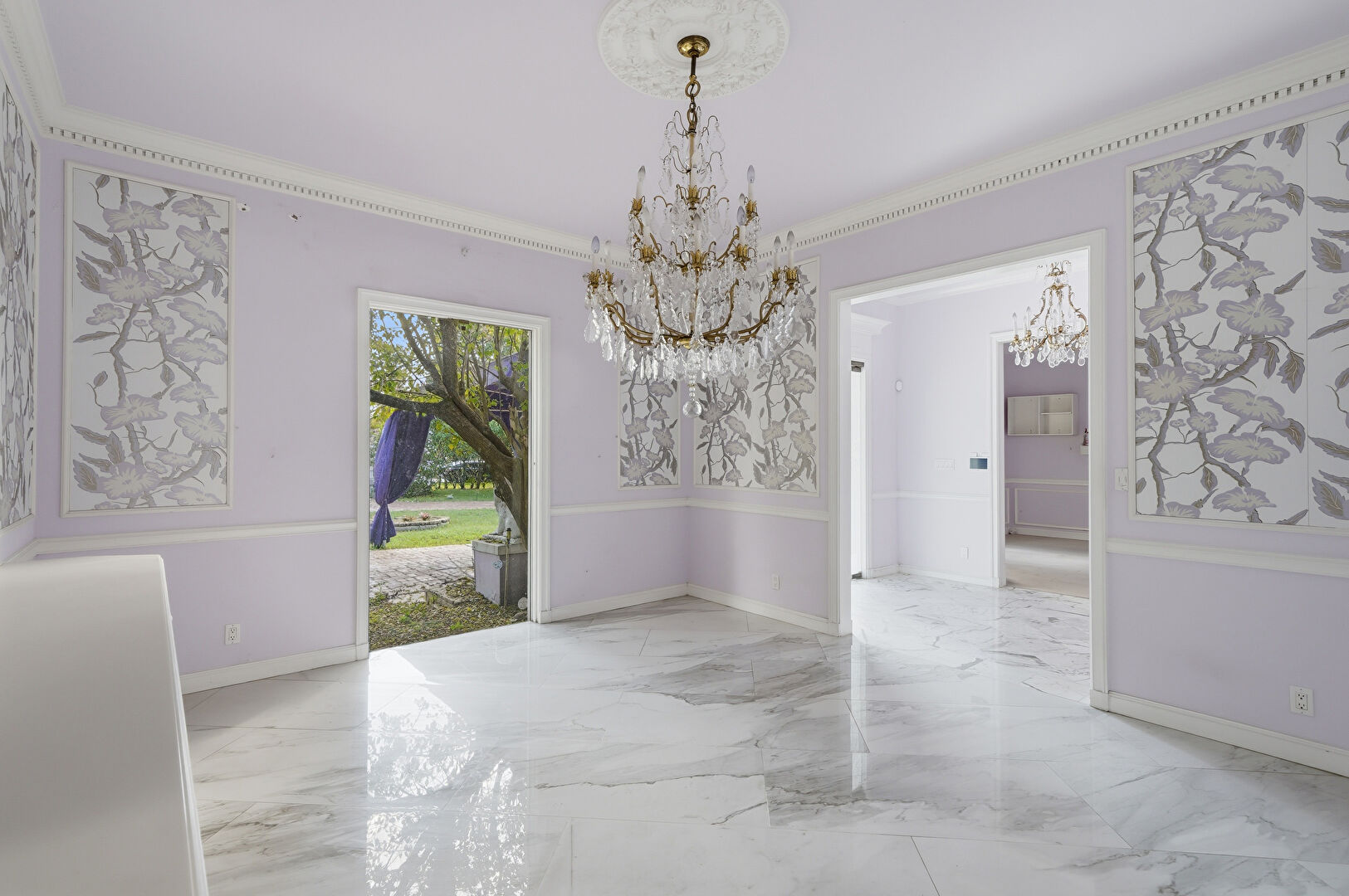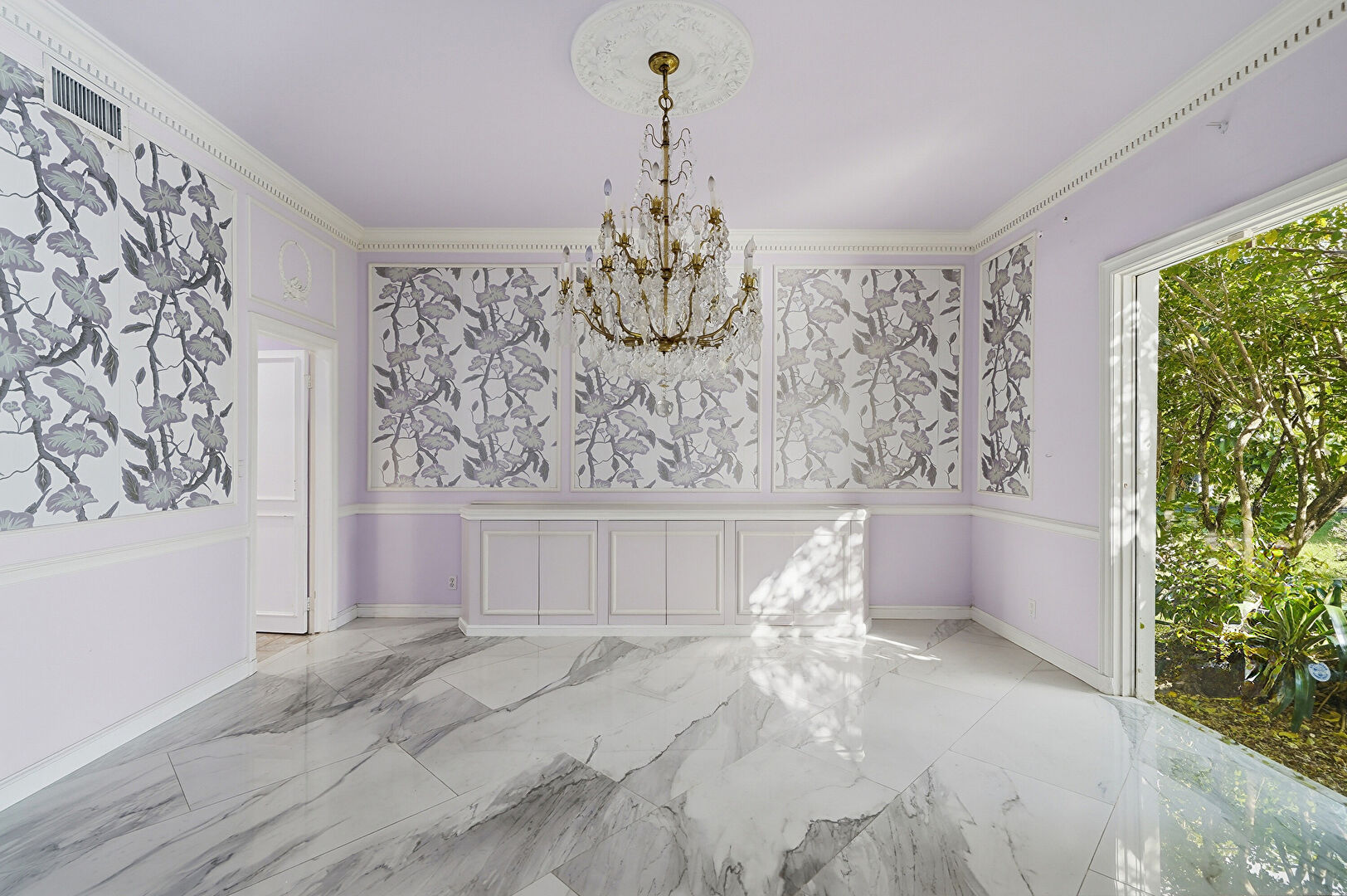 Baseboards Wall, Crown Molding, Drywall, Marble Finish Floor, Natural Light, Notable Chandelier, Paneling Wall, Vent, Wainscot Wall, Baseboards Wall, Crown Molding, Natural Light