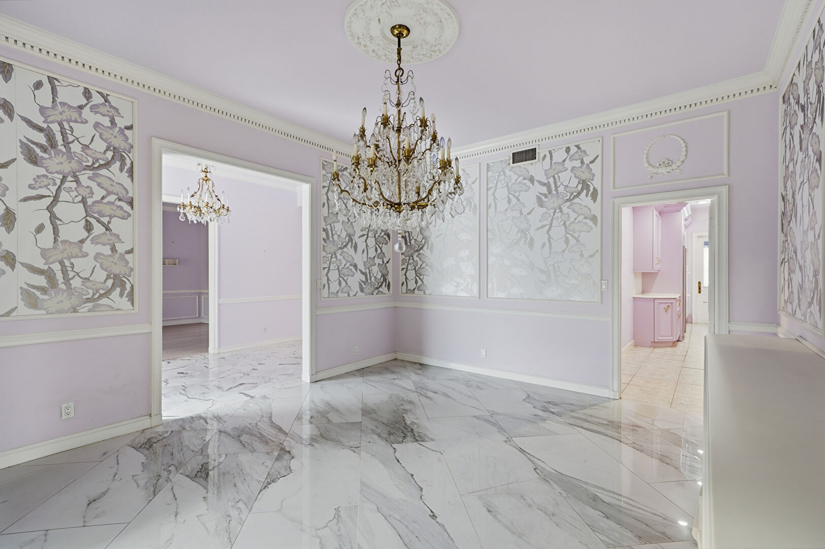 Baseboards Wall, Crown Molding, Drywall, Marble Finish Floor, Natural Light, Notable Chandelier, Paneling Wall, Vent, Wainscot Wall, Drywall, Marble Finish Floor