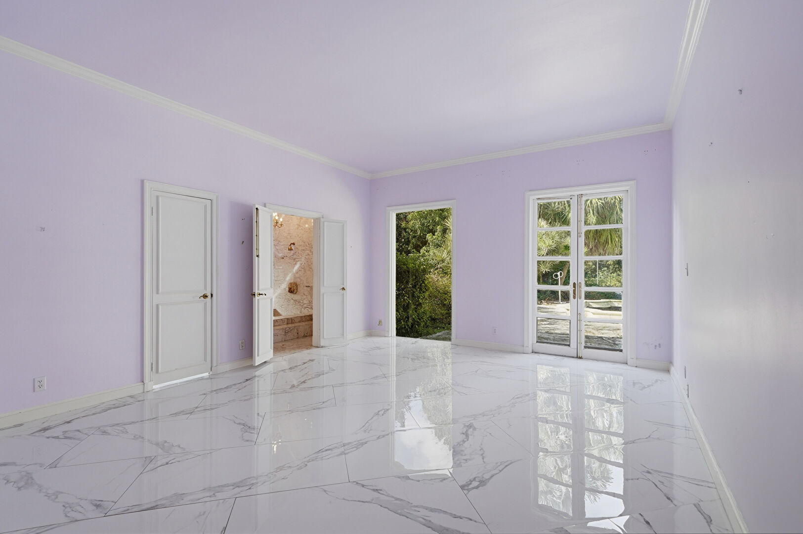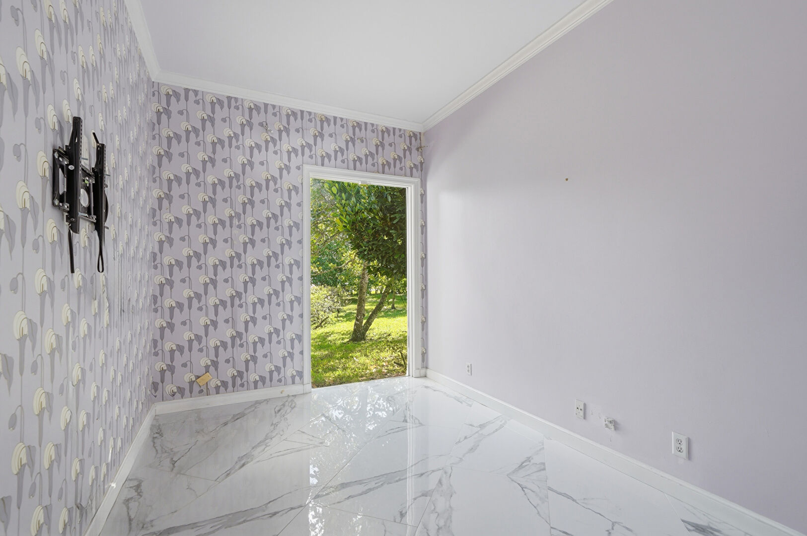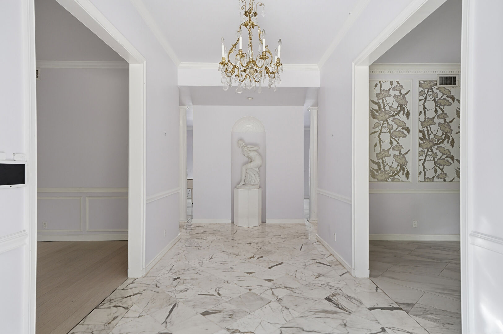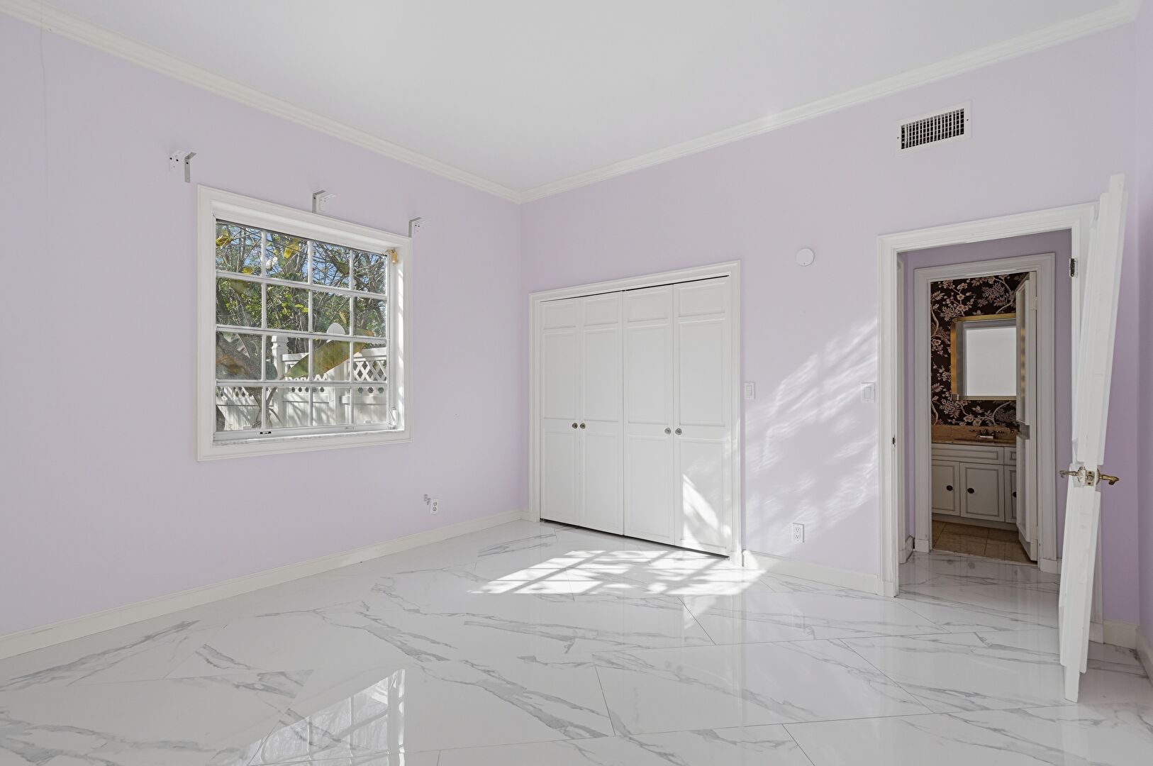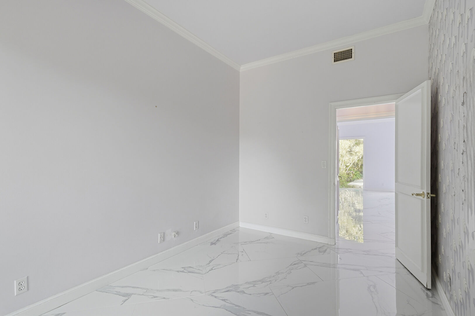 Baseboards Wall, Crown Molding, Marble Finish Floor, Natural Light, Vent, Wallpaper Wall, Drywall, Wallpaper Wall