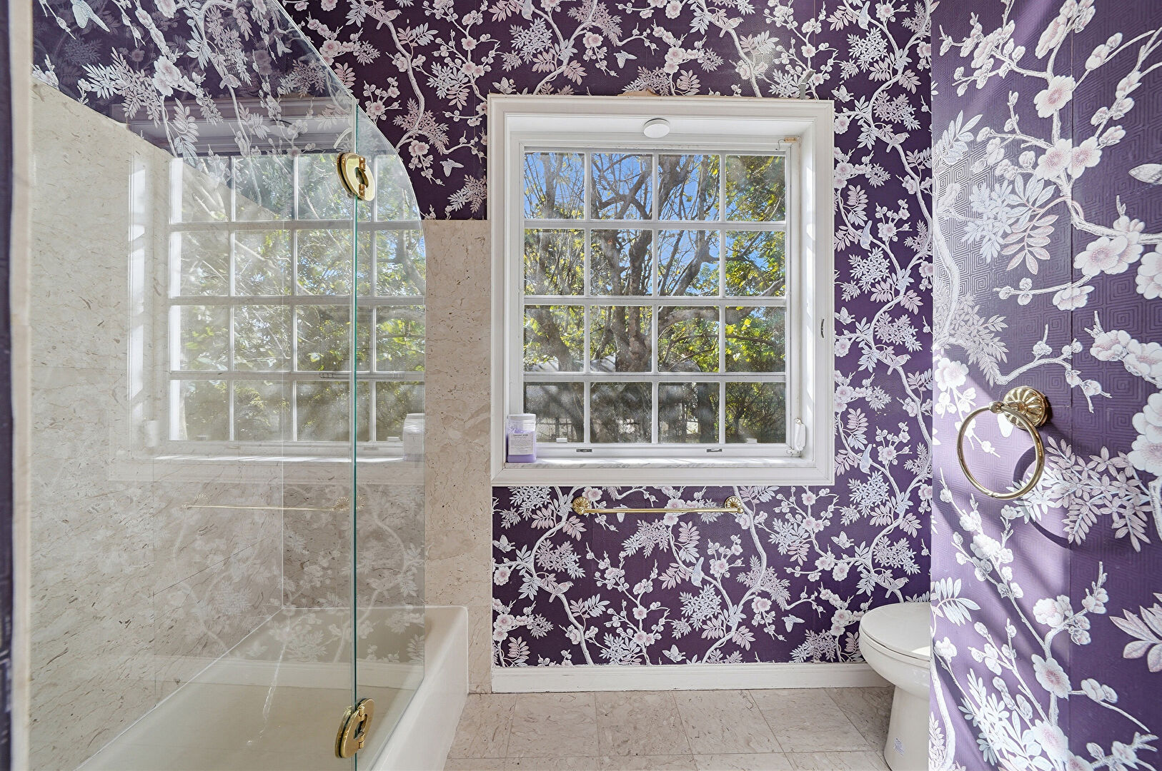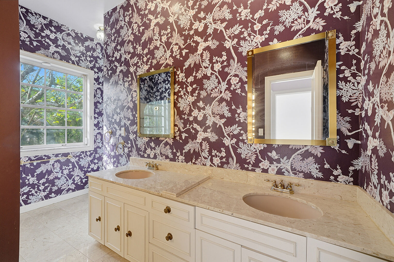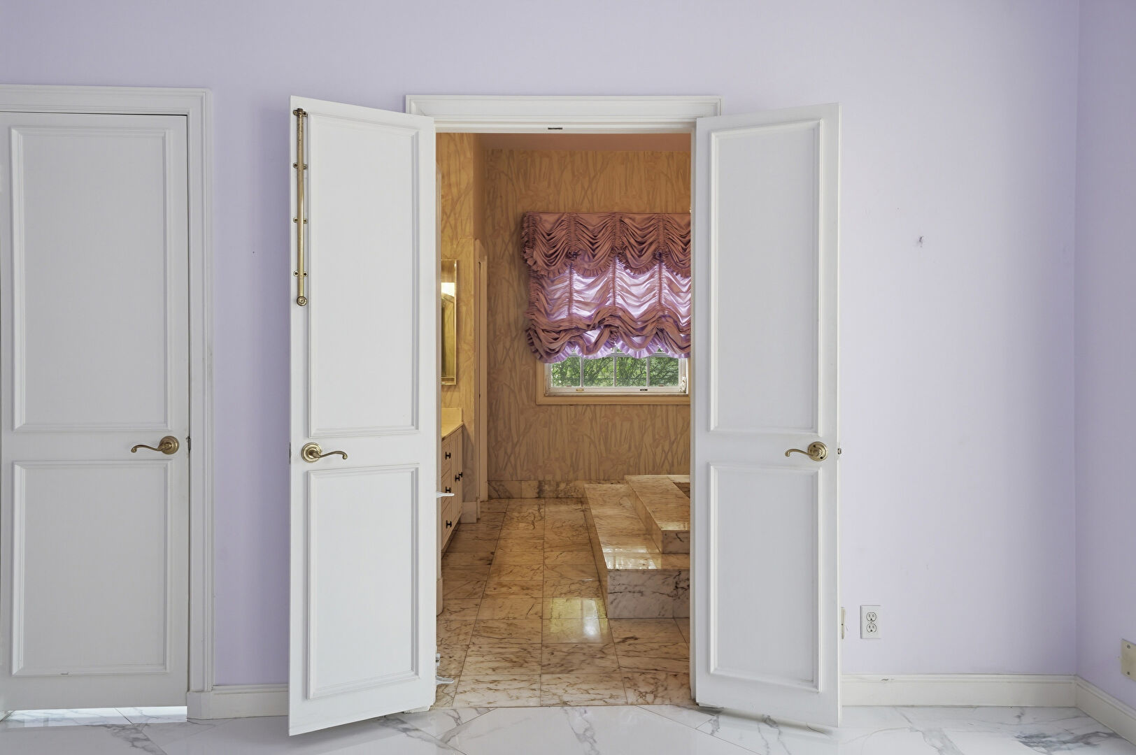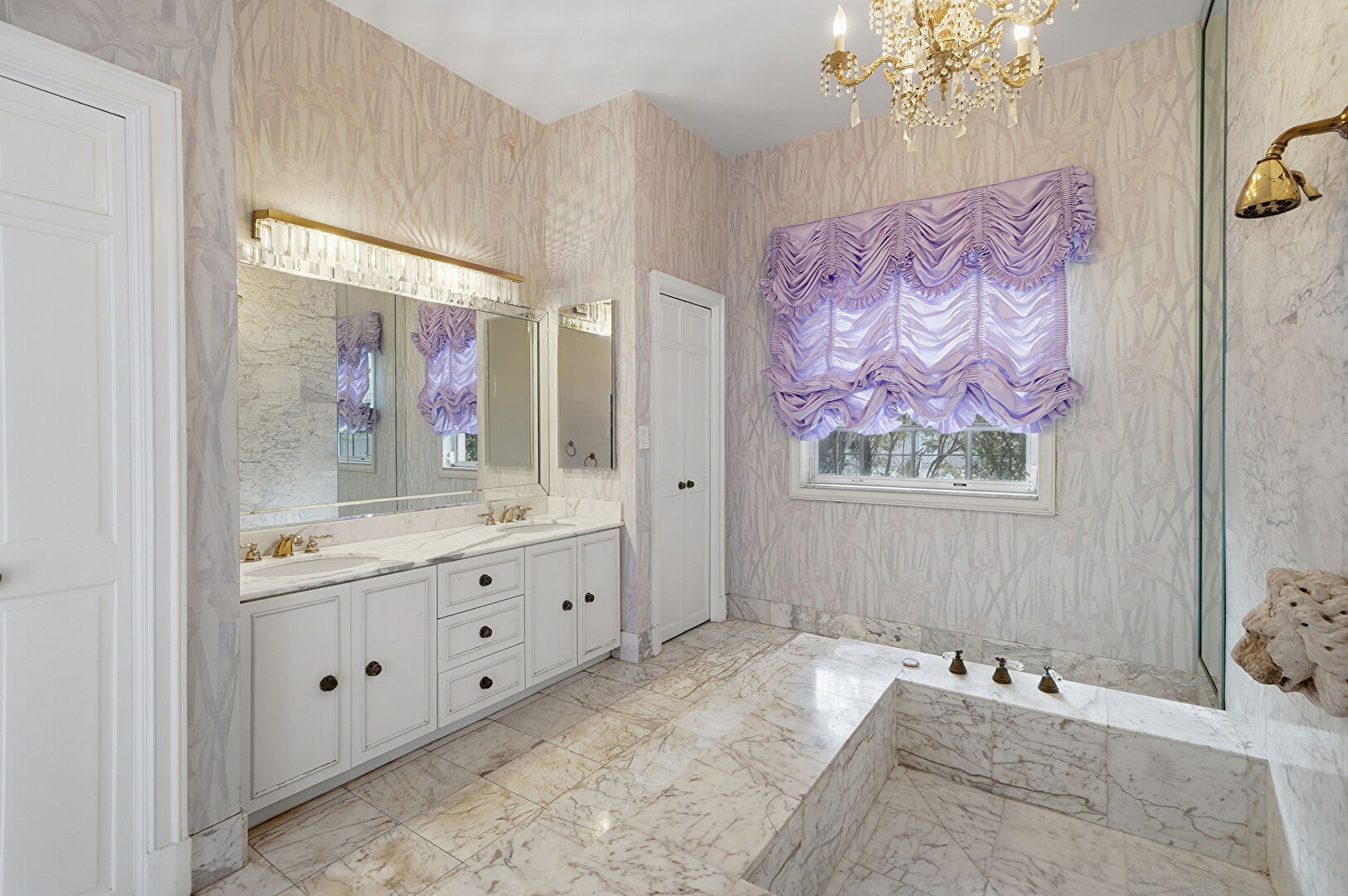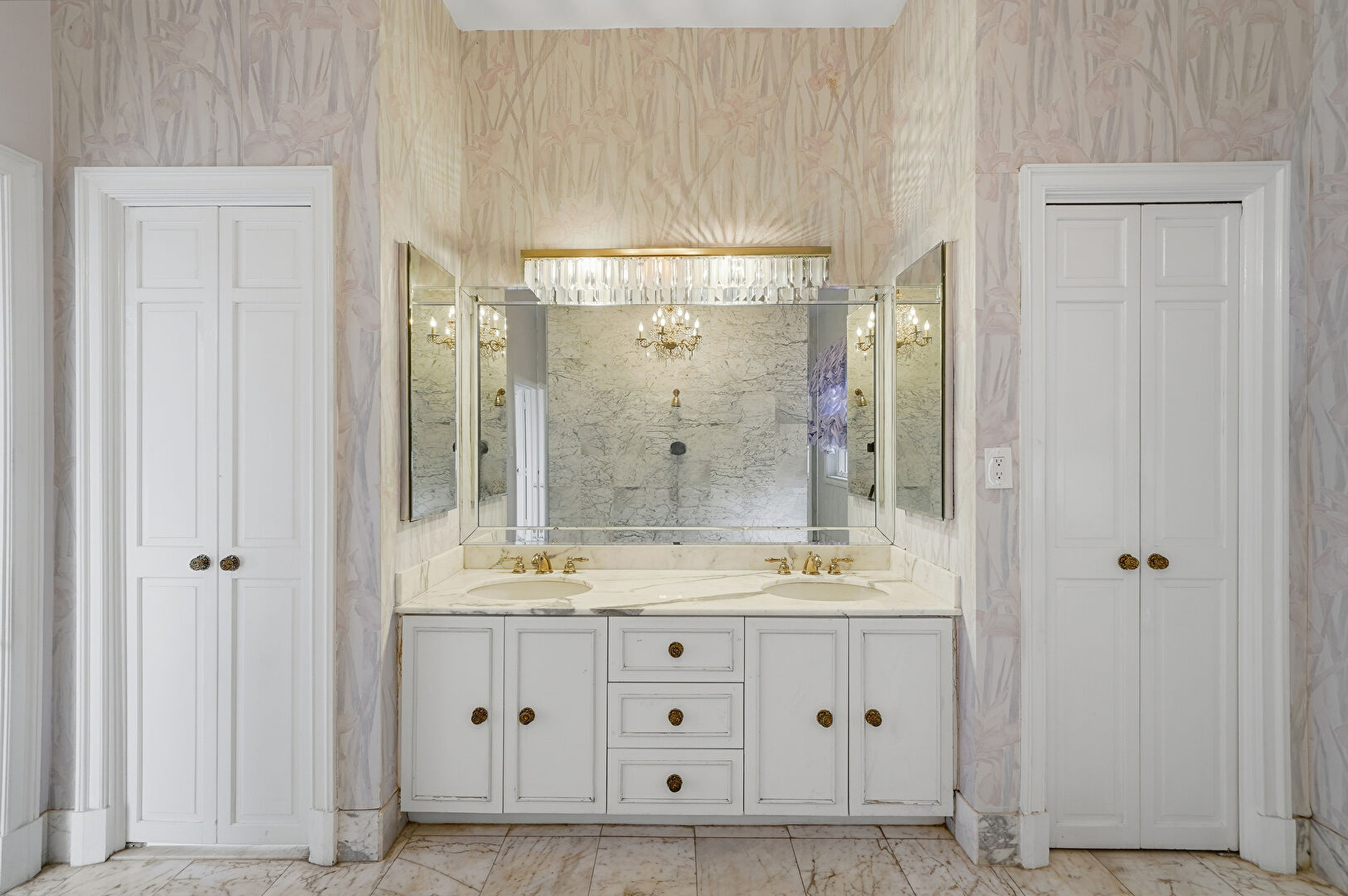 Baseboards Wall, Double Vanity, Drywall, Full Bathroom, Marble Finish Floor, Natural Light, Notable Chandelier, Vanity, Wallpaper Wall, Closet, Full Bathroom, Half Bathroom, Natural Light, Wallpaper Wall