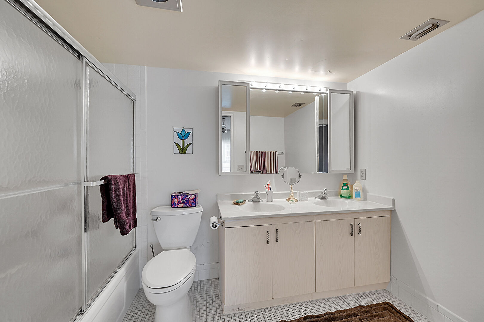 Baseboards Wall, Combined Bath Shower, Double Vanity, Drywall, Tile Floor, Vent, Full Bathroom