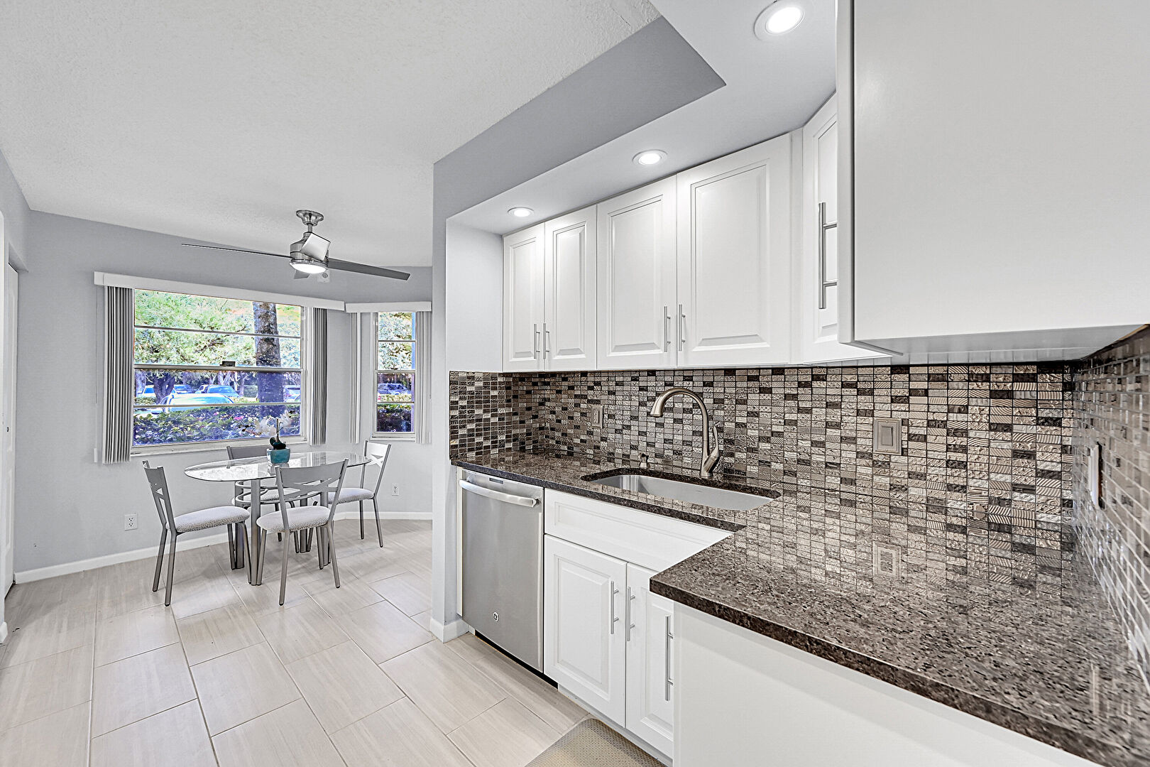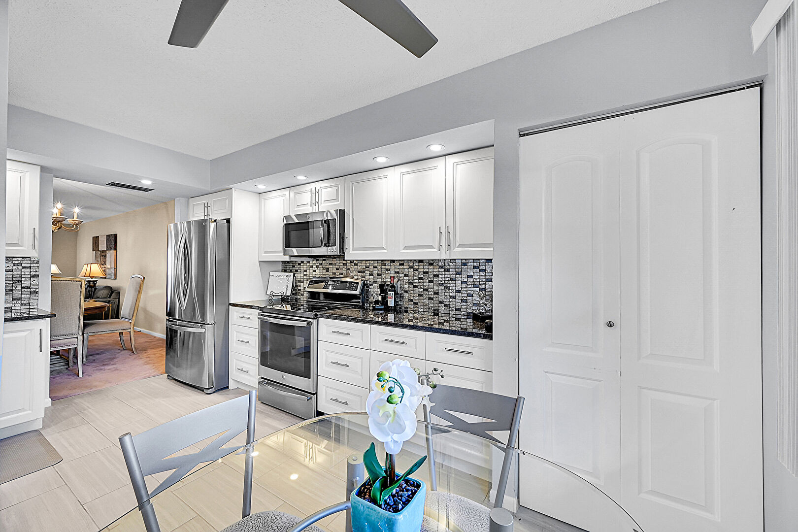 Baseboards Wall, Ceiling Fan, Drywall, Natural Light, Notable Chandelier, Pendant Lighting, Raised Cabinets, Recessed Lighting, Stone Countertops, Tile Floor, Vent, Natural Light, Recessed Lighting