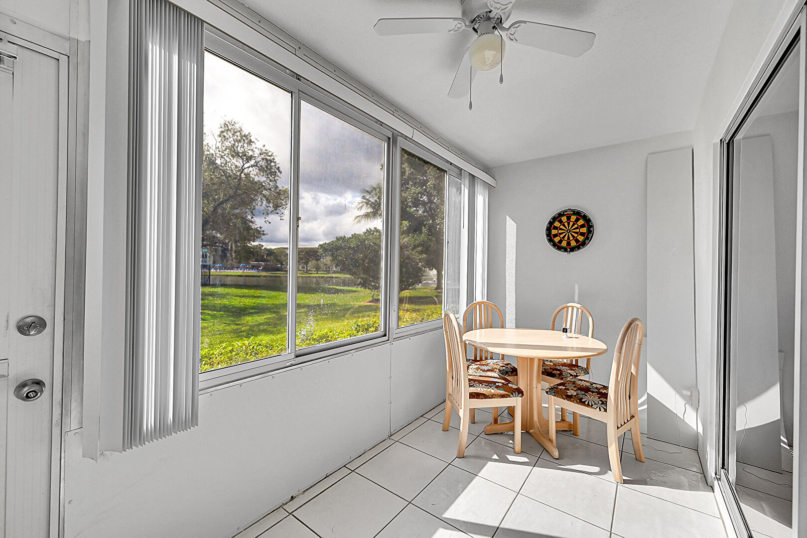 Carpet, Drywall, Natural Light, Outdoor Dining Area, Sunroom, Tile Floor, Ceiling Fan, Natural Light, Textured Wall