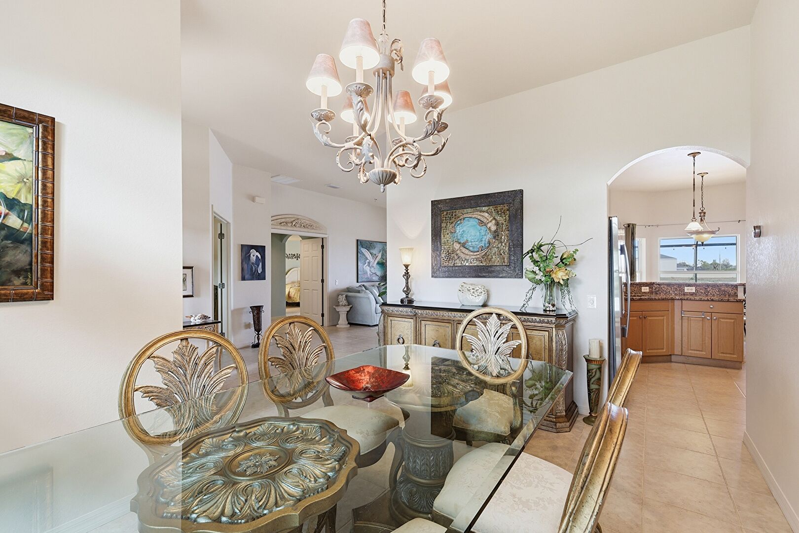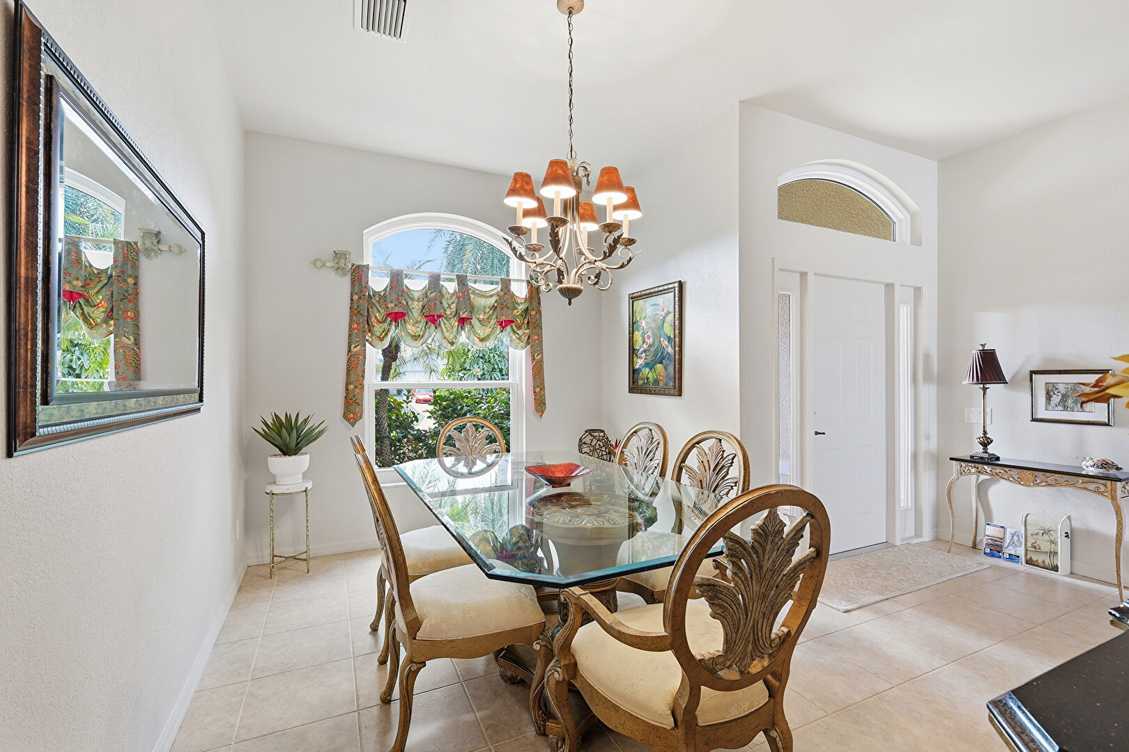 Arched Walkways, Baseboards Wall, Drywall, Natural Light, Notable Chandelier, Tile Floor, Vent, Drywall, Notable Chandelier