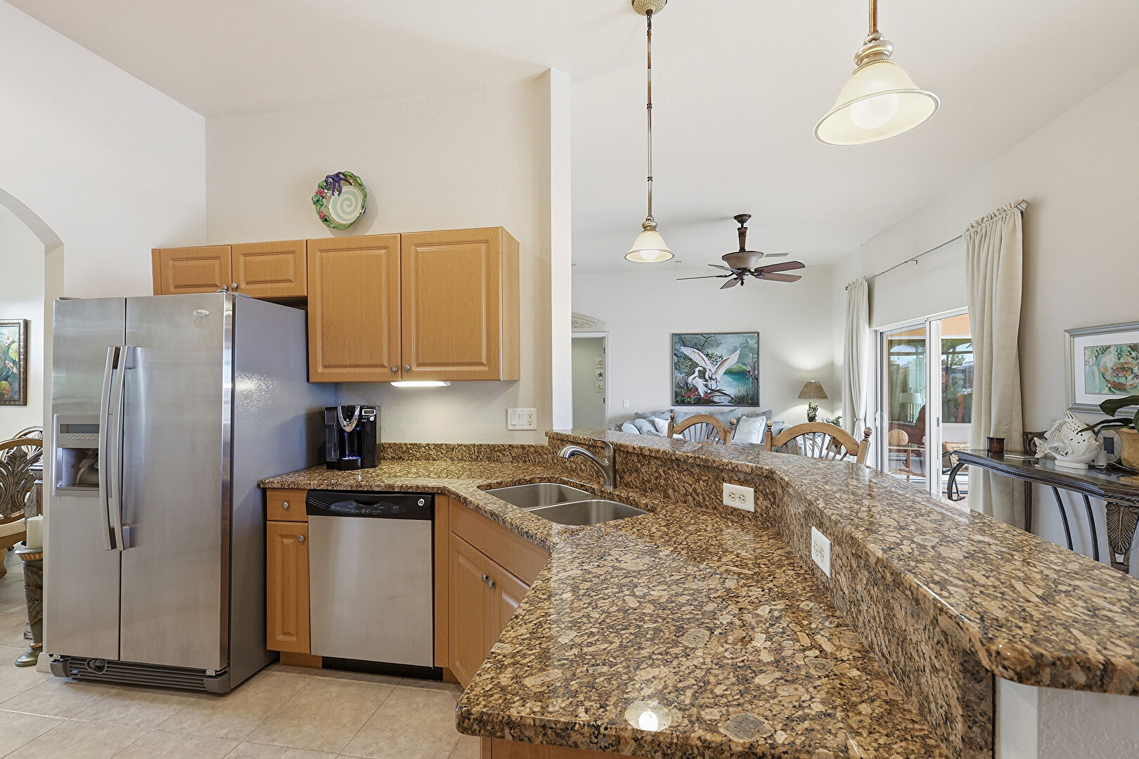 Arched Walkways, Baseboards Wall, Drywall, High Ceiling, Kitchen Bar, Kitchen Peninsula, Medium Brown Cabinets, Natural Light, Pendant Lighting, Raised Cabinets, Recessed Lighting, Stone Countertops, Tile Floor, U Shaped Kitchen, Vent, Ceiling Fan, Kitchen Peninsula, Notable Chandelier, Pendant Lighting, Stone Countertops