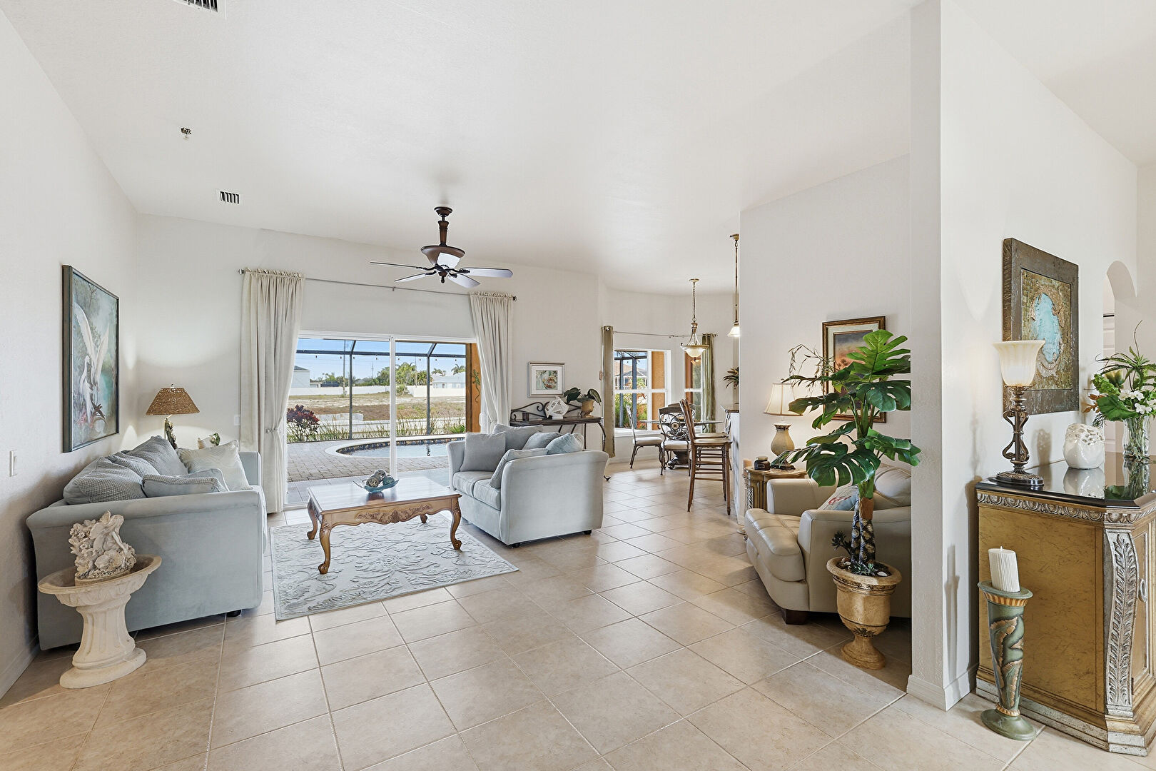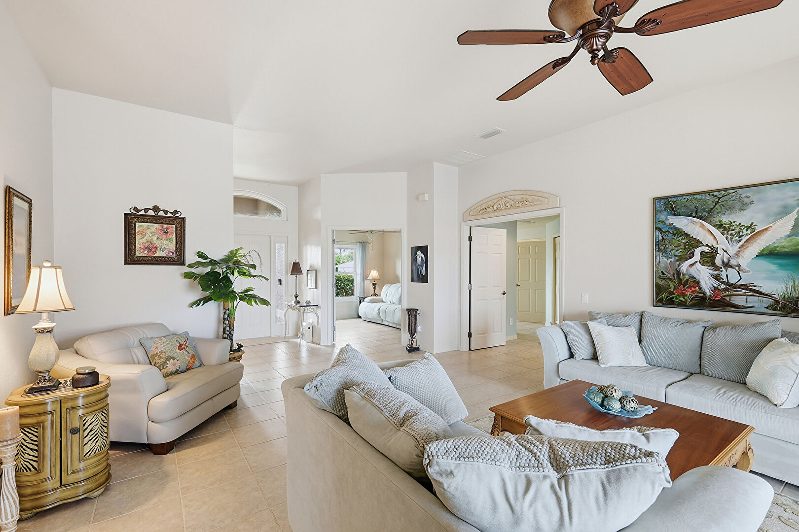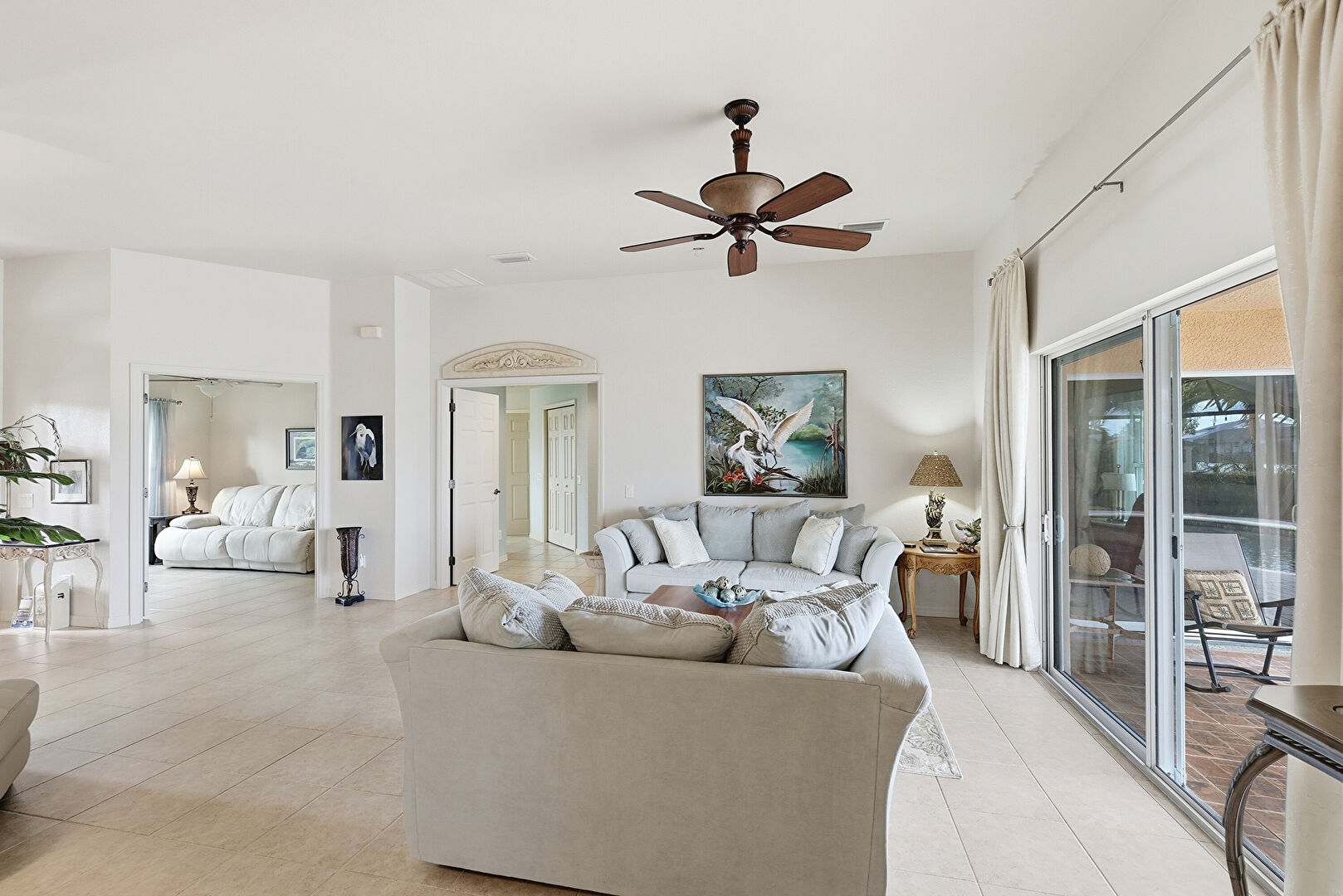 Arched Walkways, Ceiling Fan, Drywall, Natural Light, Notable Chandelier, Tile Floor, Vent, Baseboards Wall, Ceiling Fan, Natural Light, Vent