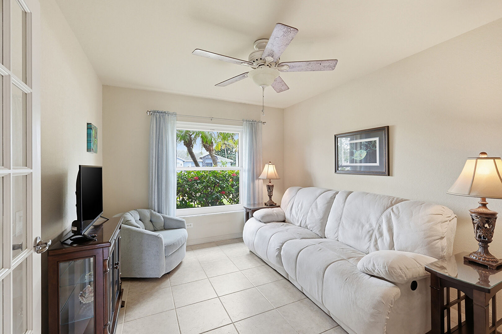 Baseboards Wall, Drywall, Natural Light, Sunroom, Tile Floor, Ceiling Fan