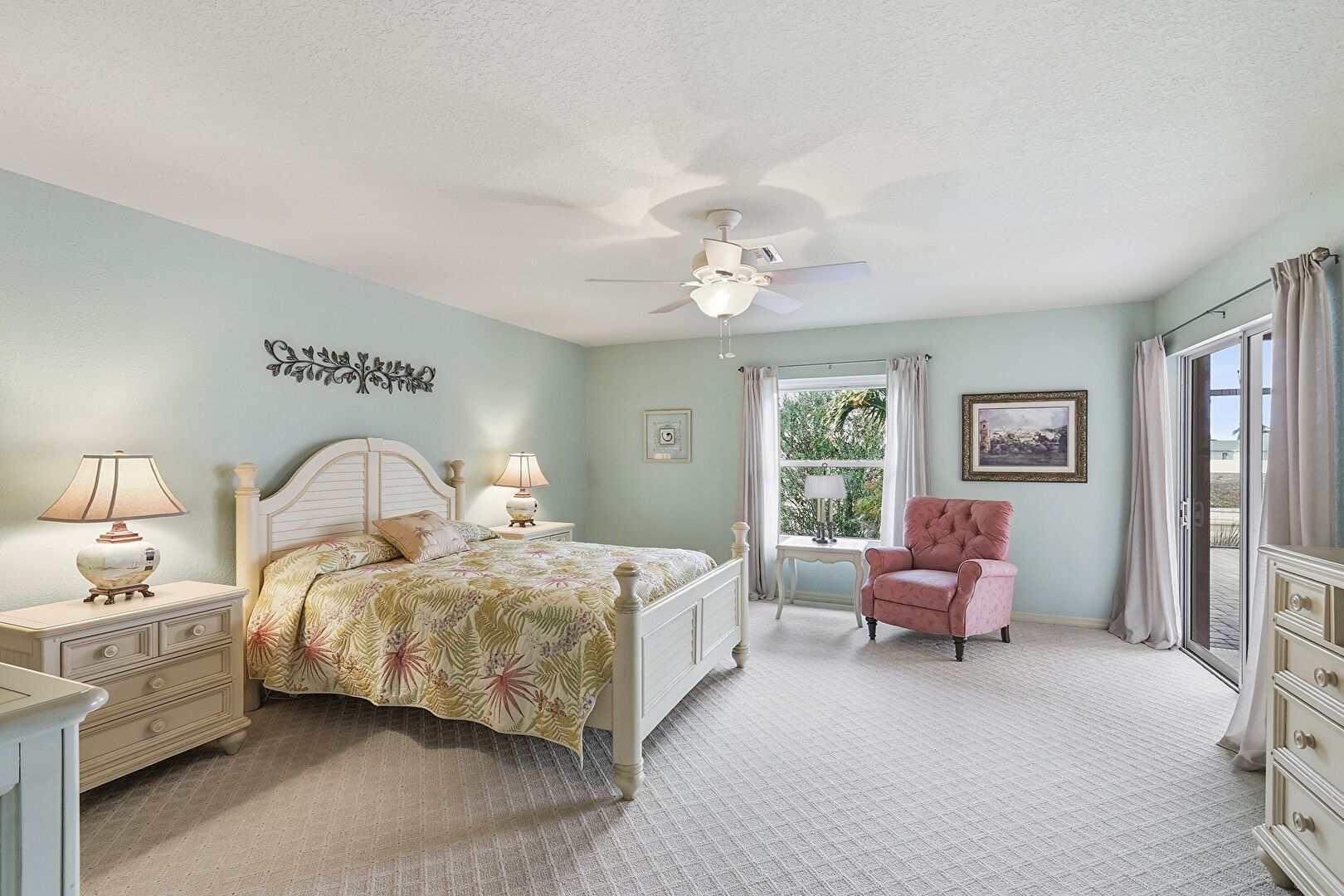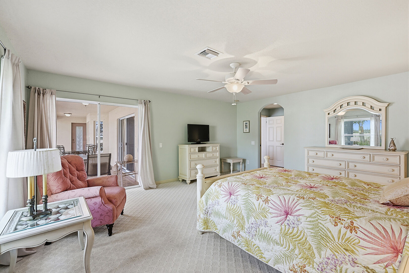 Access To Exterior, Arched Walkways, Baseboards Wall, Carpet, Ceiling Fan, Closet, Drywall, Natural Light, Textured Ceiling, Vent, Carpet, Ceiling Fan, Drywall, Natural Light, Smoke Carbon Monoxide Detector, Vent