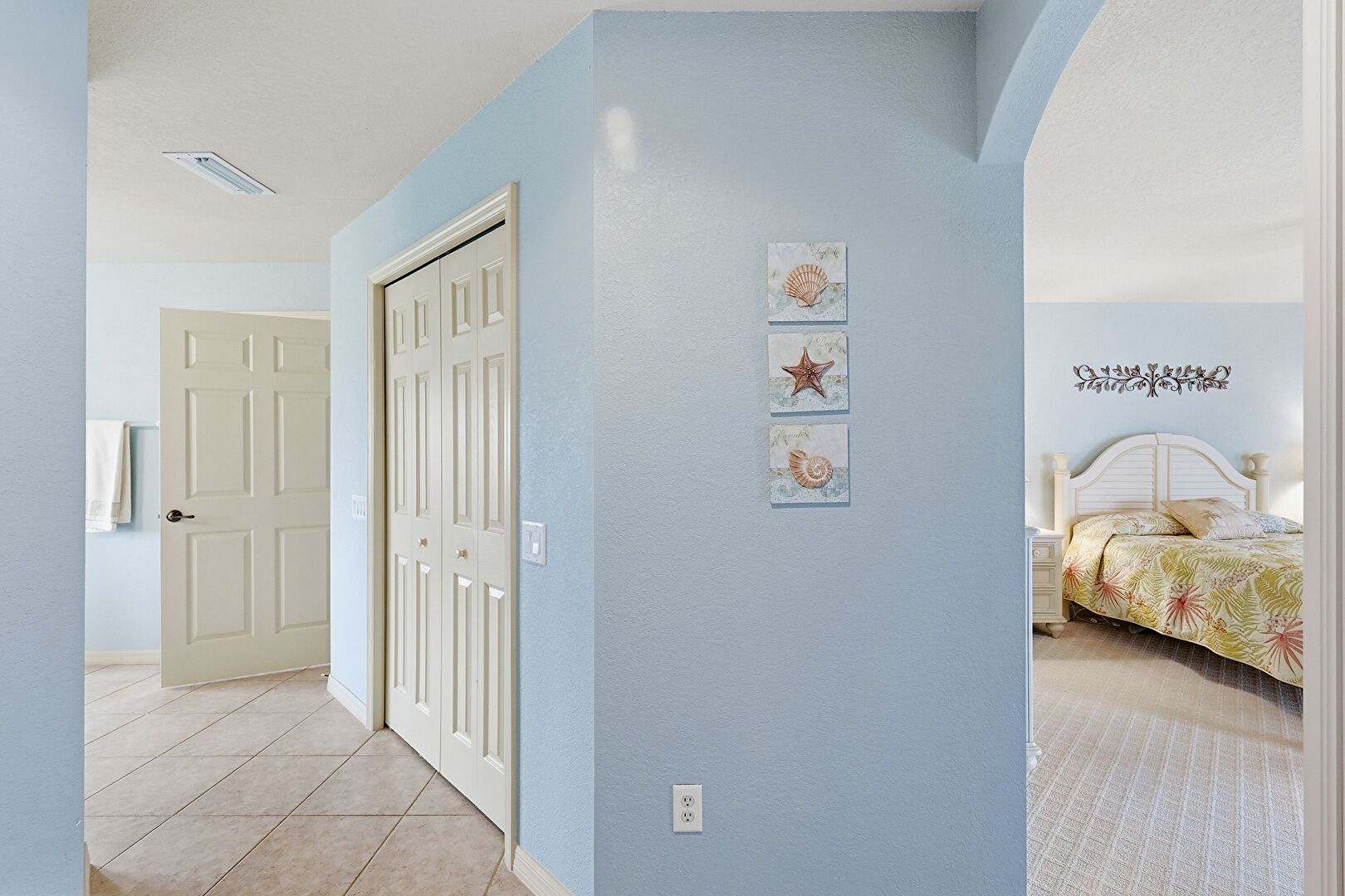 Arched Walkways, Baseboards Wall, Carpet, Drywall, Textured Wall, Tile Floor, Vent