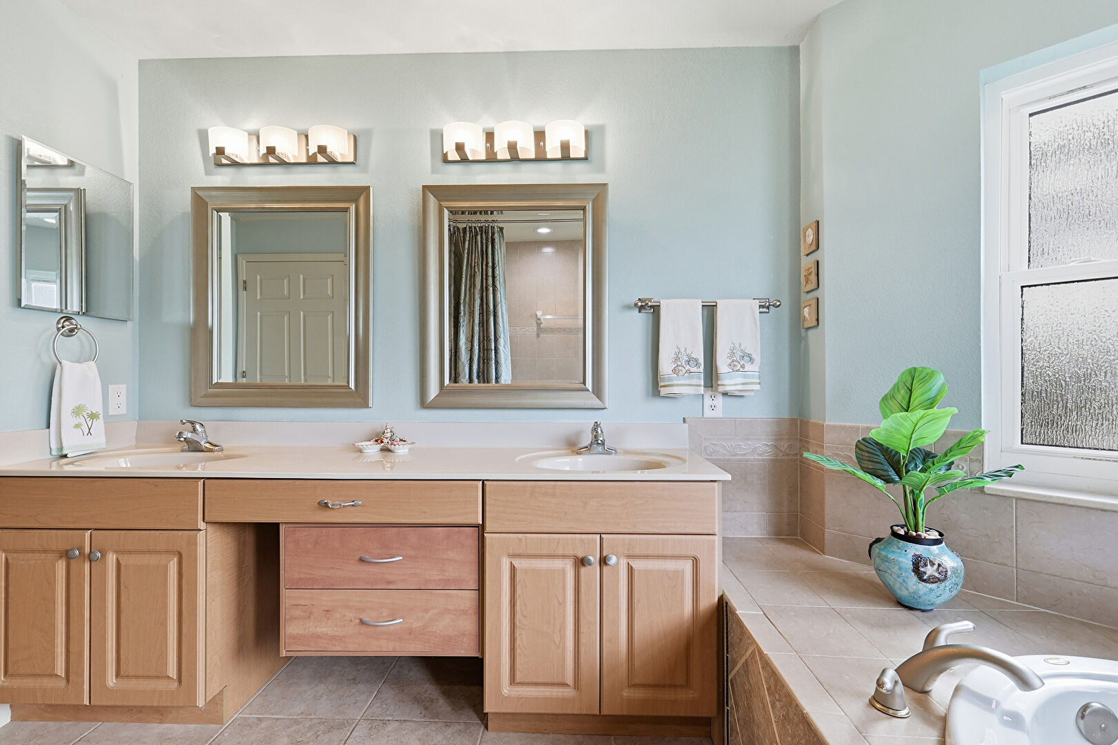 Baseboards Wall, Combined Bath Shower, Double Vanity, Drywall, Full Bathroom, Natural Light, Recessed Lighting, Textured Wall, Tile Floor, Vent, Double Vanity, Drywall, Natural Light, Tile Floor, Vanity