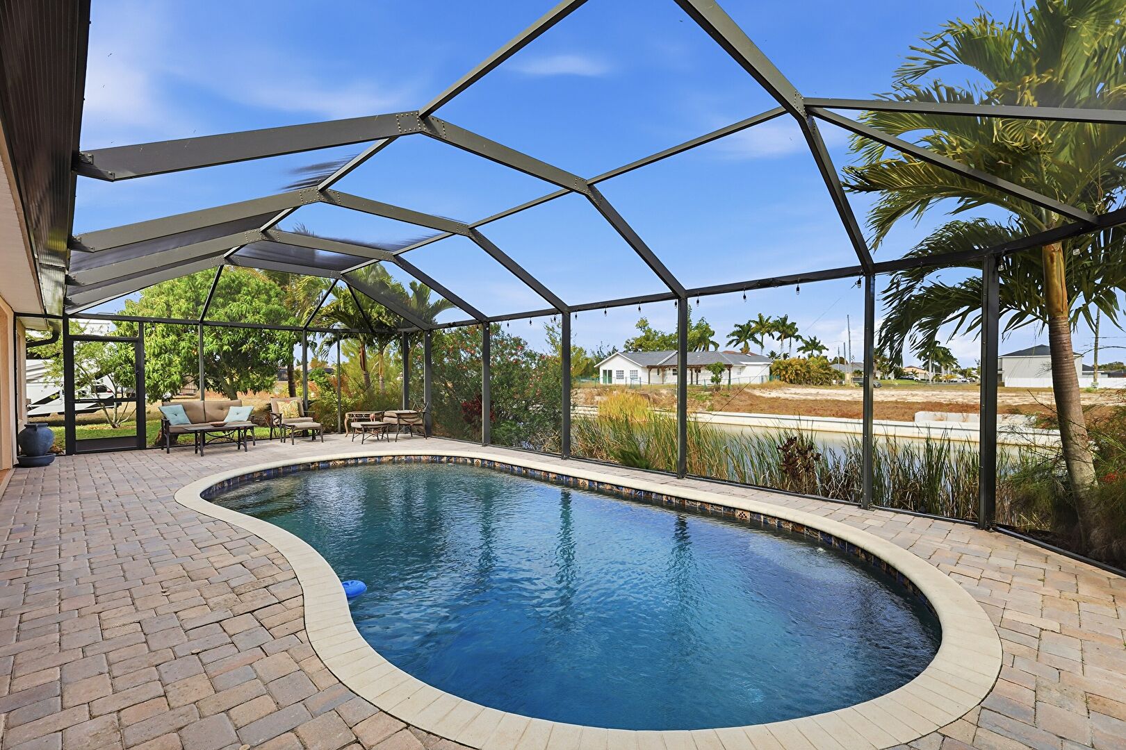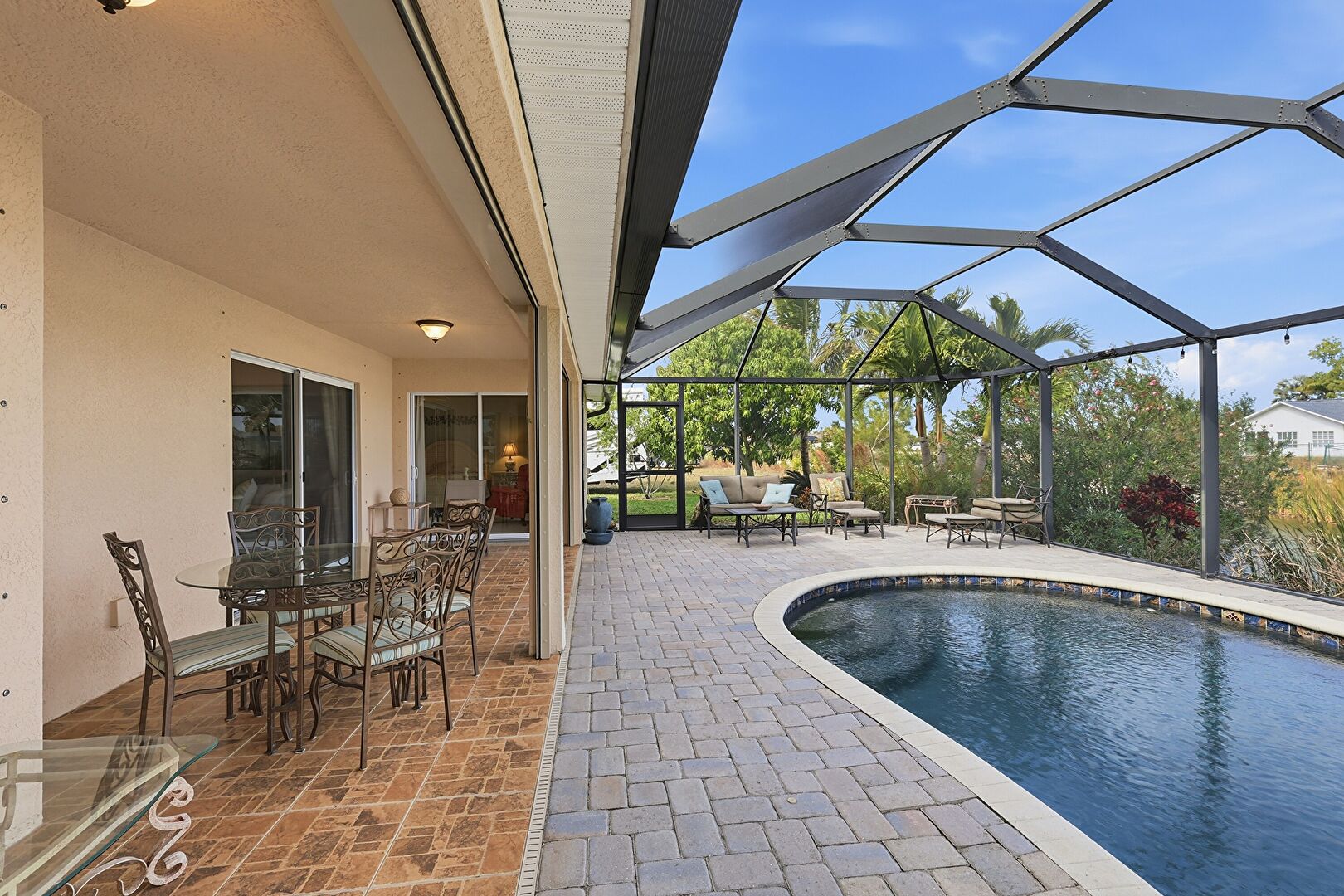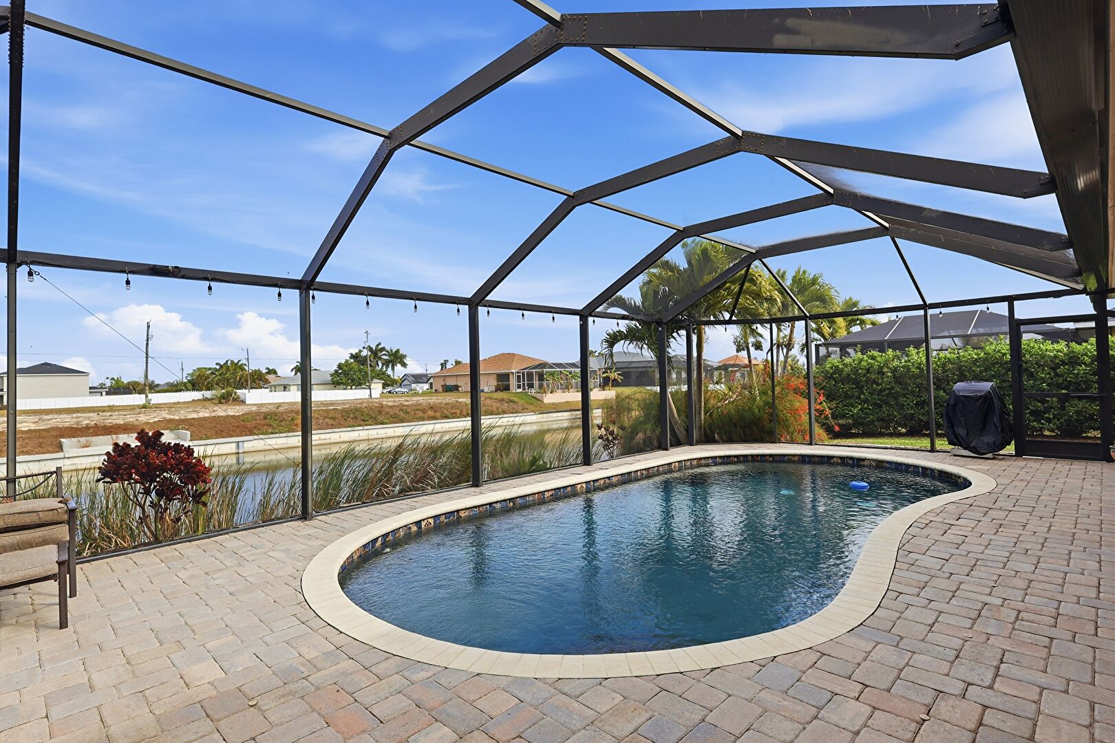 Grill, Lanai, Outdoor Dining Area, Outdoor Living Space, Patio, Pool, Residential View, Sunroom, Water View, Waterfront, Lanai, Patio, Sunroom