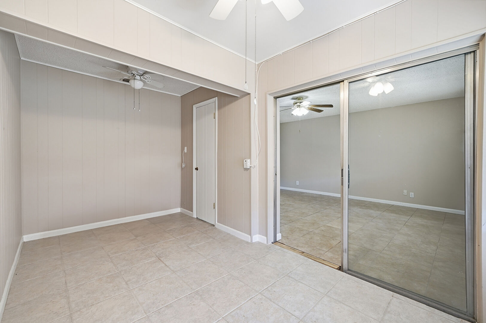 Baseboards Wall, Ceiling Fan, Closet, Tile Floor, Natural Light, Wood Wall
