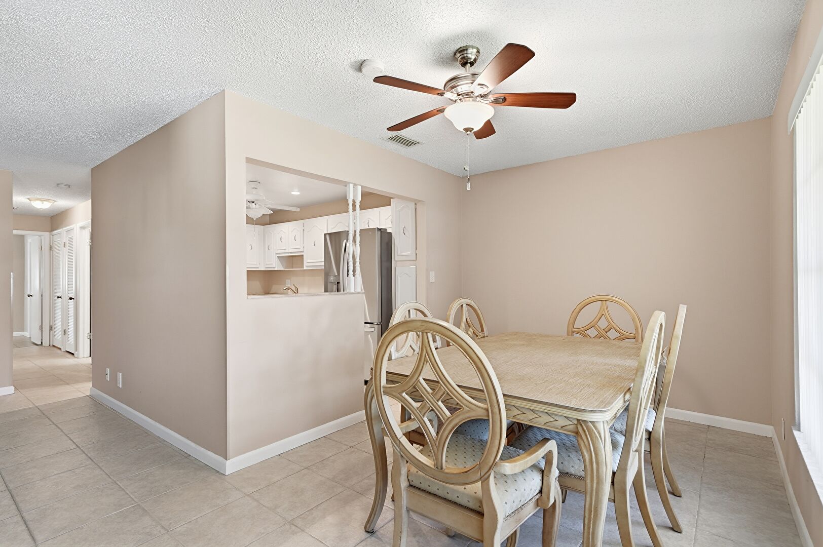 Baseboards Wall, Ceiling Fan, Natural Light, Textured Ceiling, Tile Floor, Vent, Drywall