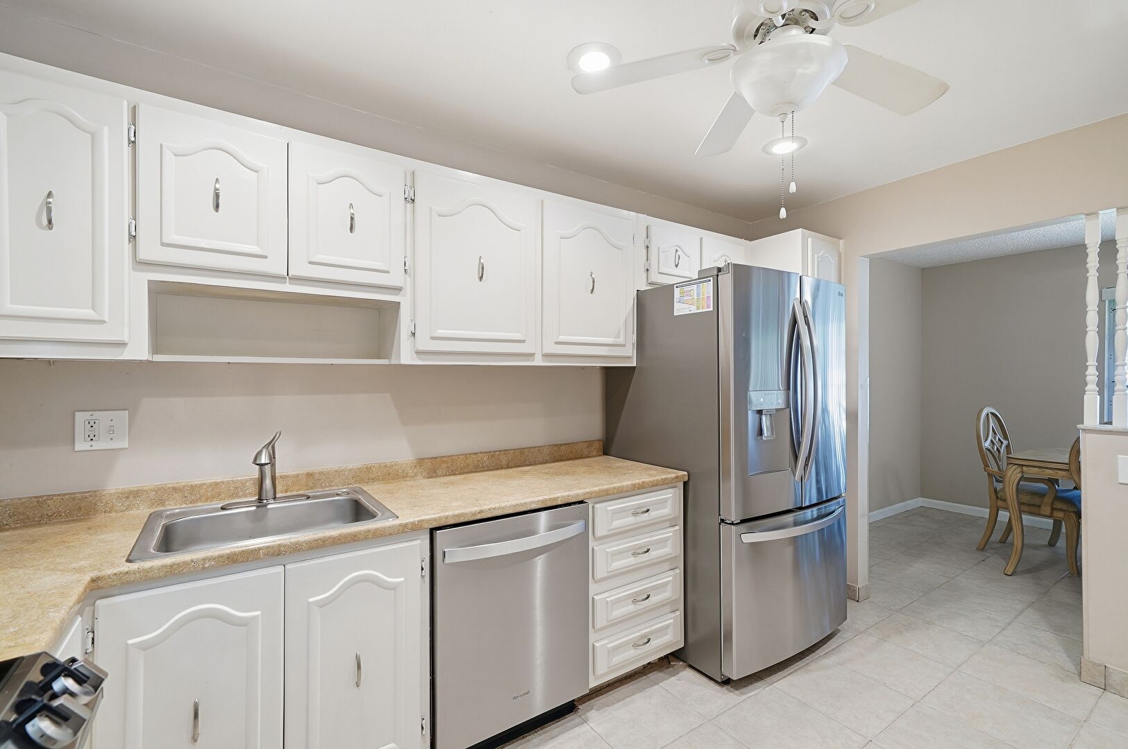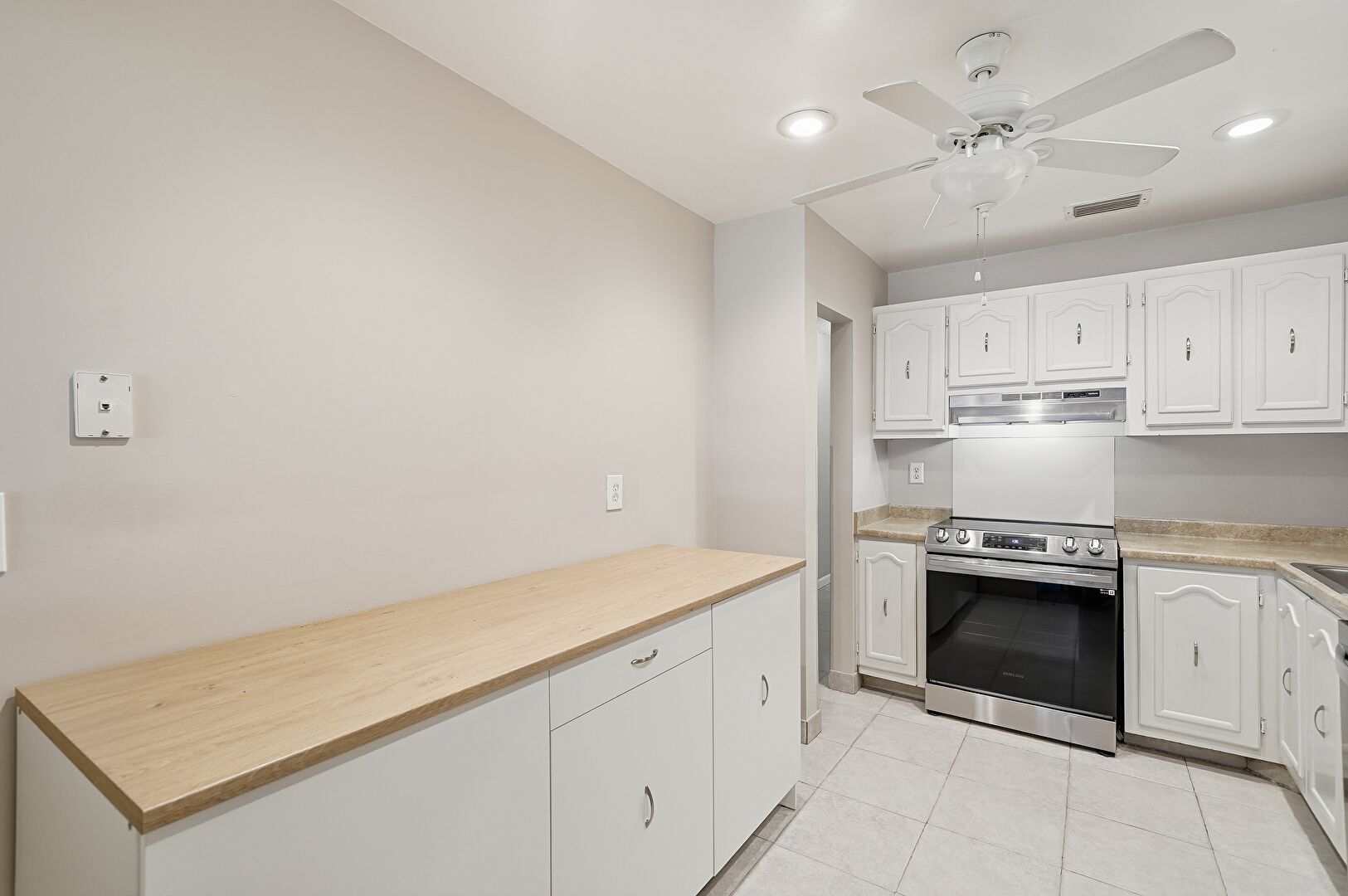 Arched Cabinets, Baseboards Wall, Butcher Block Countertops, Ceiling Fan, Drywall, Natural Light, Open Shelves, Recessed Lighting, Shaker Cabinets, Stone Countertops, Tile Floor, Vent, Visible Hinge Cabinets, Arched Cabinets, Ceiling Fan, Vent