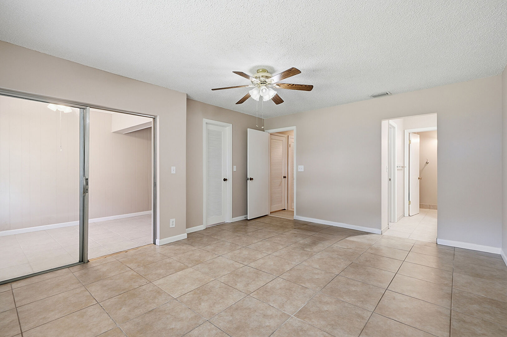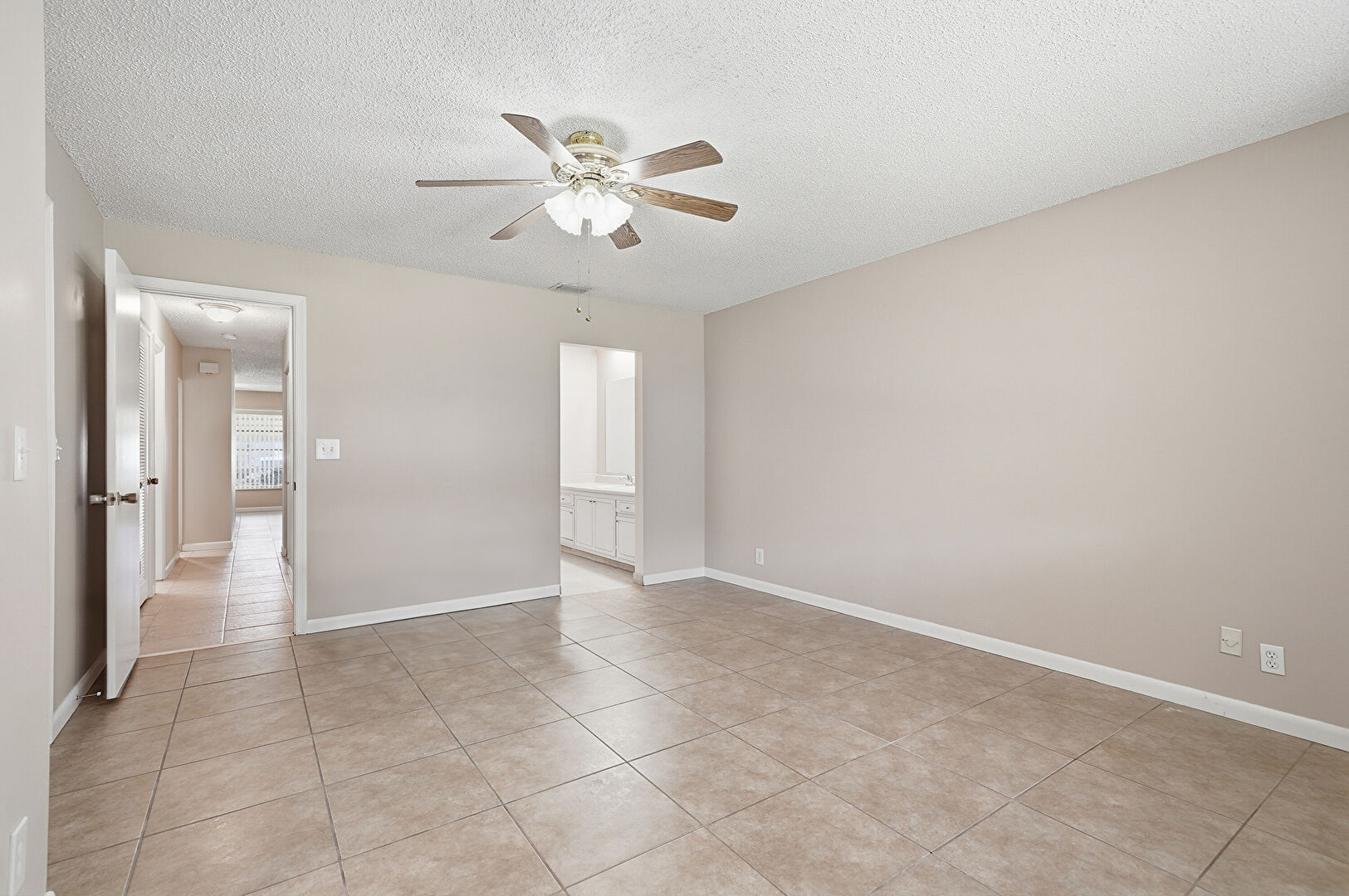 Baseboards Wall, Ceiling Fan, Drywall, Ensuite Bathroom, Natural Light, Textured Ceiling, Tile Floor, Two Closets, Vent, Baseboards Wall, Ceiling Fan, Vent